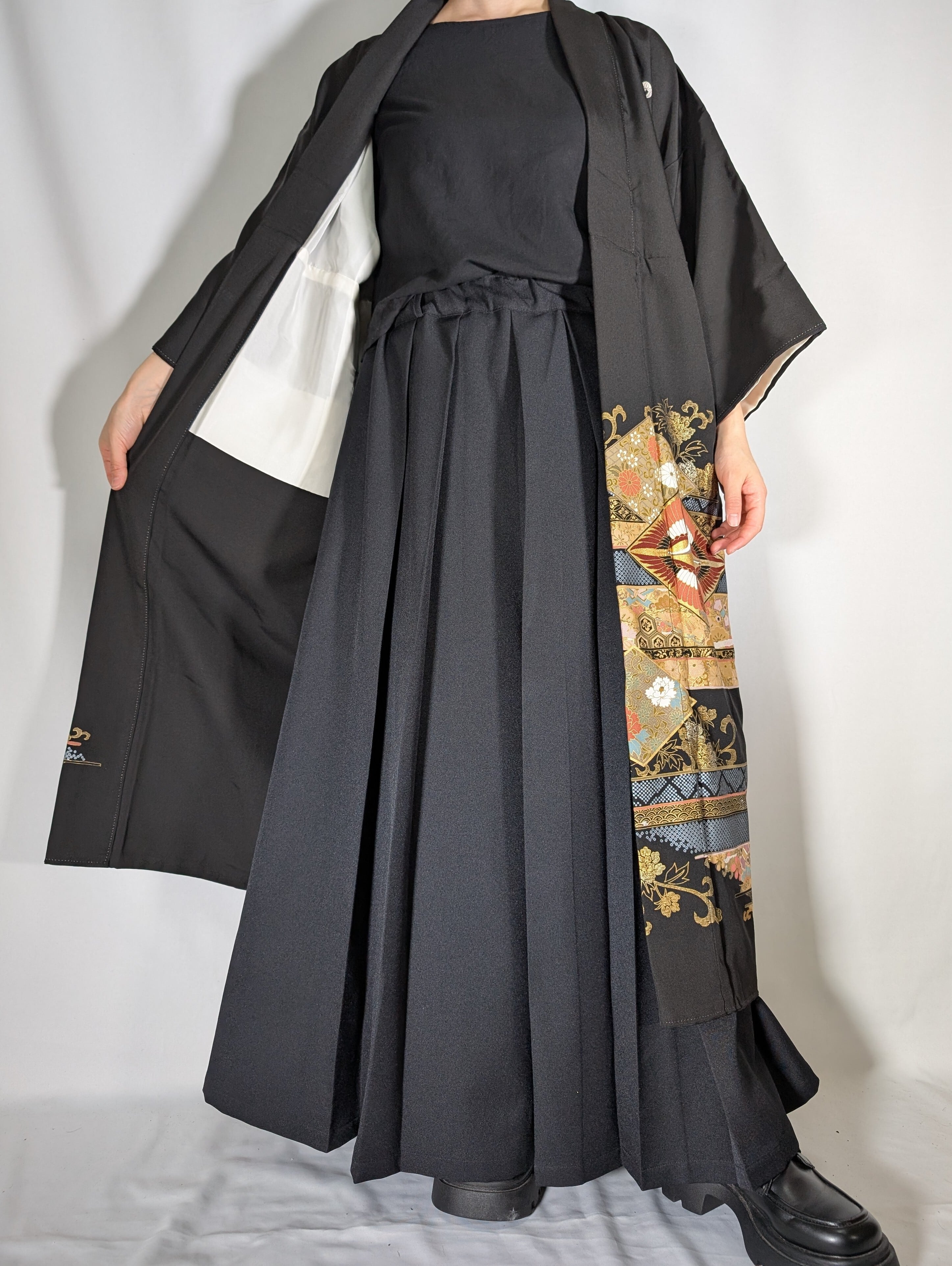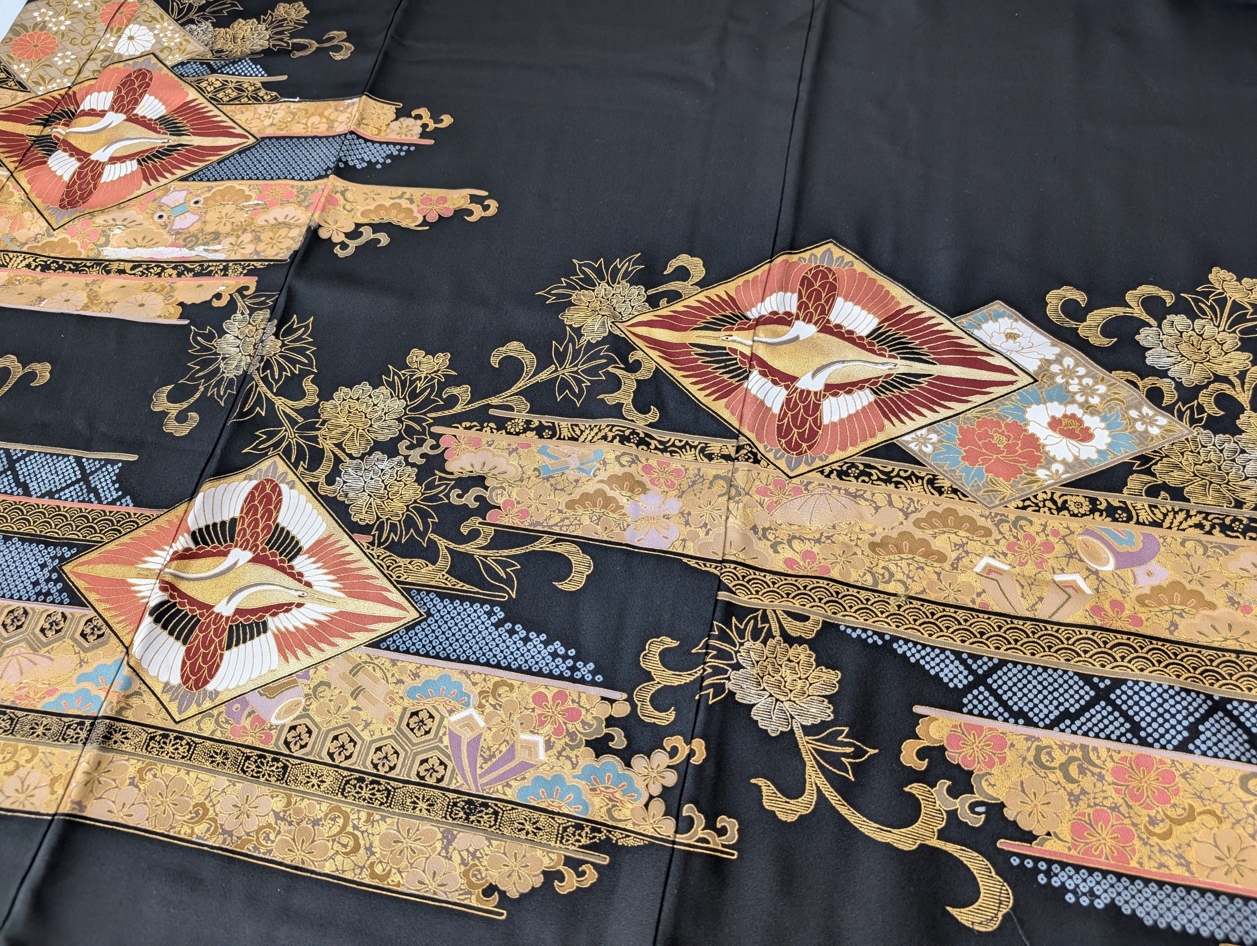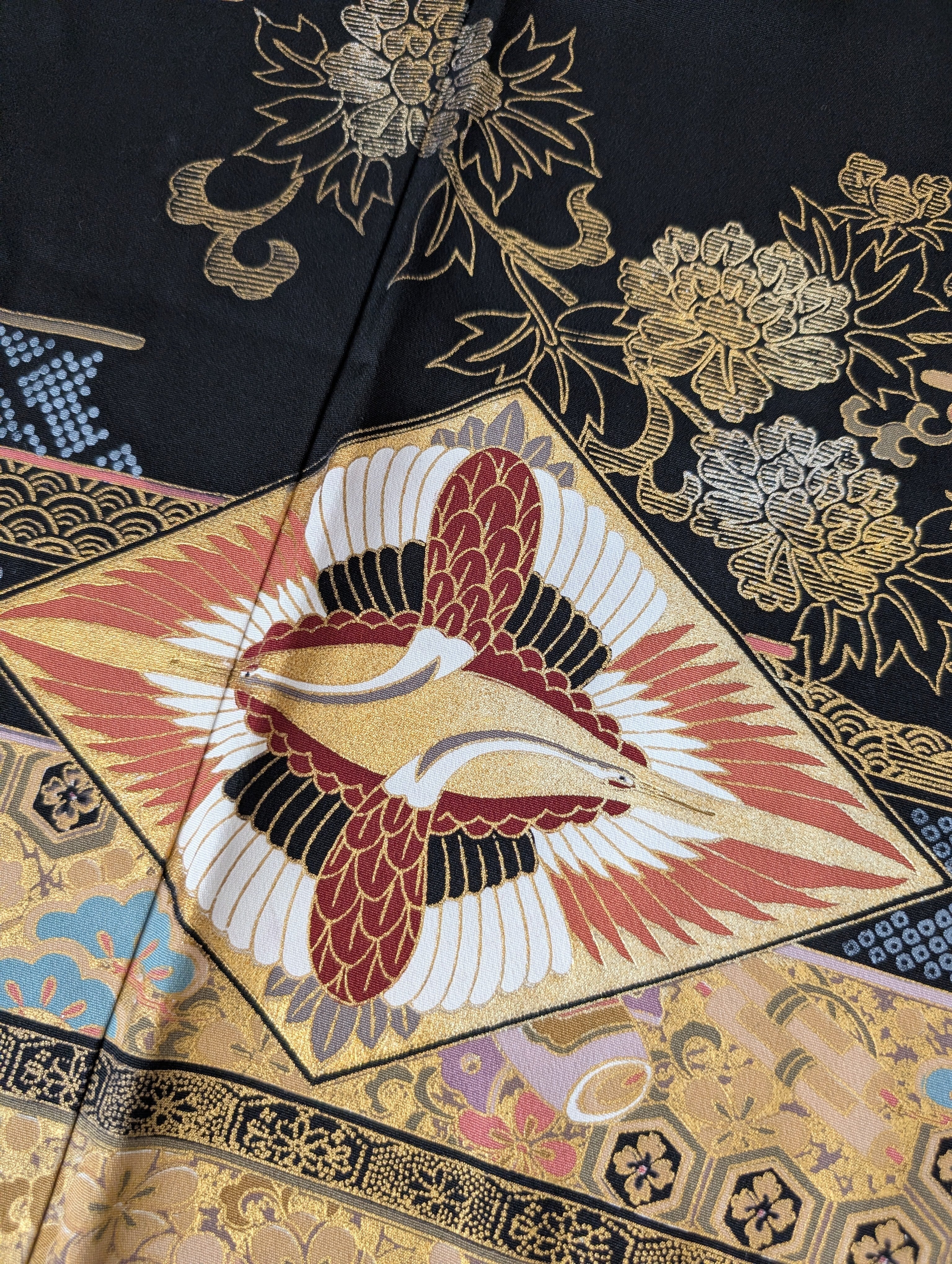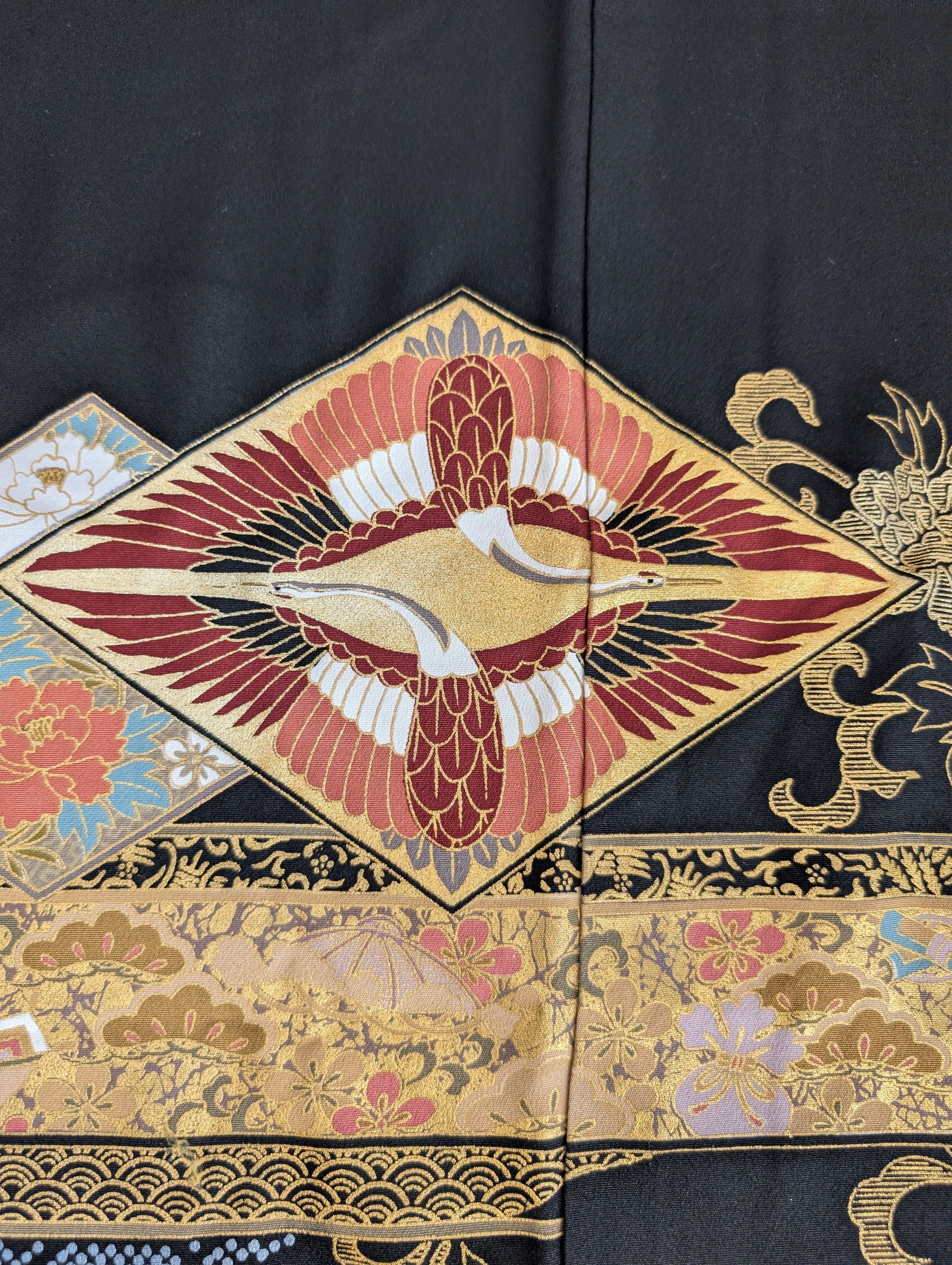 【14484】 着物リメイク 黒留袖 向鶴 ロングコート kimono tomesode remake long coat black