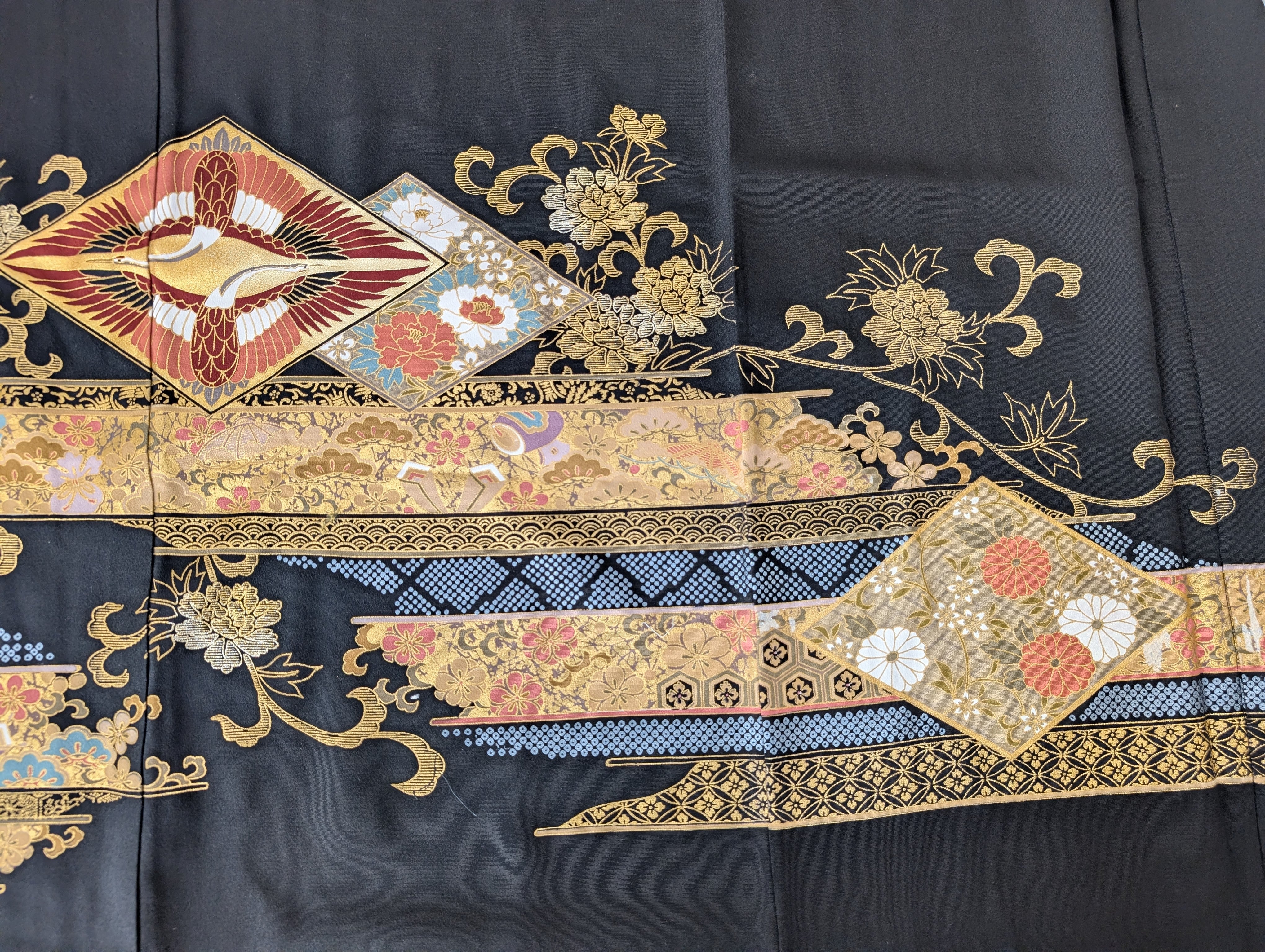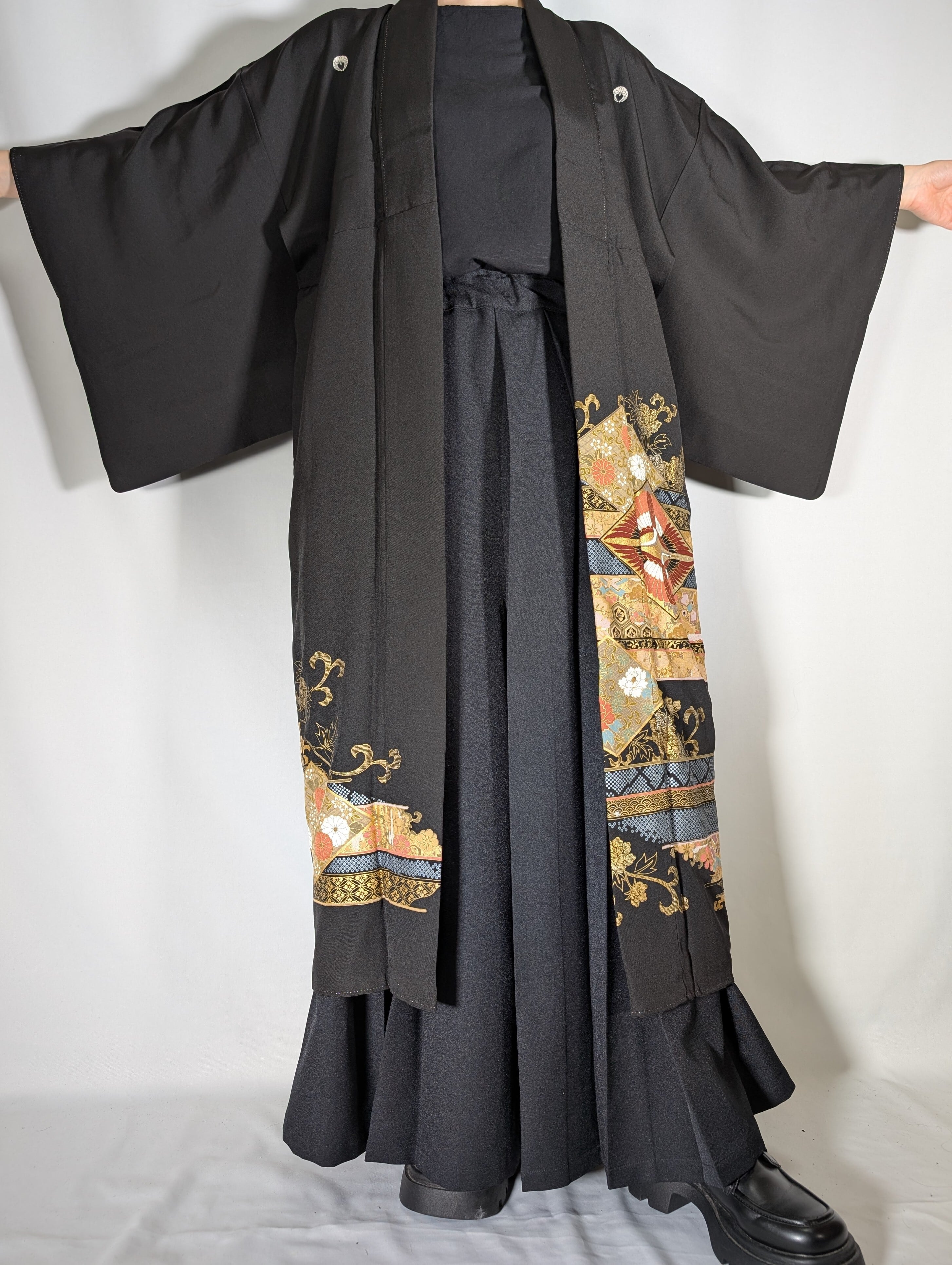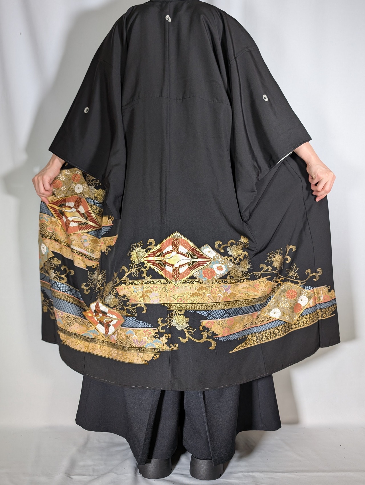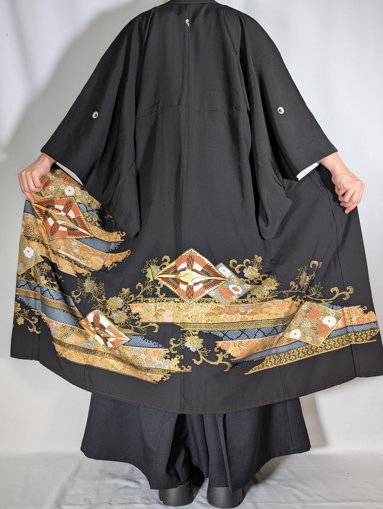 【14484】 着物リメイク 黒留袖 向鶴 ロングコート kimono tomesode remake long coat black