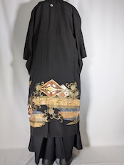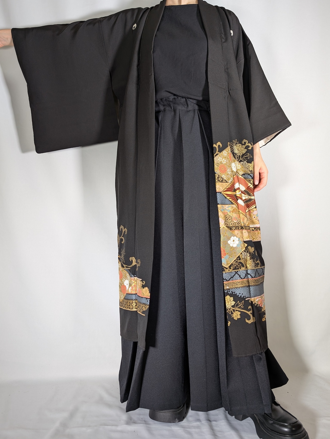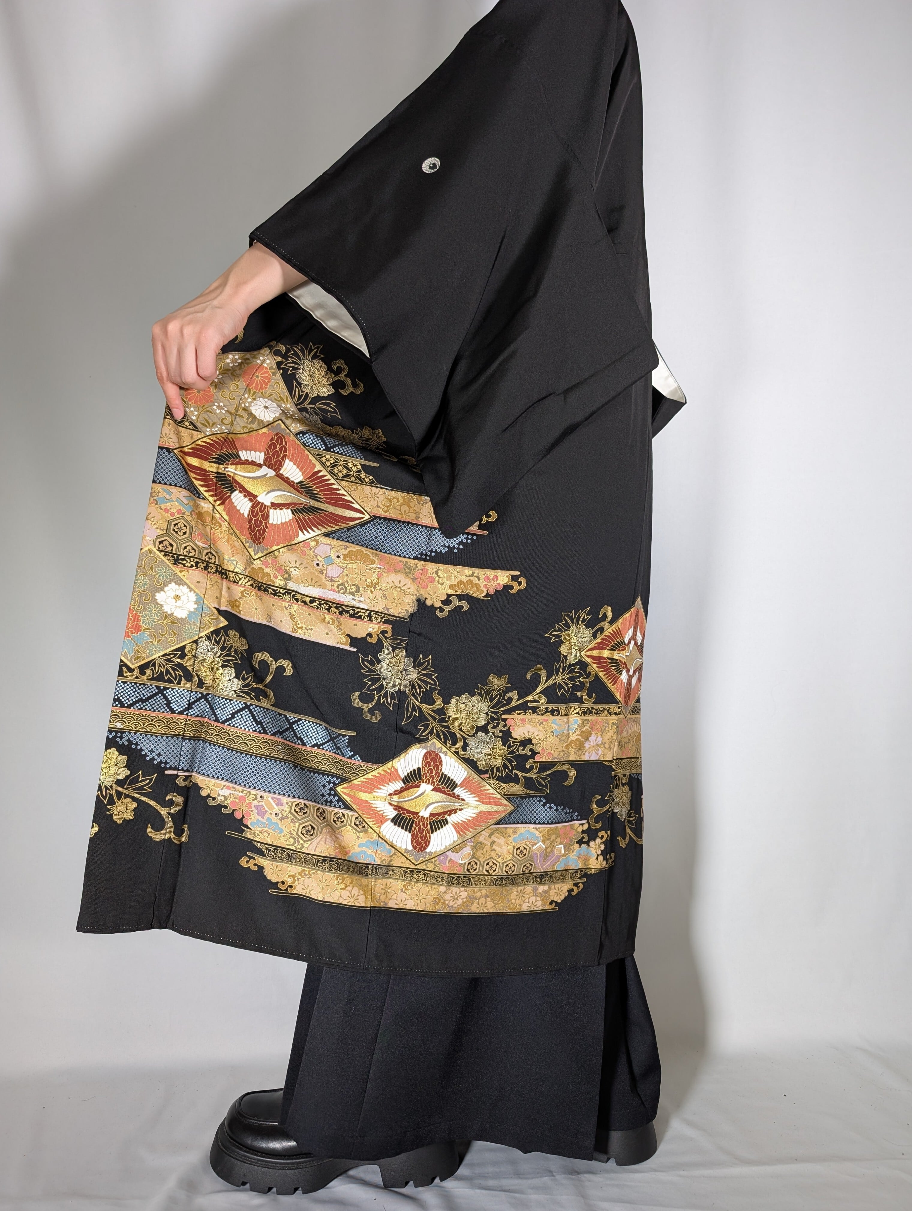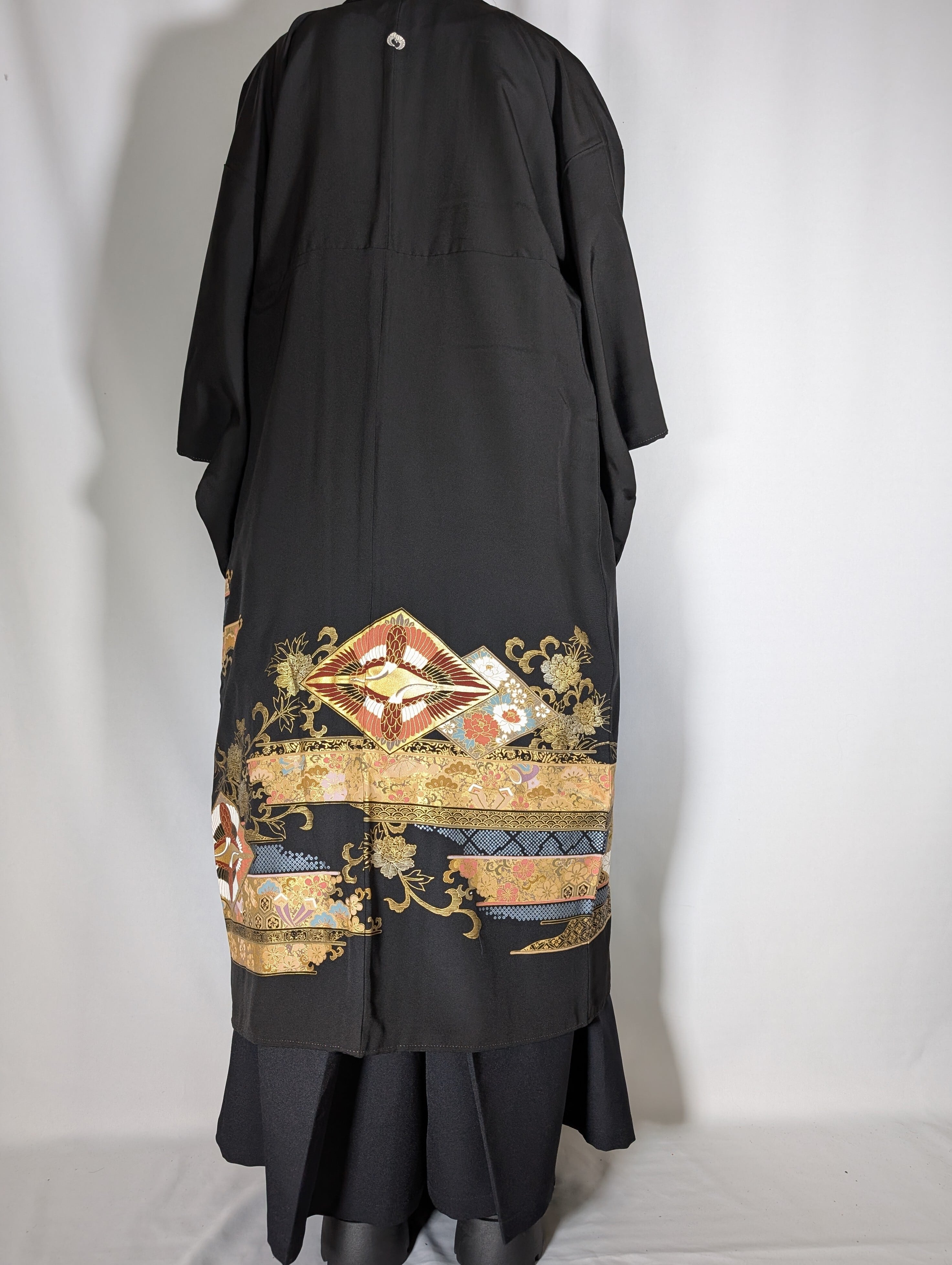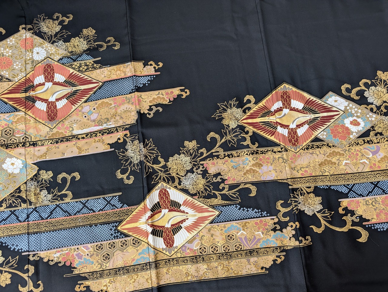【14484】 着物リメイク 黒留袖 向鶴 ロングコート kimono tomesode remake long coat black