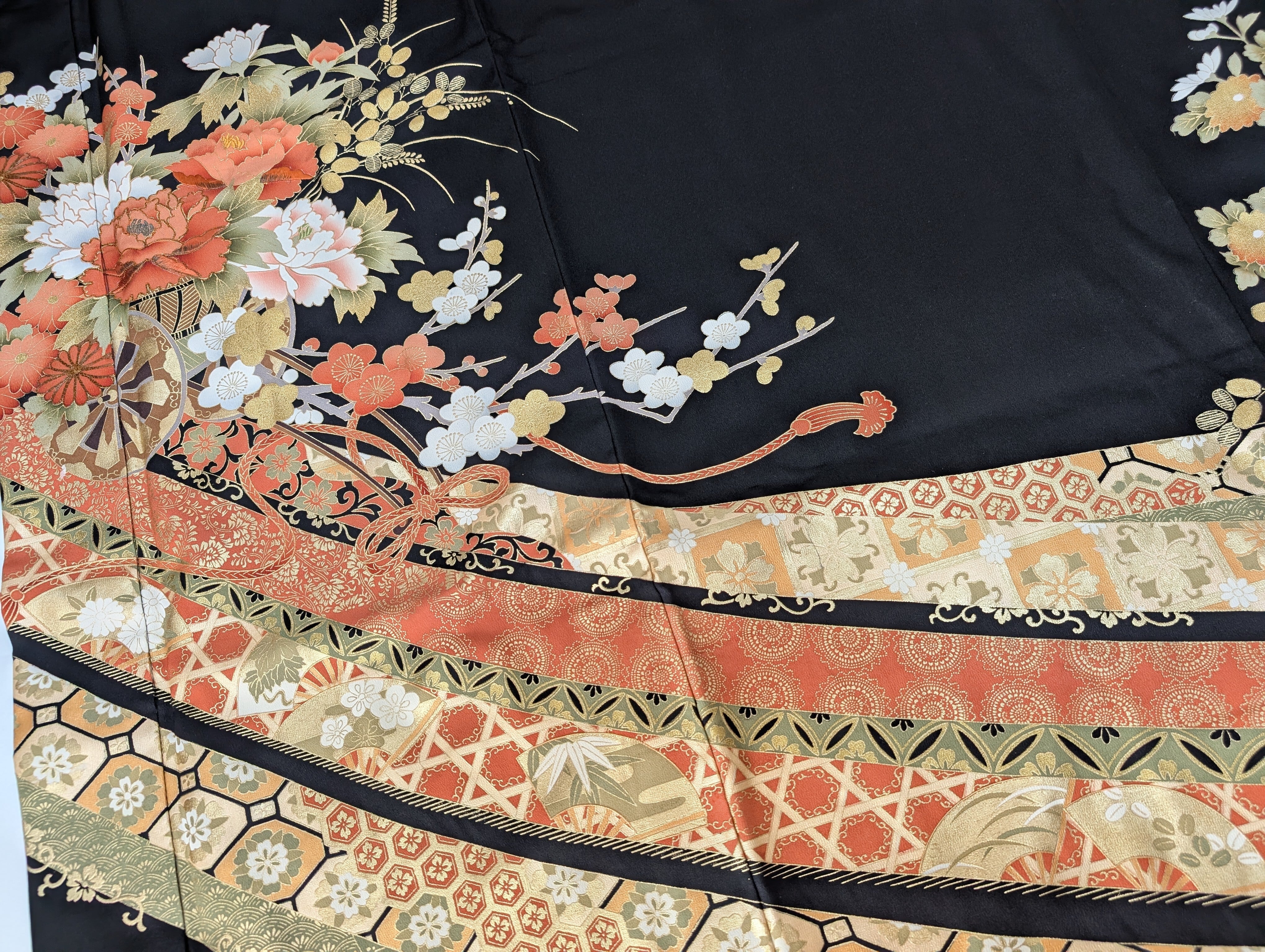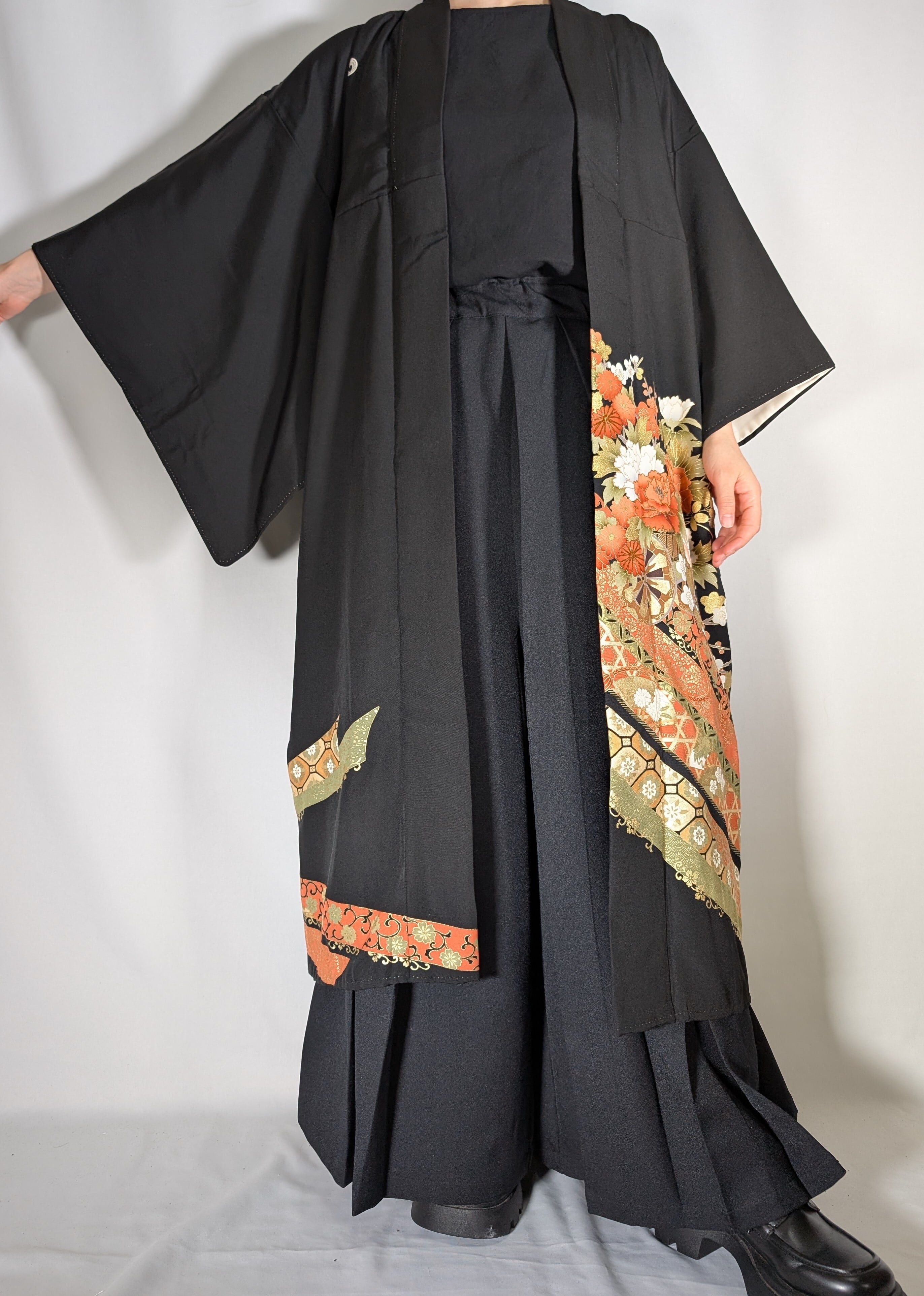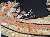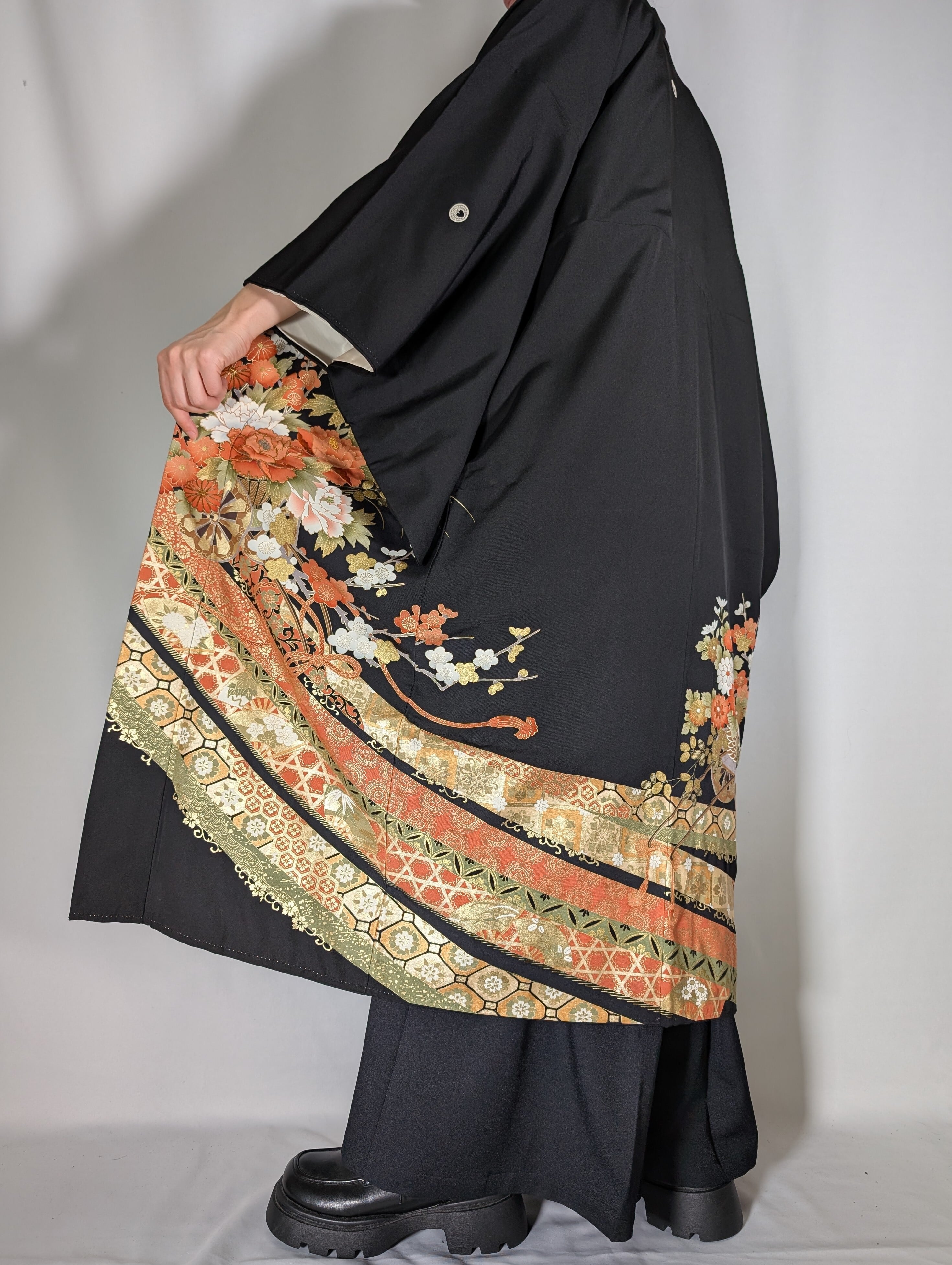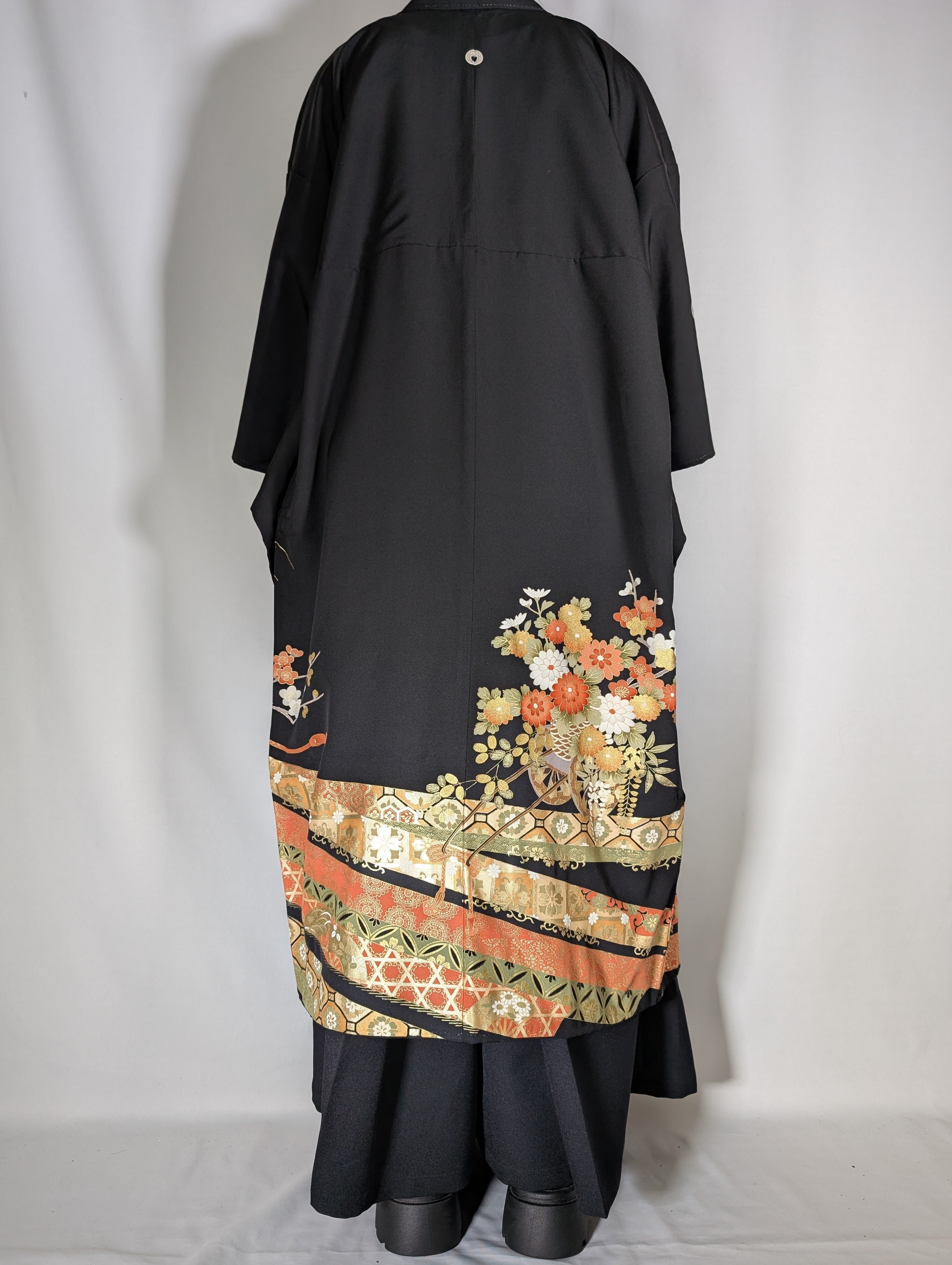 【14486】 着物リメイク 黒留袖 花車模様 牡丹 菊 梅 kimono tomesode remake long coat black