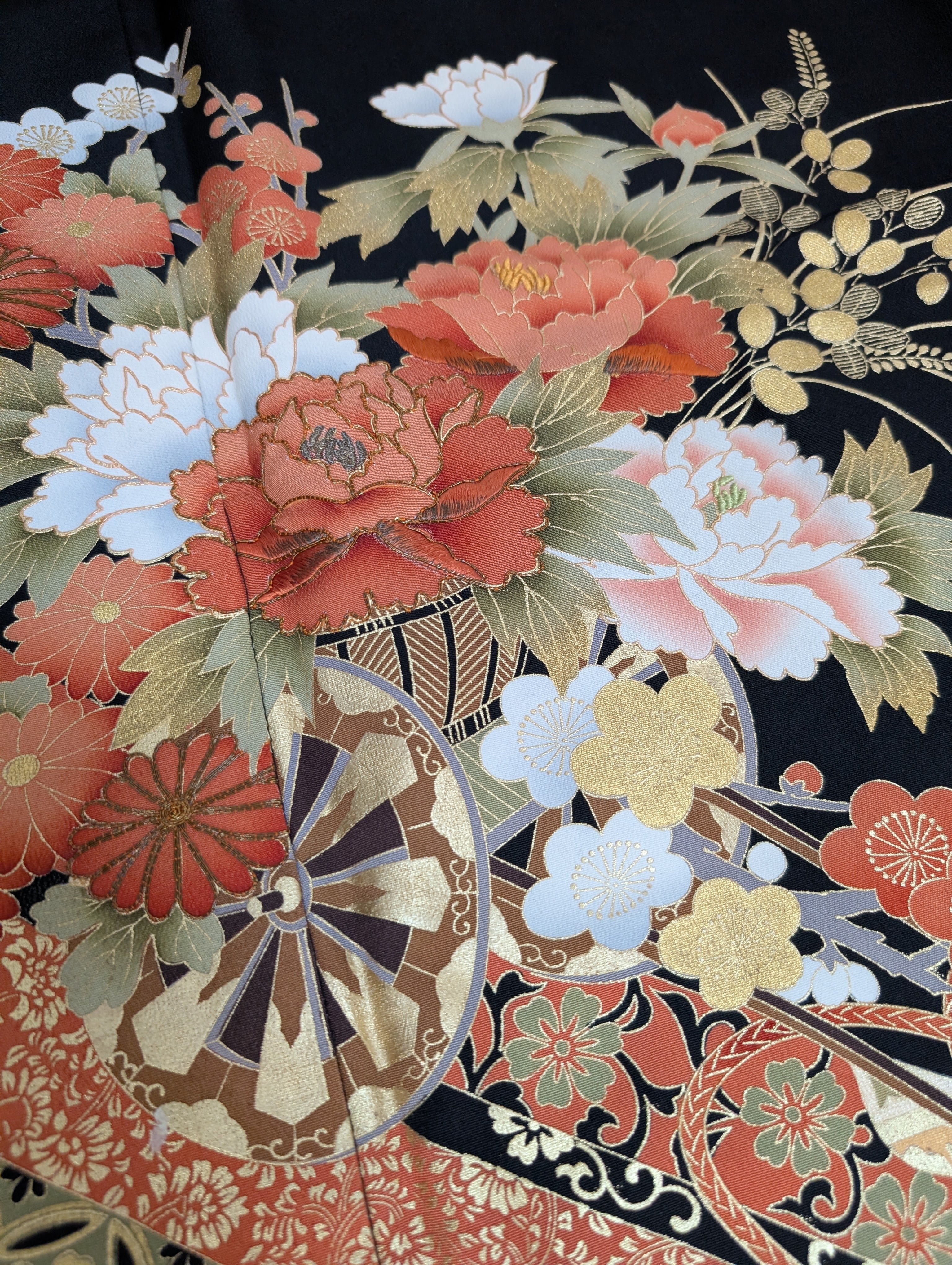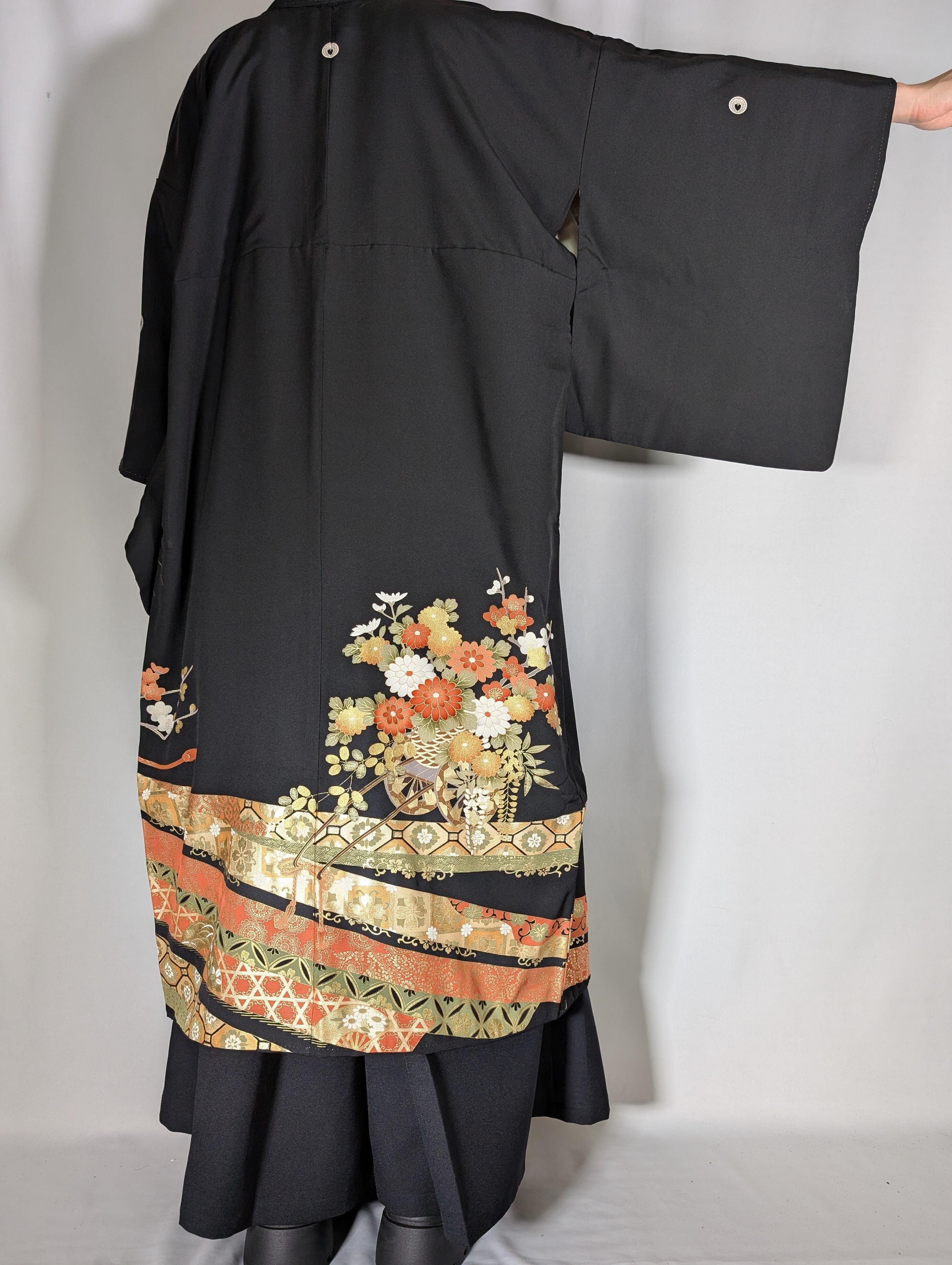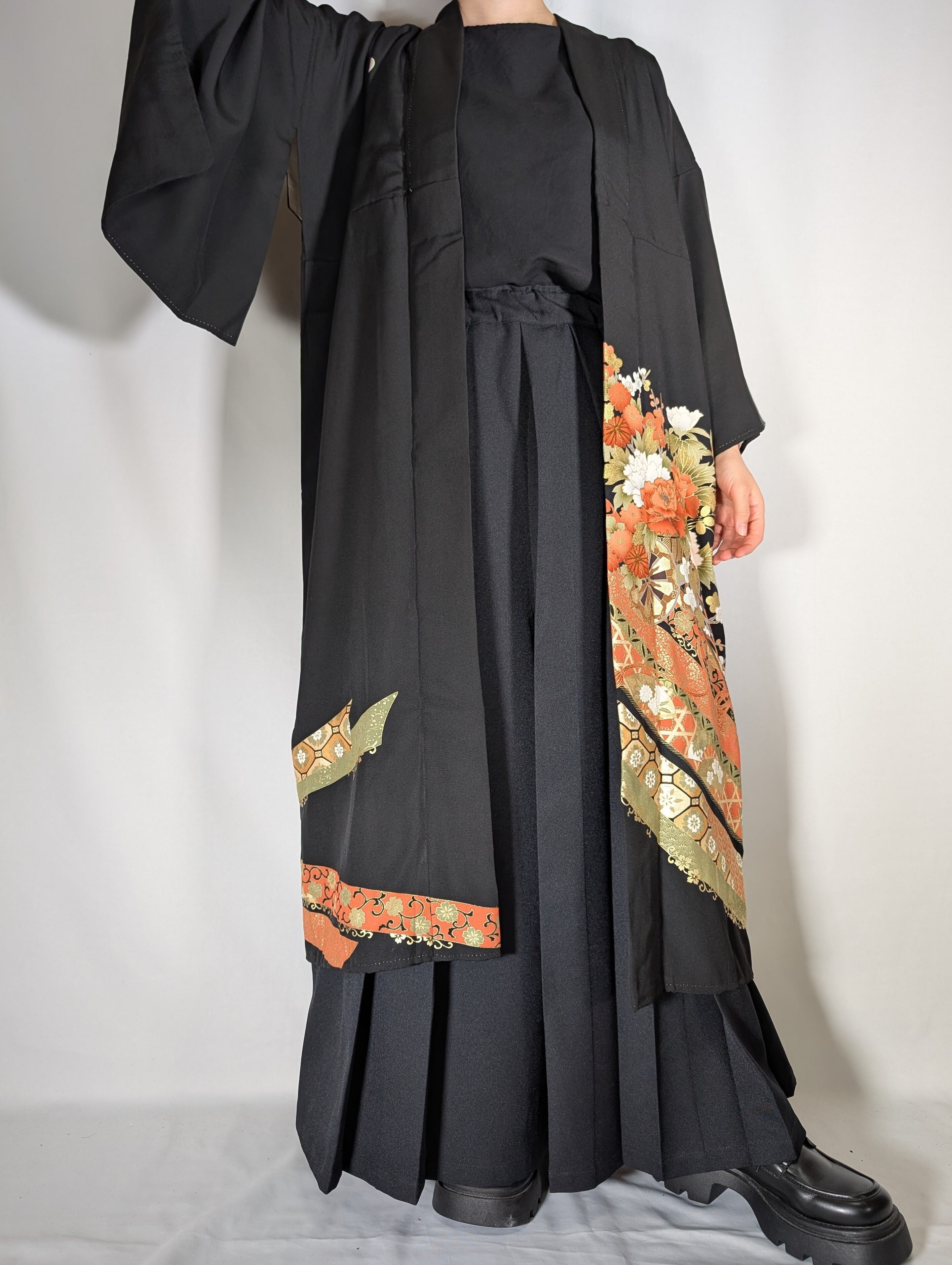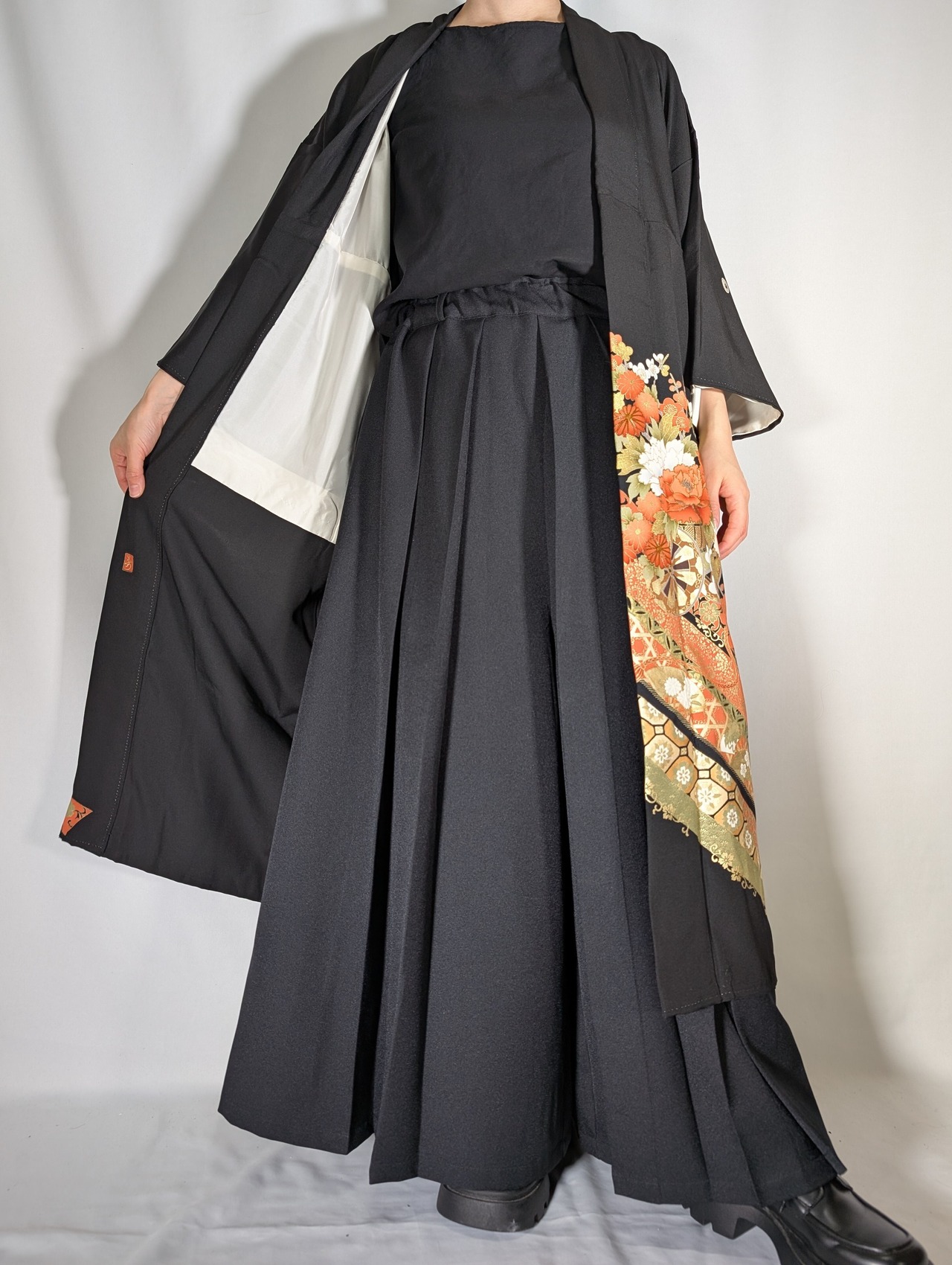 【14486】 着物リメイク 黒留袖 花車模様 牡丹 菊 梅 kimono tomesode remake long coat black