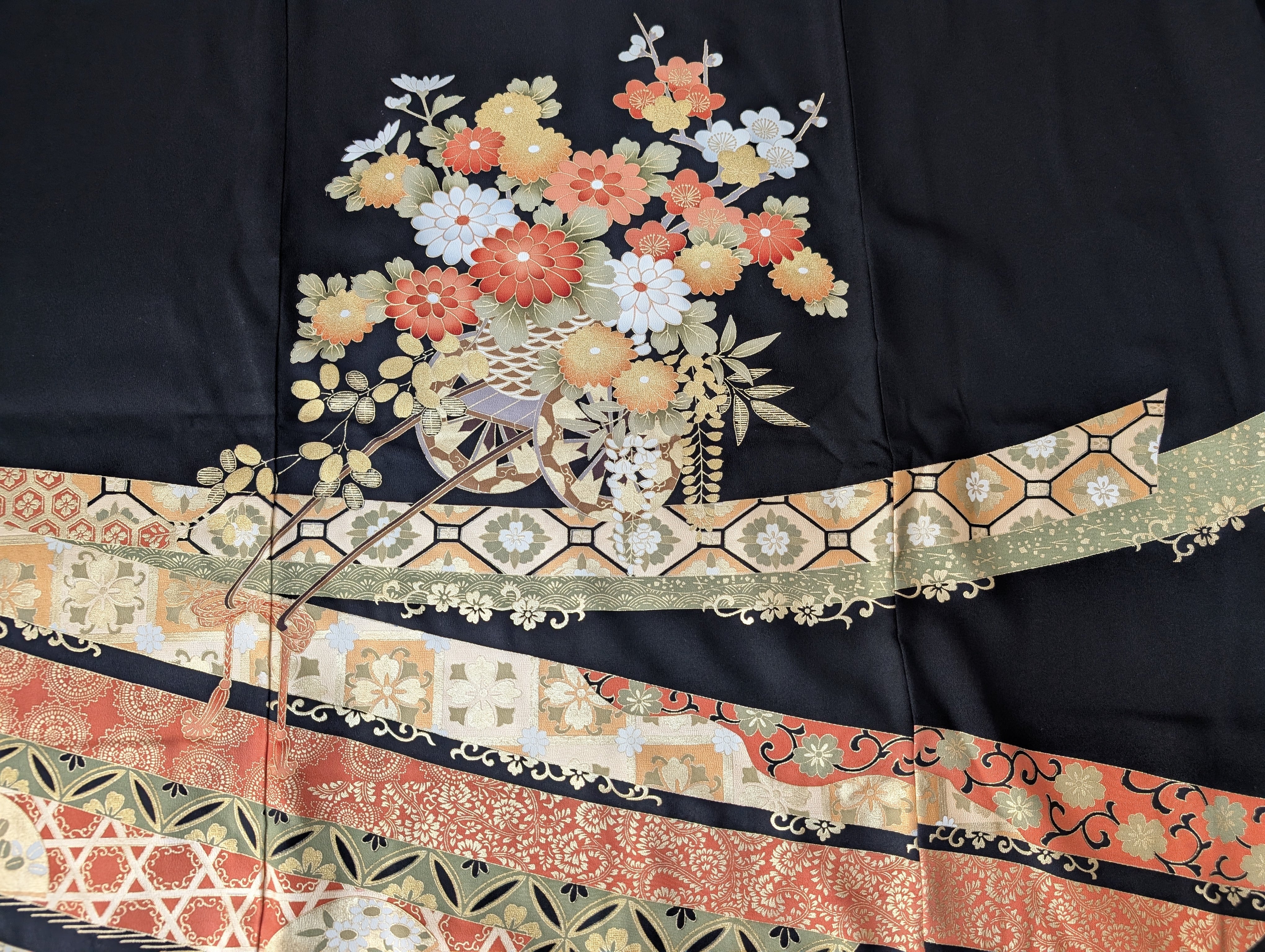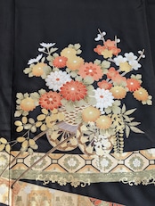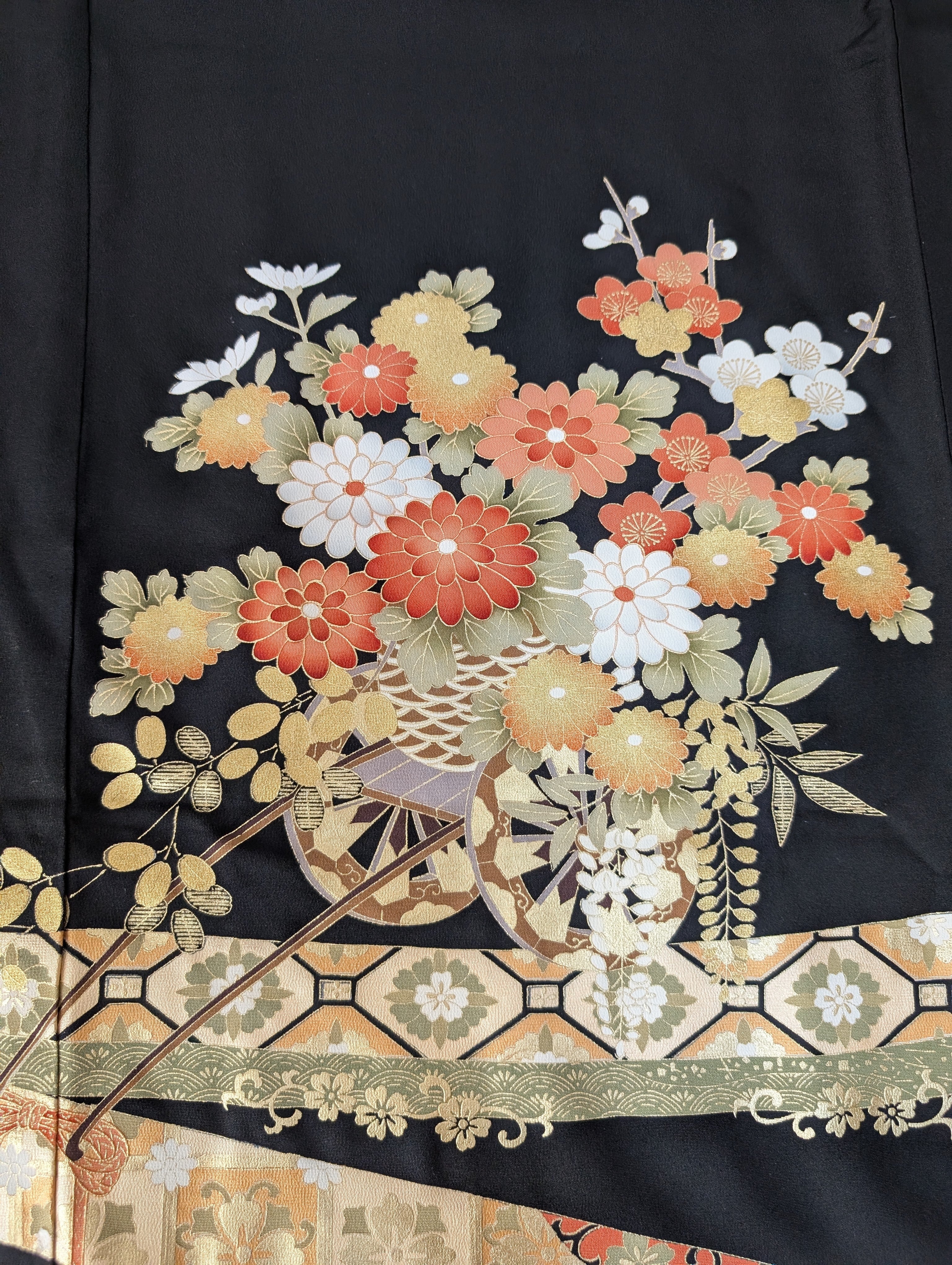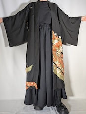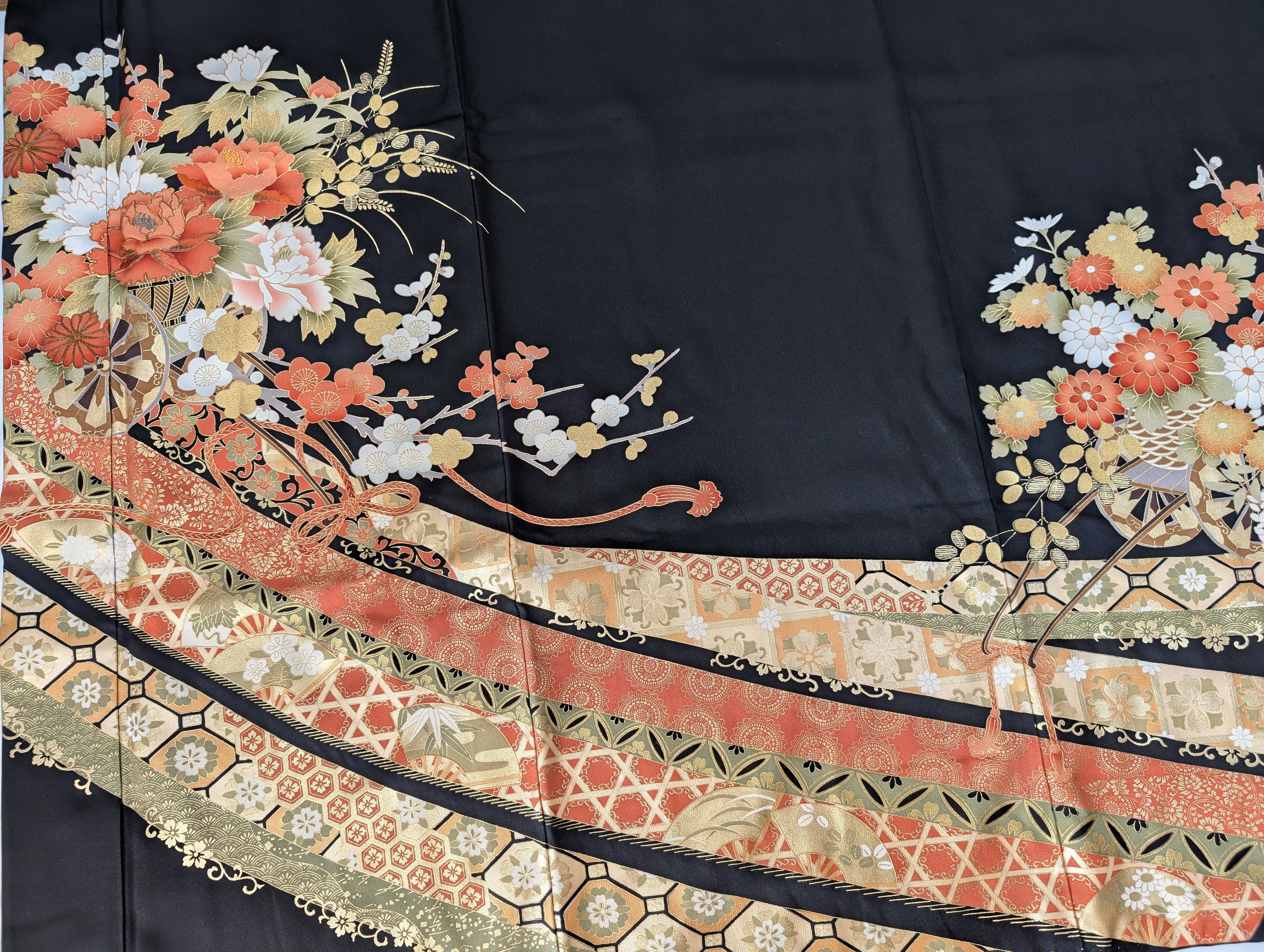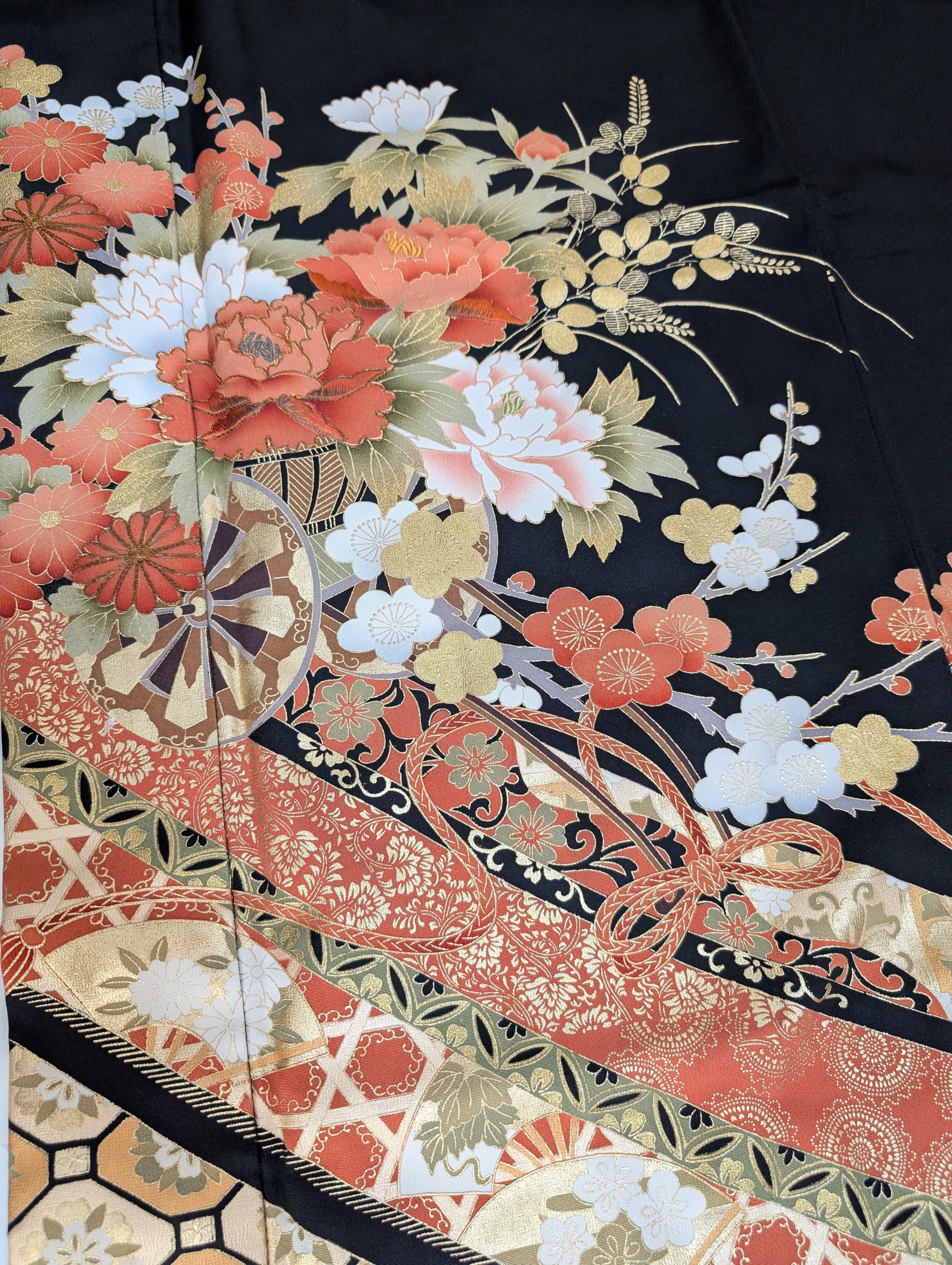 【14486】 着物リメイク 黒留袖 花車模様 牡丹 菊 梅 kimono tomesode remake long coat black