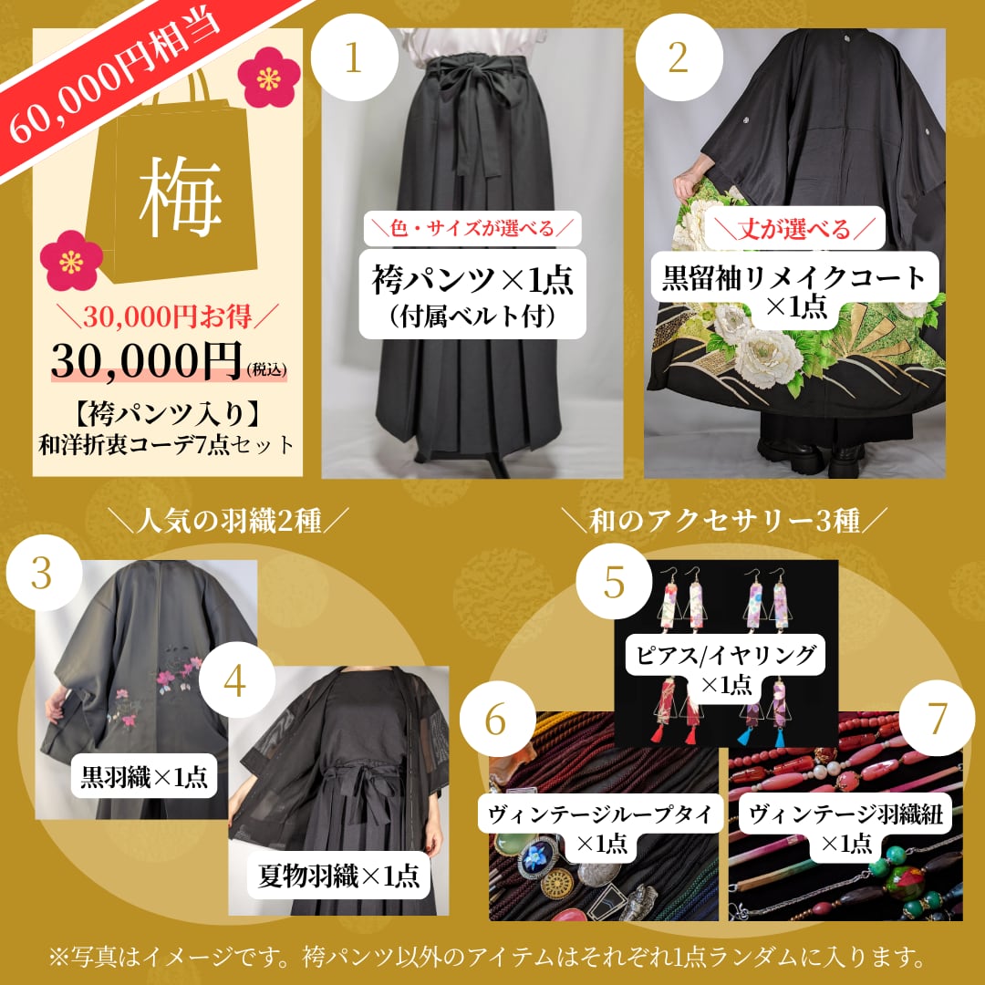 そんな袴パンツや黒留袖リメイクコートを、特別価格でお楽しみいただける豪華福袋です。
