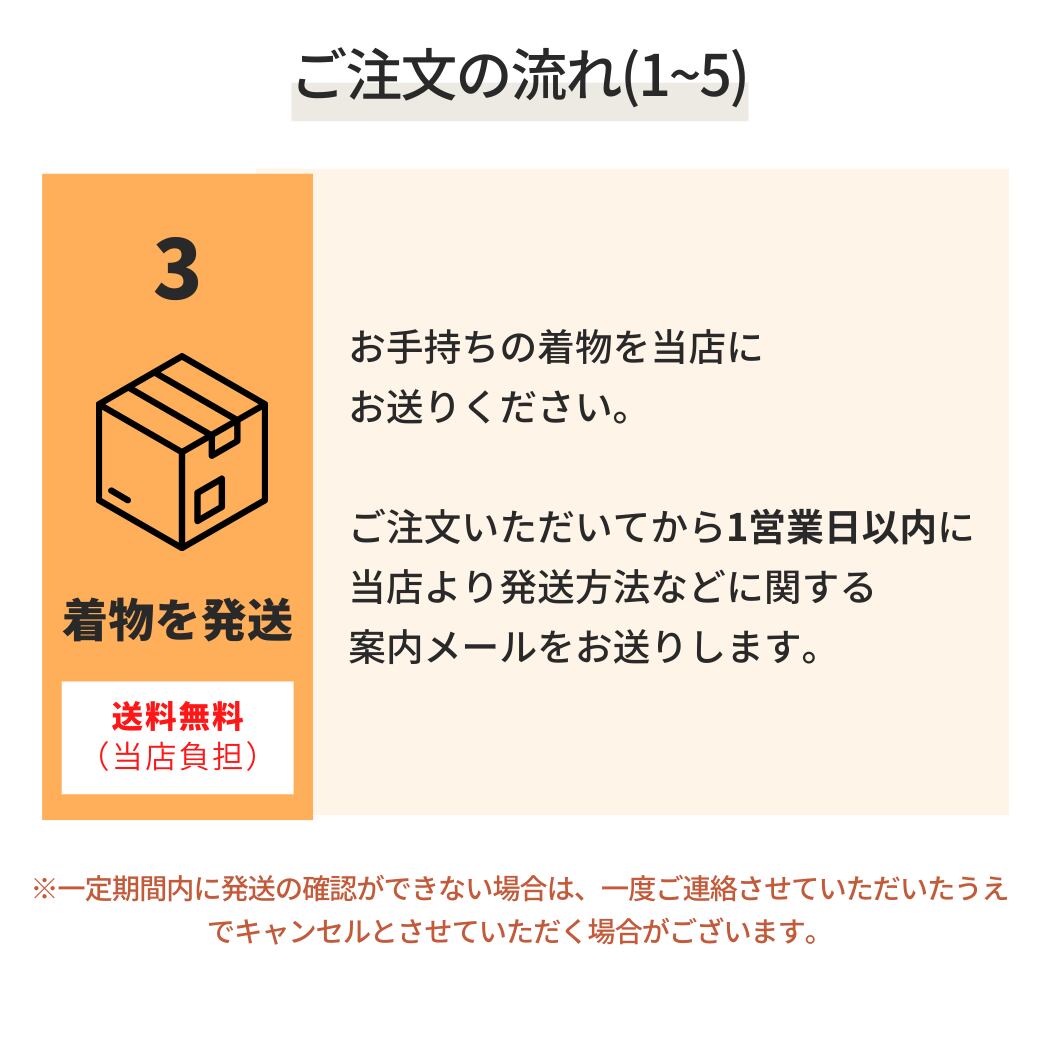 ※今回オーダーご希望の場合は、お着物は【2月28日】までに必着でお送りいただけますと幸いです。なお、発送方法についてはお見積・ご注文後のご案内となります。