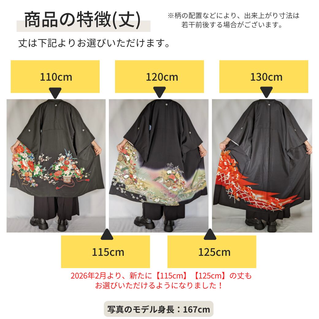 ・基本的に柄が切れないように製作しておりますが、着物の種類によっては一部柄が切れてしまう場合がございます。また、柄の配置により出来上がり寸法は若干前後する場合がございます。