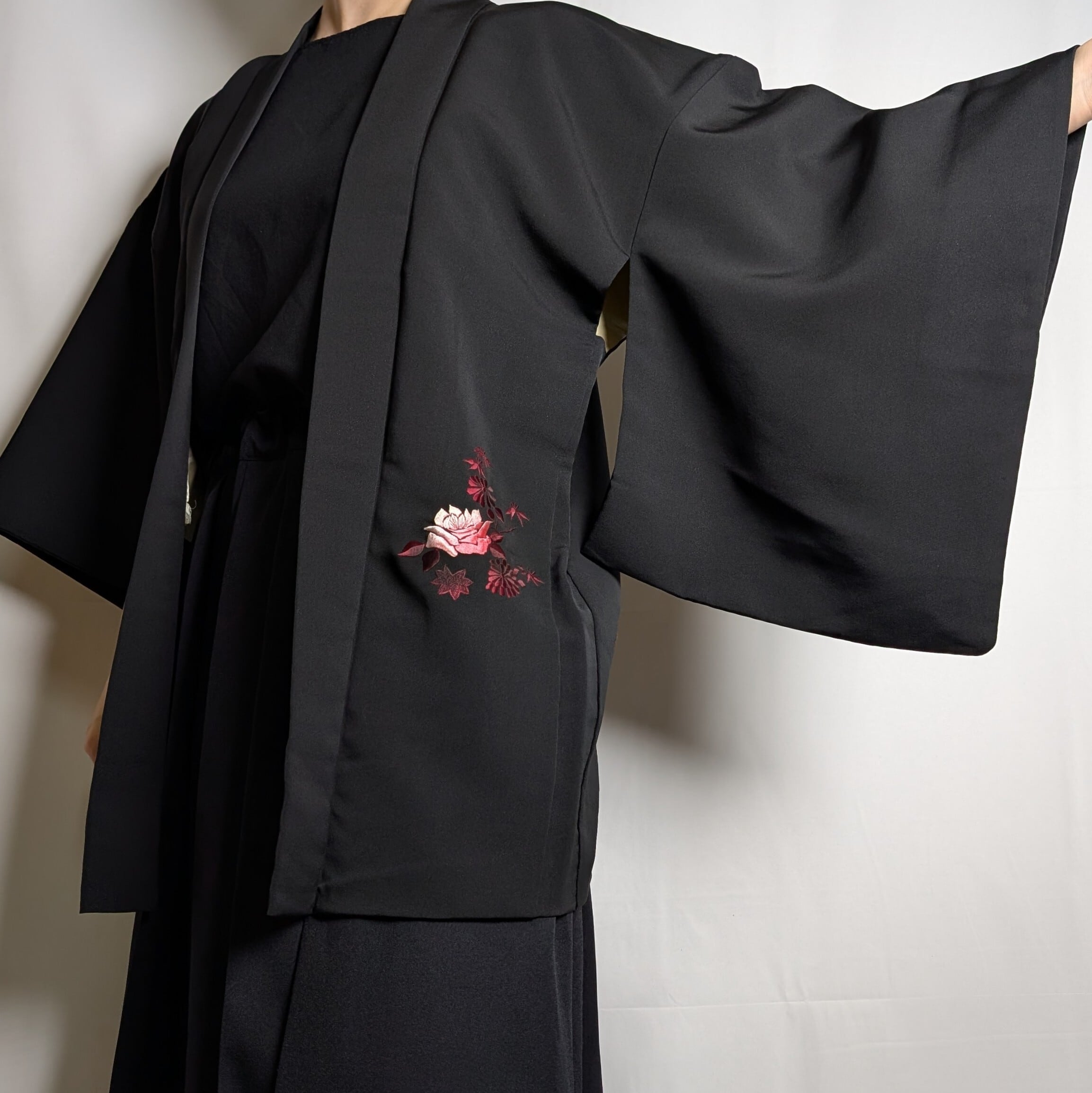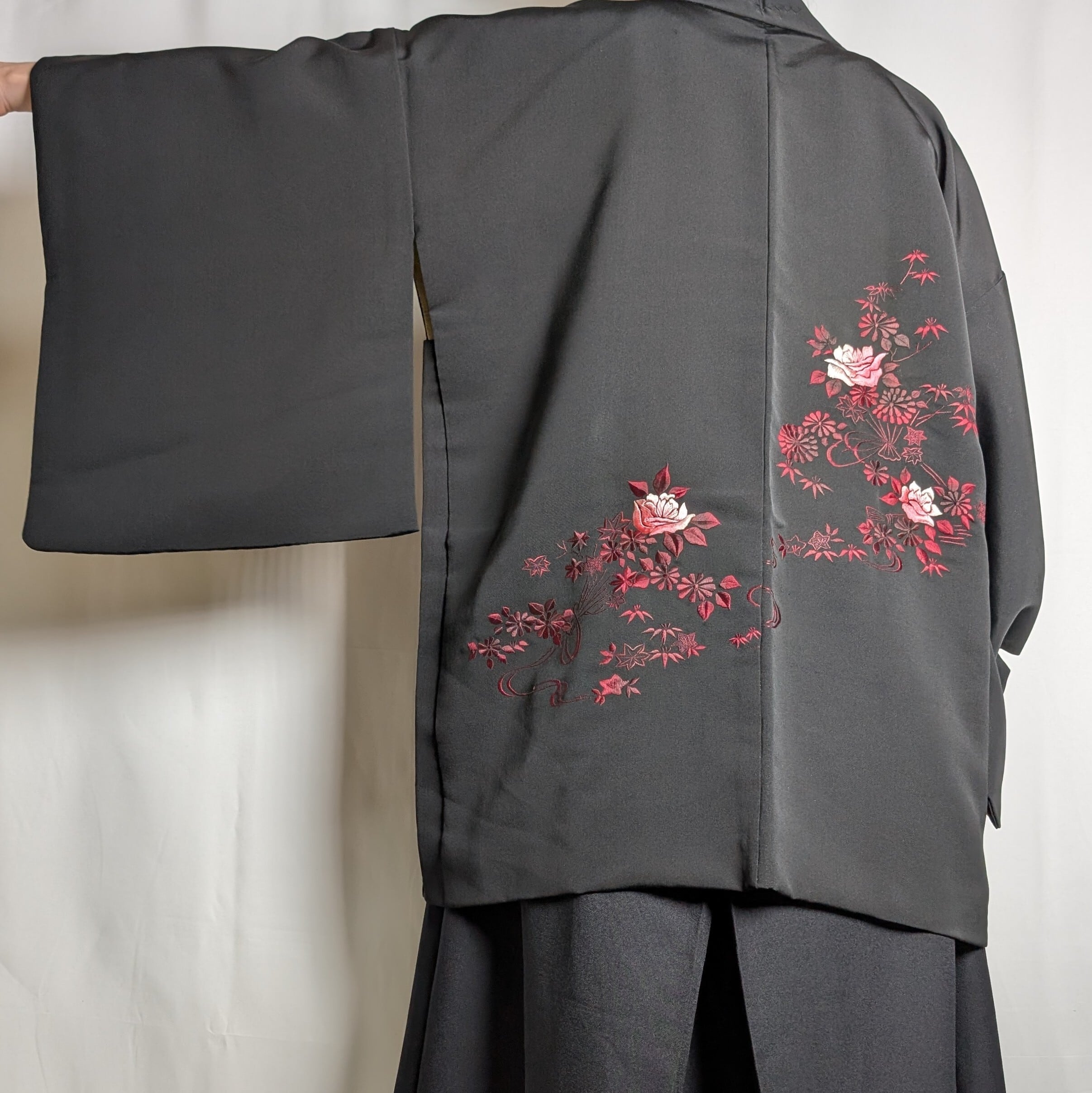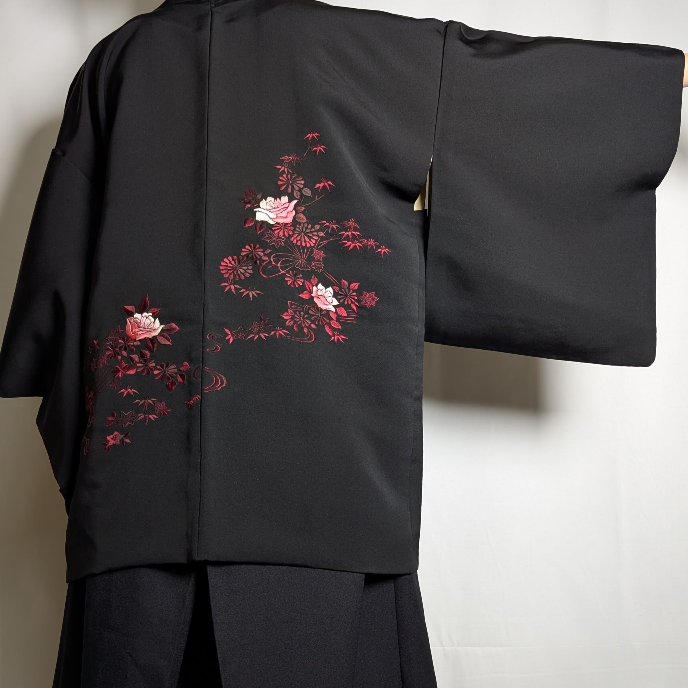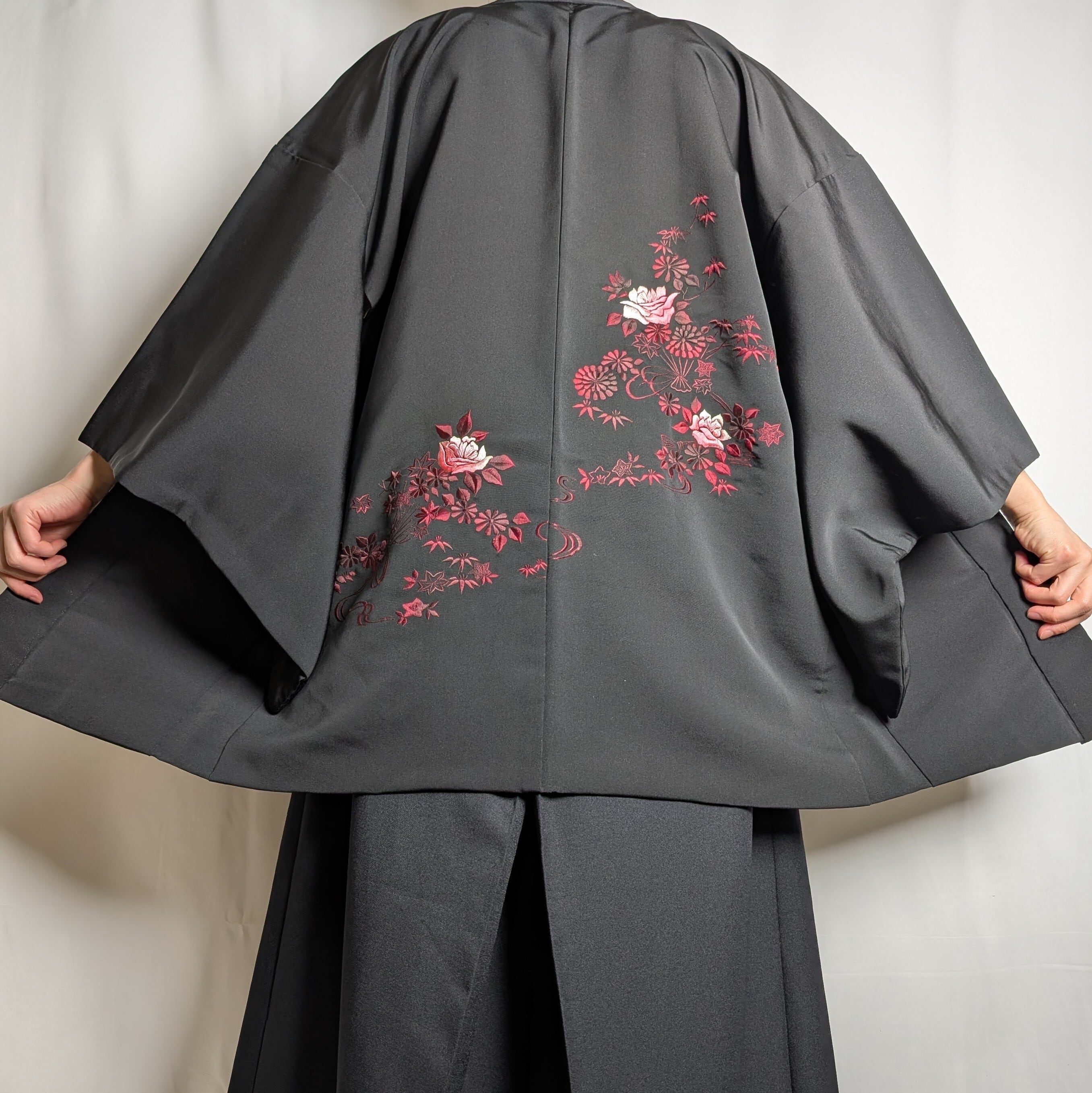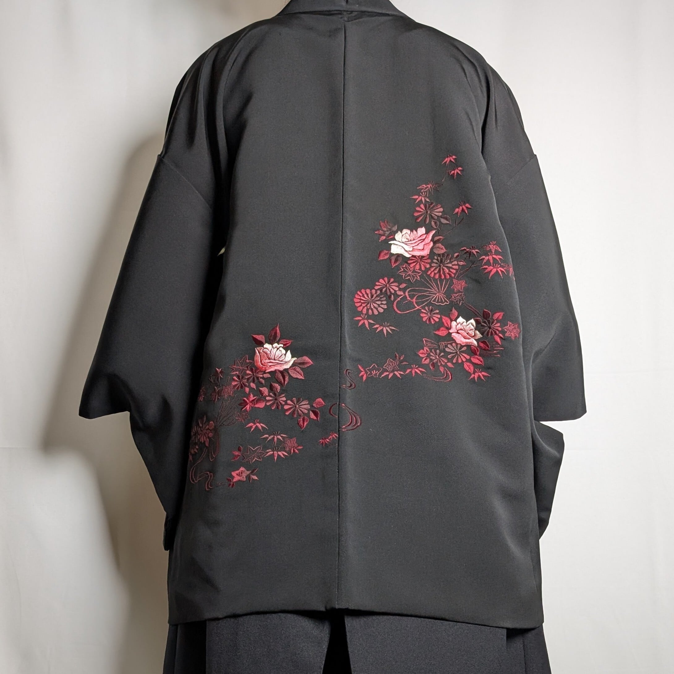 【14499】 ヴィンテージ 黒羽織 刺繍 花束模様 薔薇 菊 紅葉 ピンク 和洋折衷コーデ / Japanese vintage kimono black haori jacket