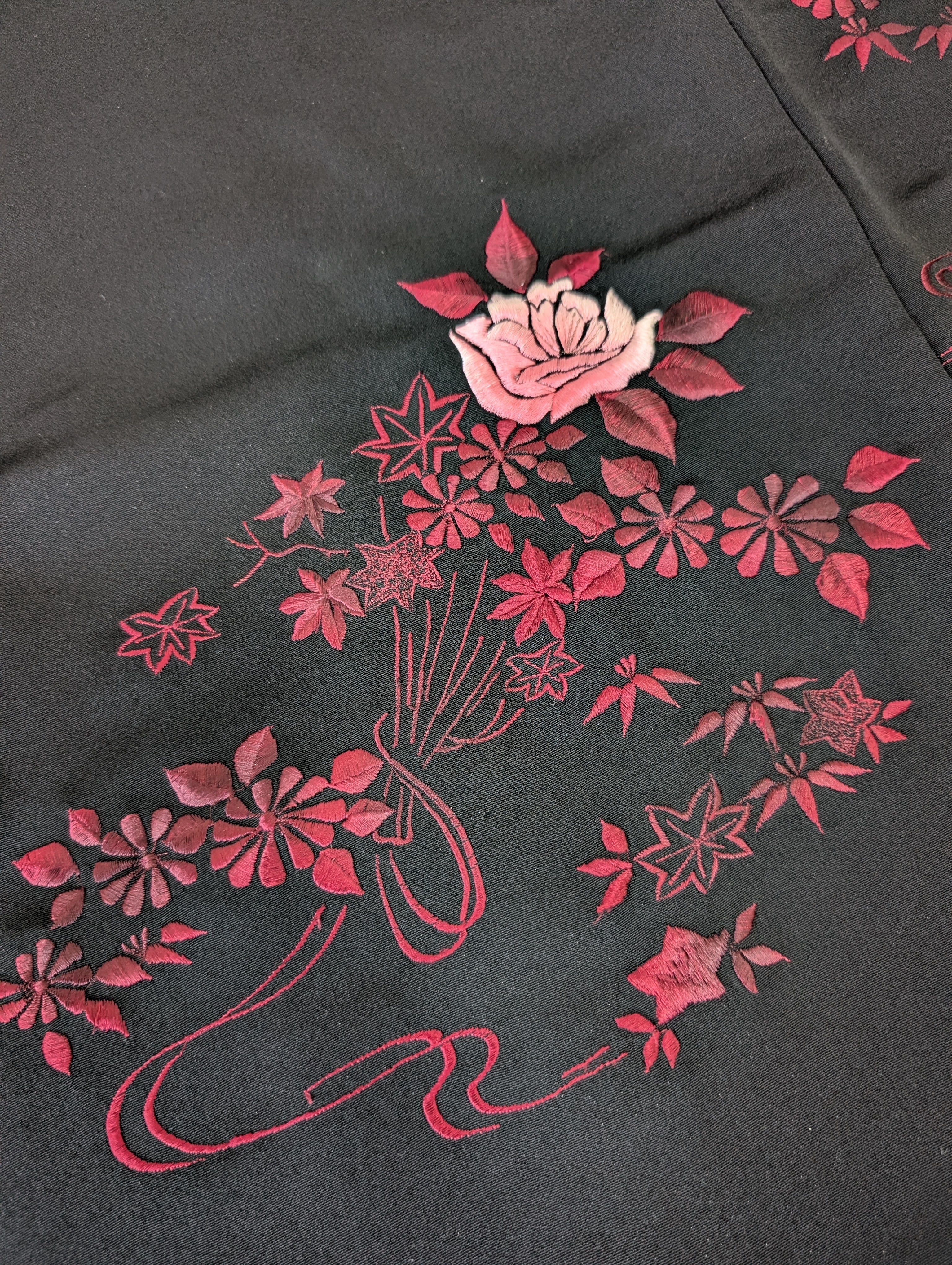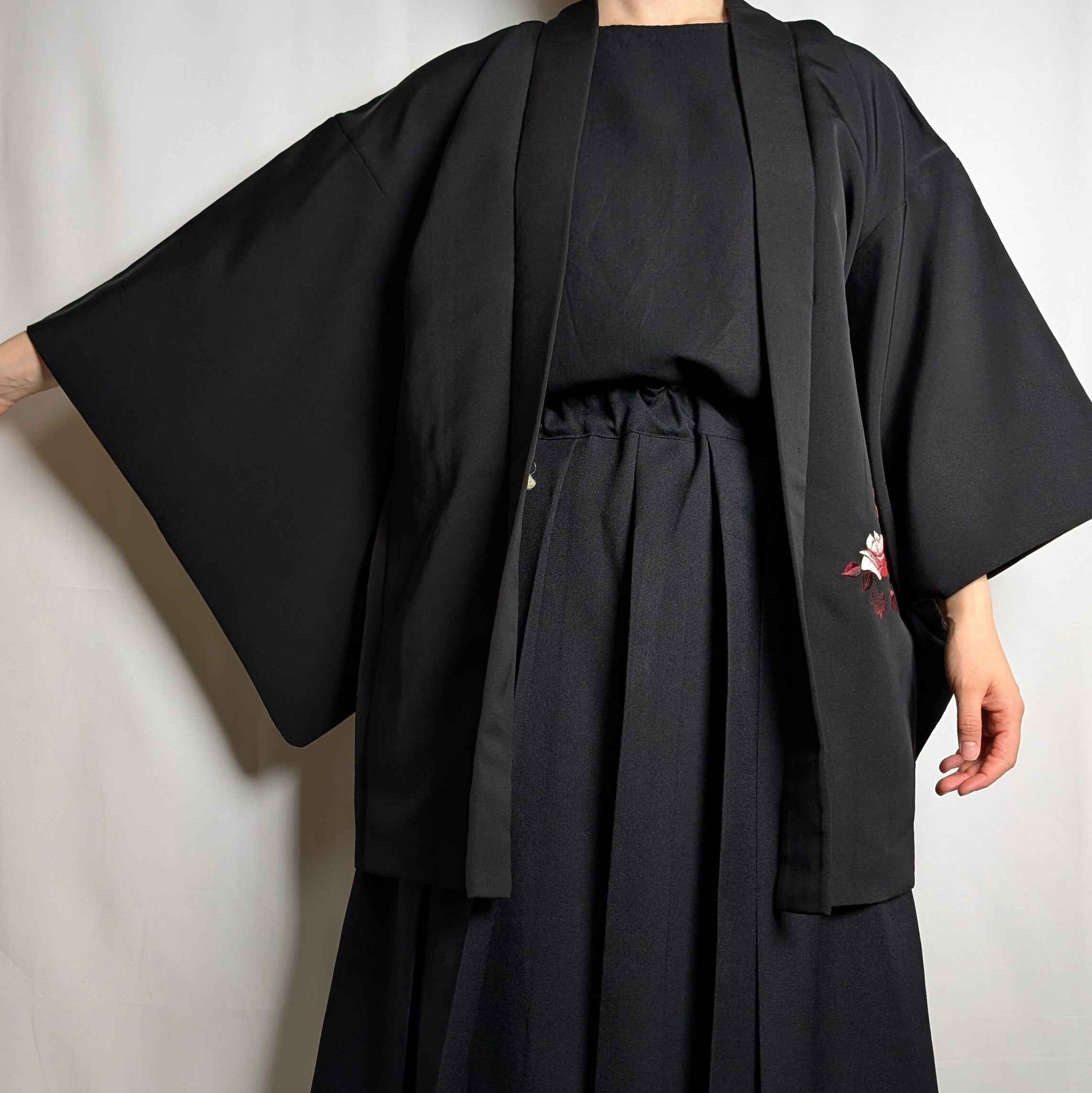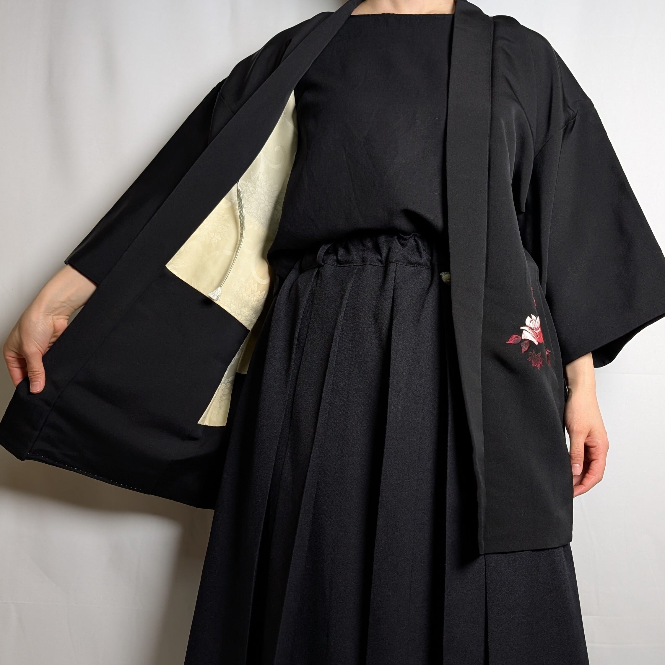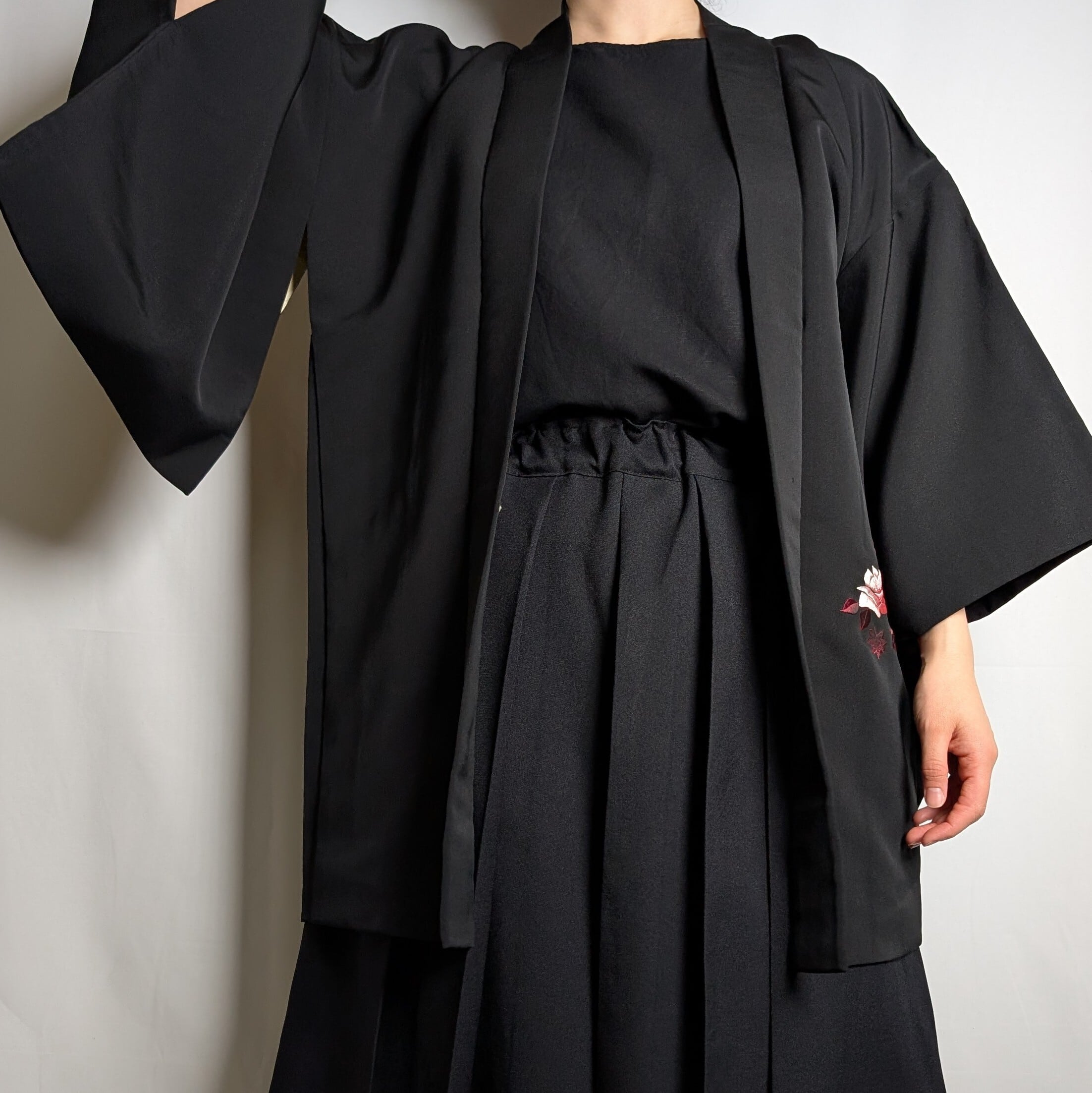 【14499】 ヴィンテージ 黒羽織 刺繍 花束模様 薔薇 菊 紅葉 ピンク 和洋折衷コーデ / Japanese vintage kimono black haori jacket
