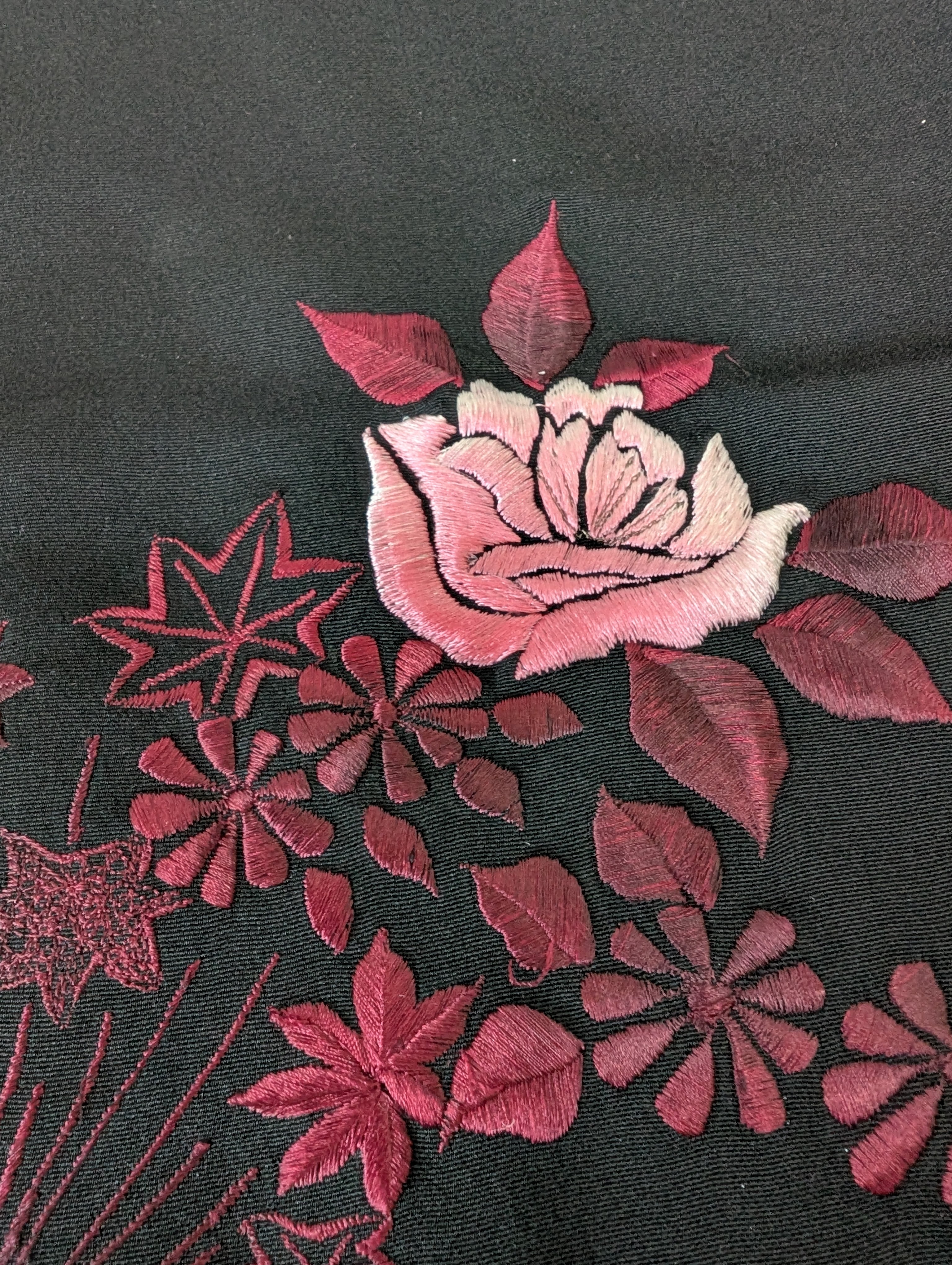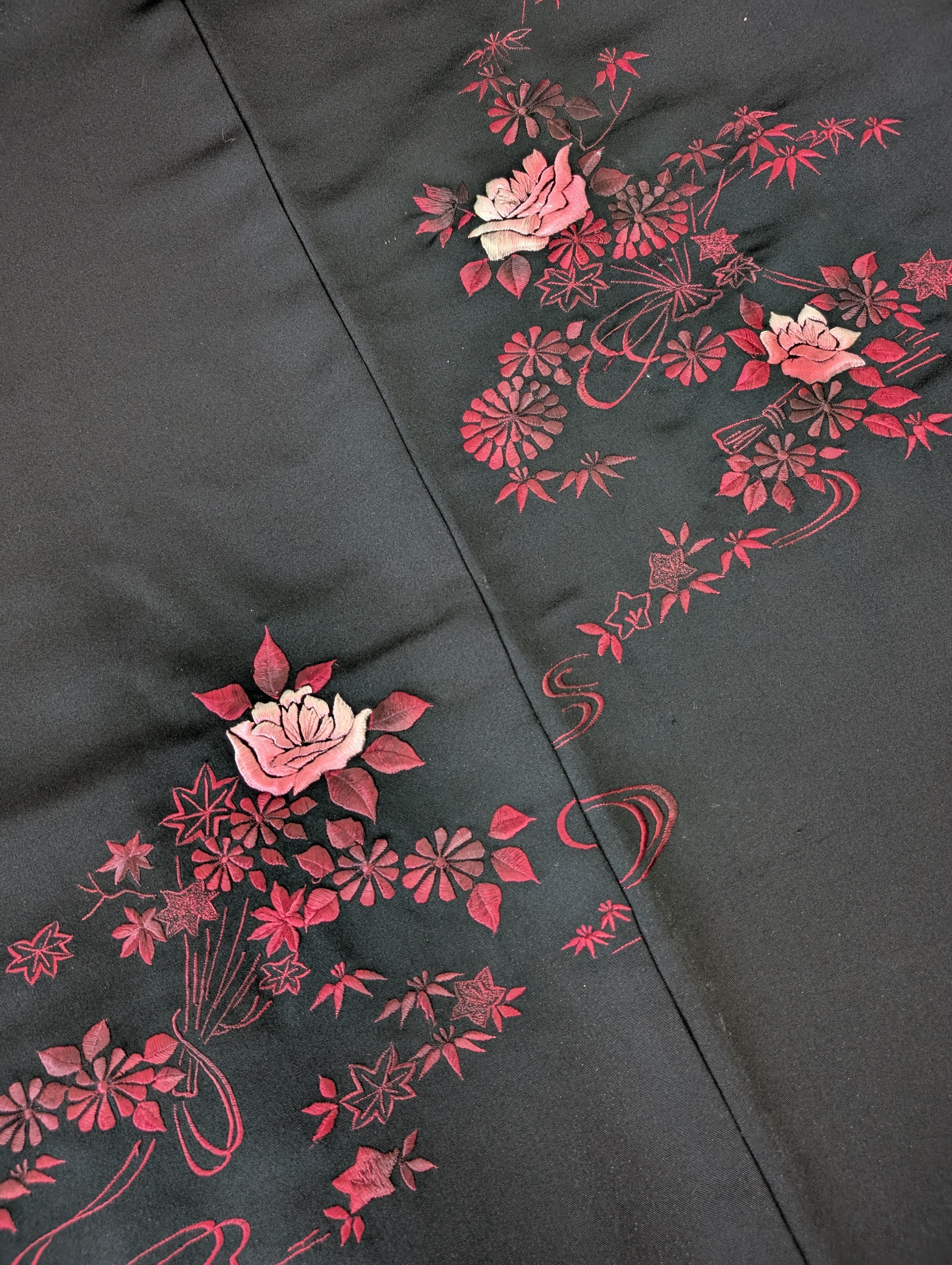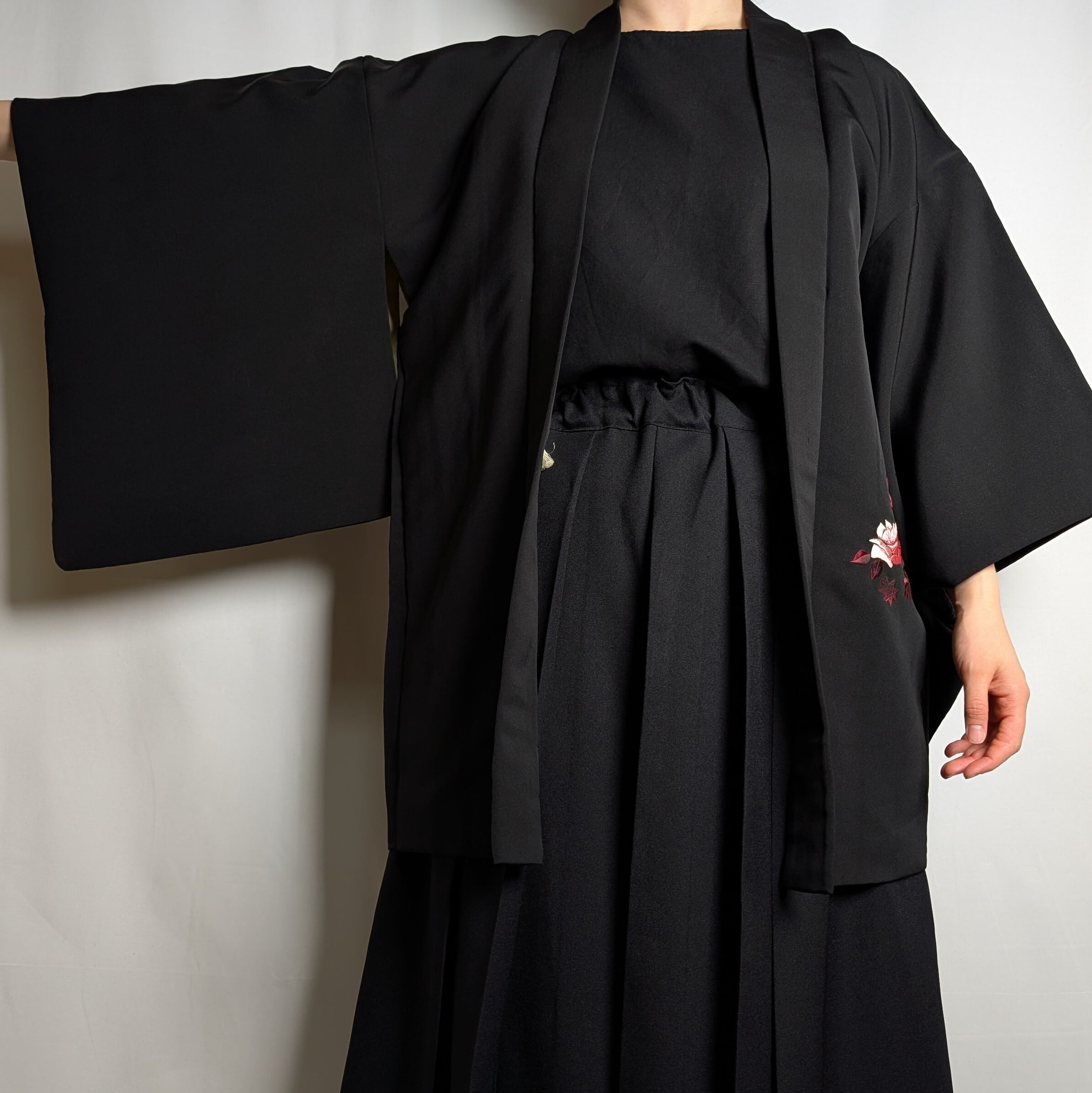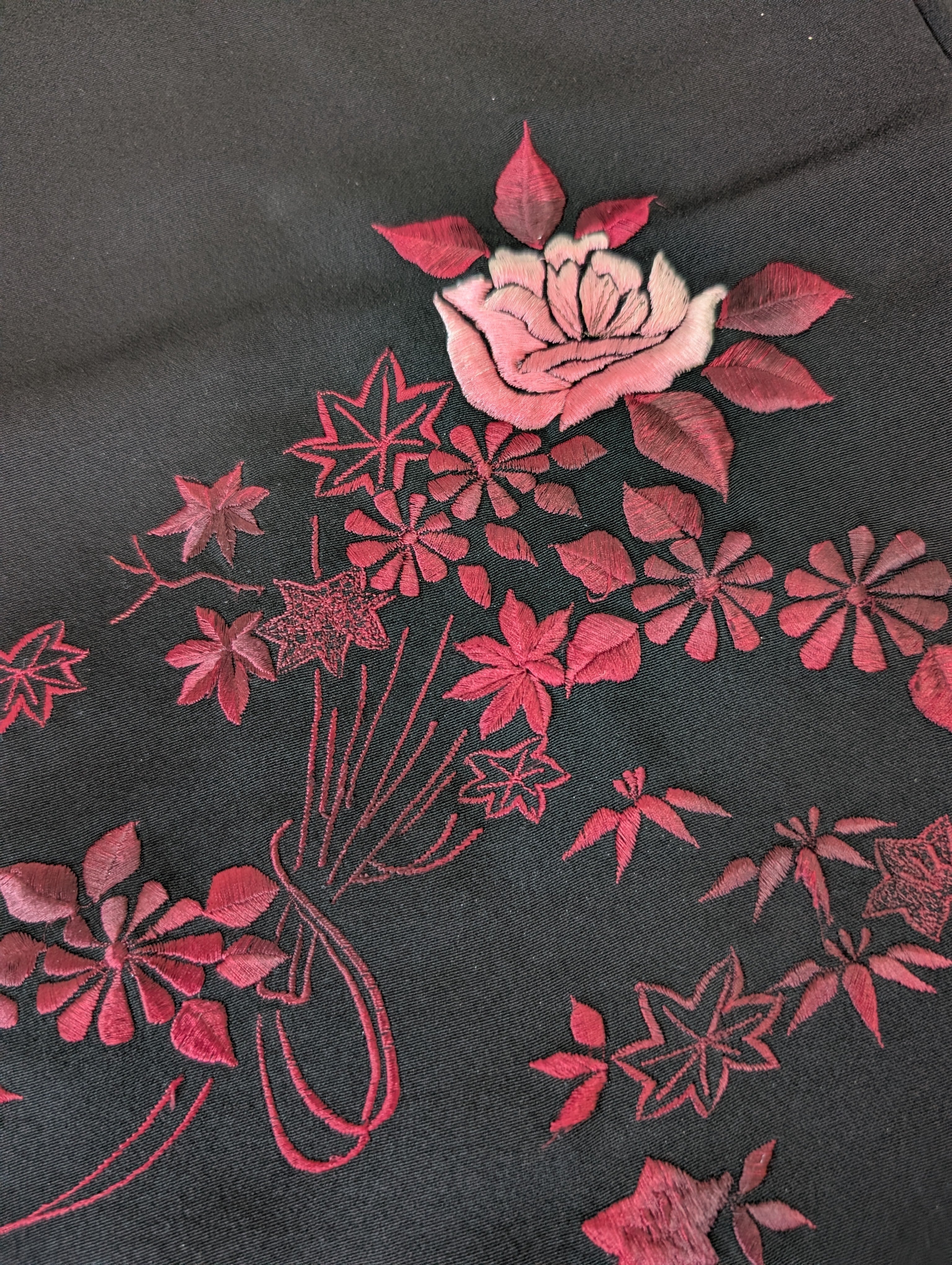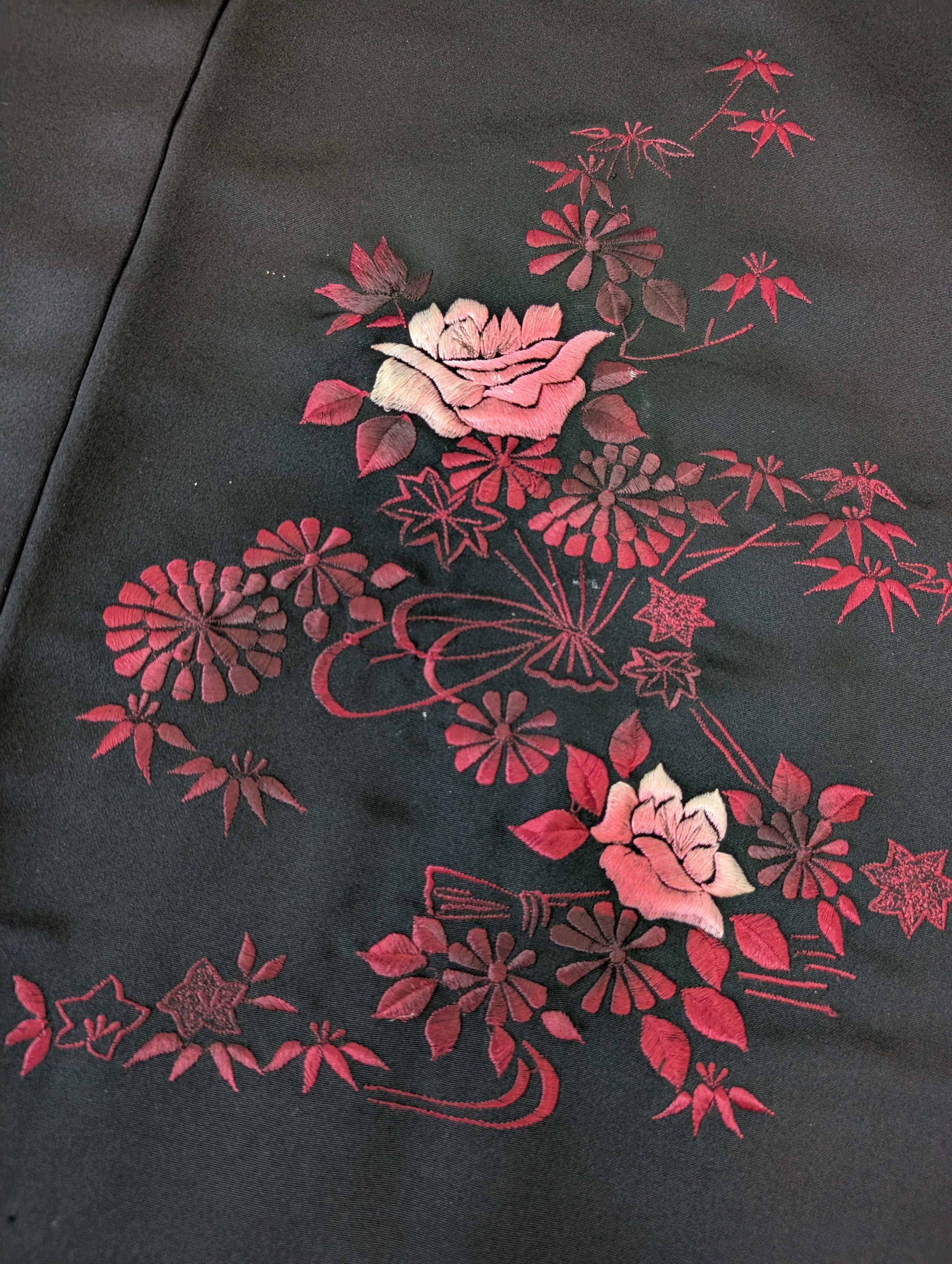 【14499】 ヴィンテージ 黒羽織 刺繍 花束模様 薔薇 菊 紅葉 ピンク 和洋折衷コーデ / Japanese vintage kimono black haori jacket