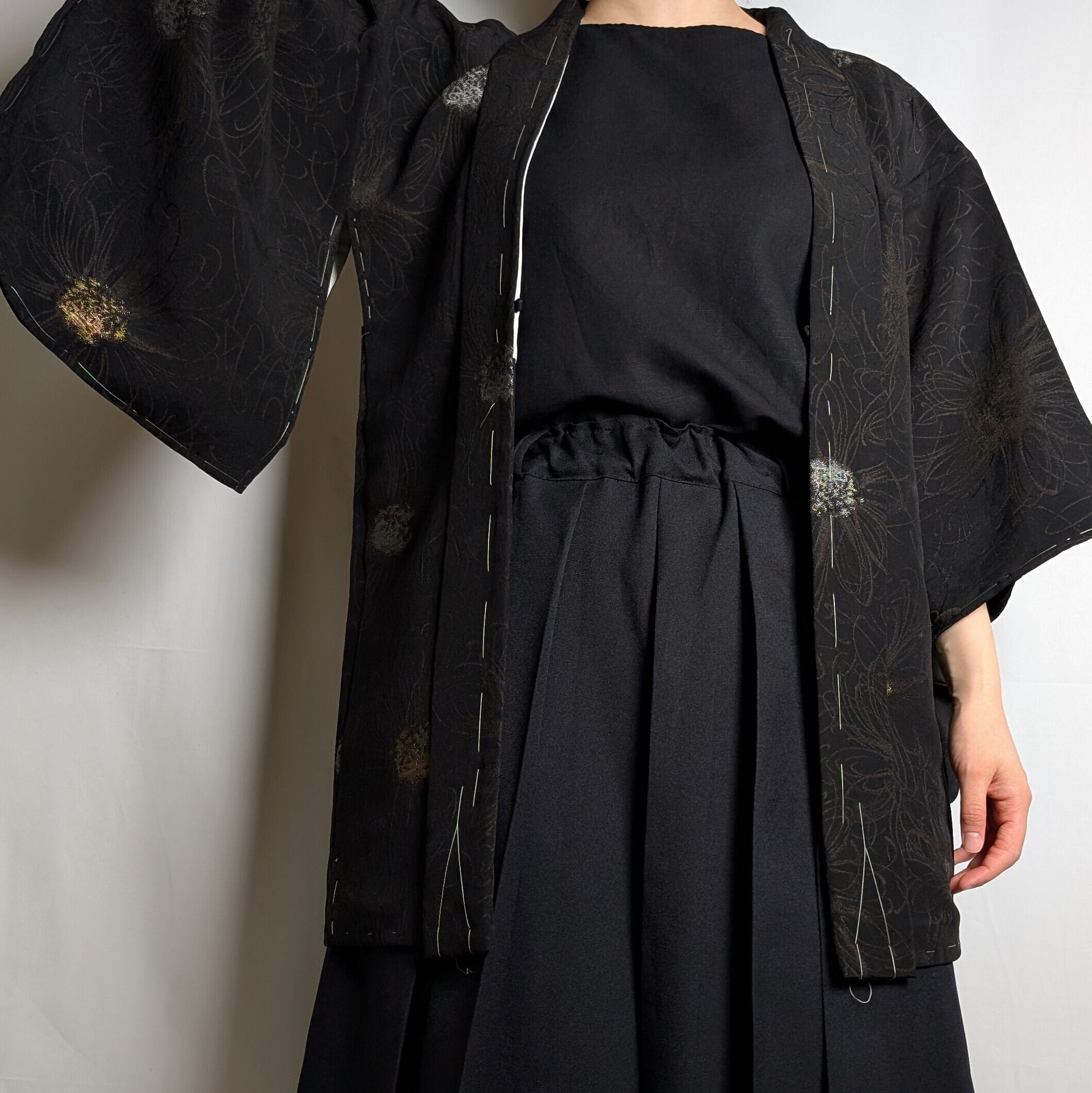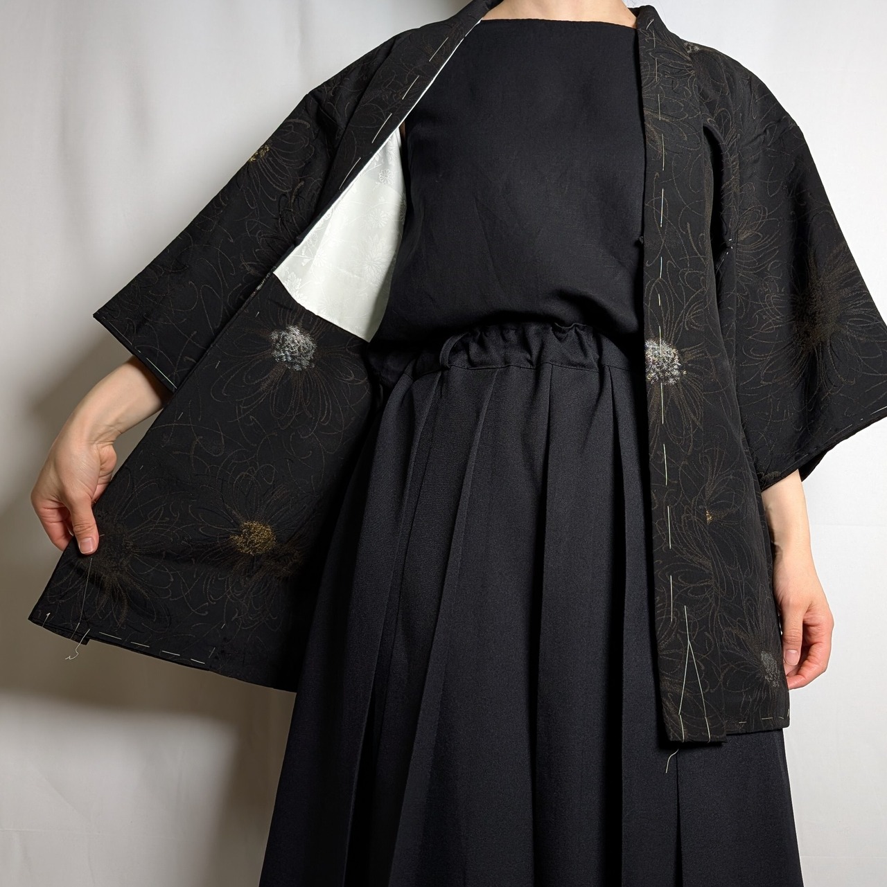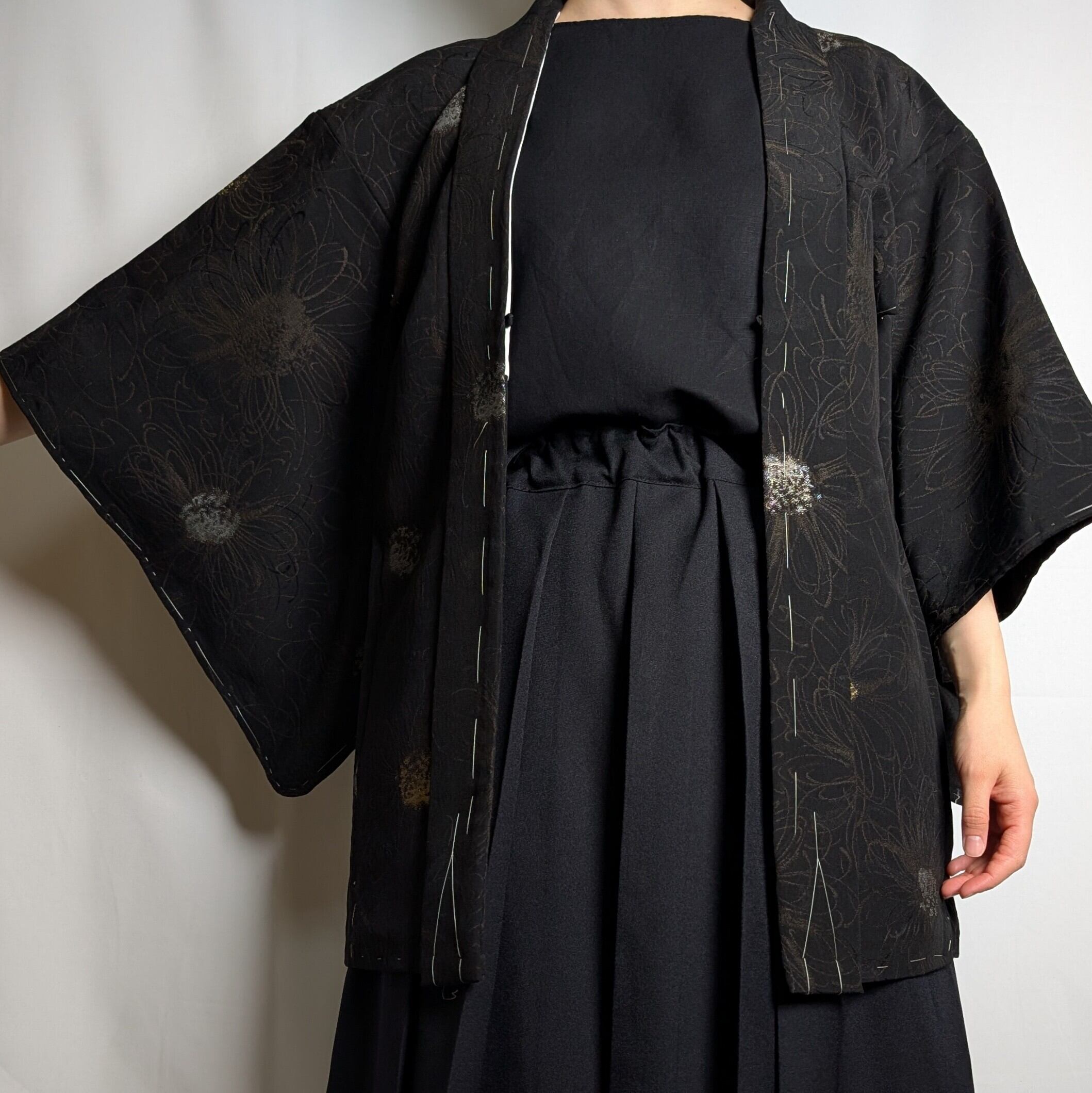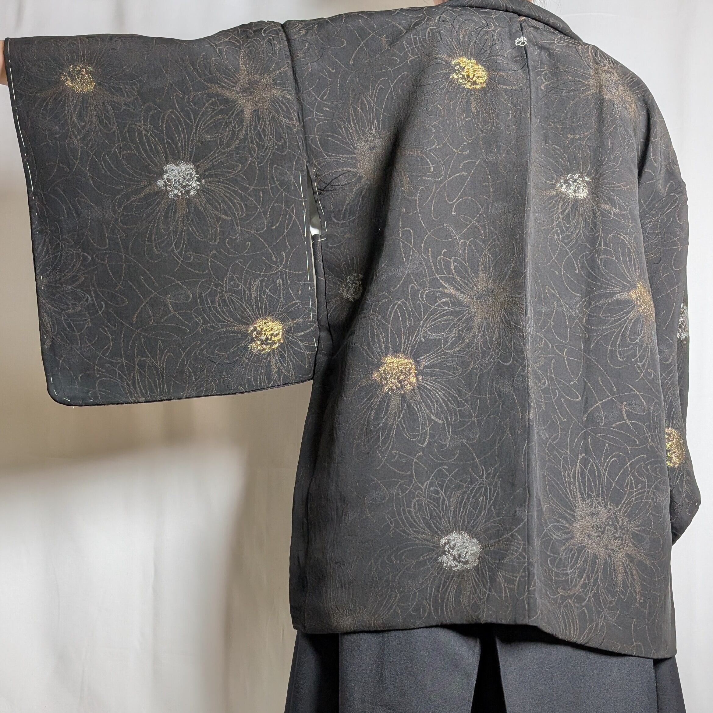 【14500】 ヴィンテージ 黒羽織 織り出し模様 花 金 銀 和洋折衷コーデ / Japanese vintage kimono black haori jacket