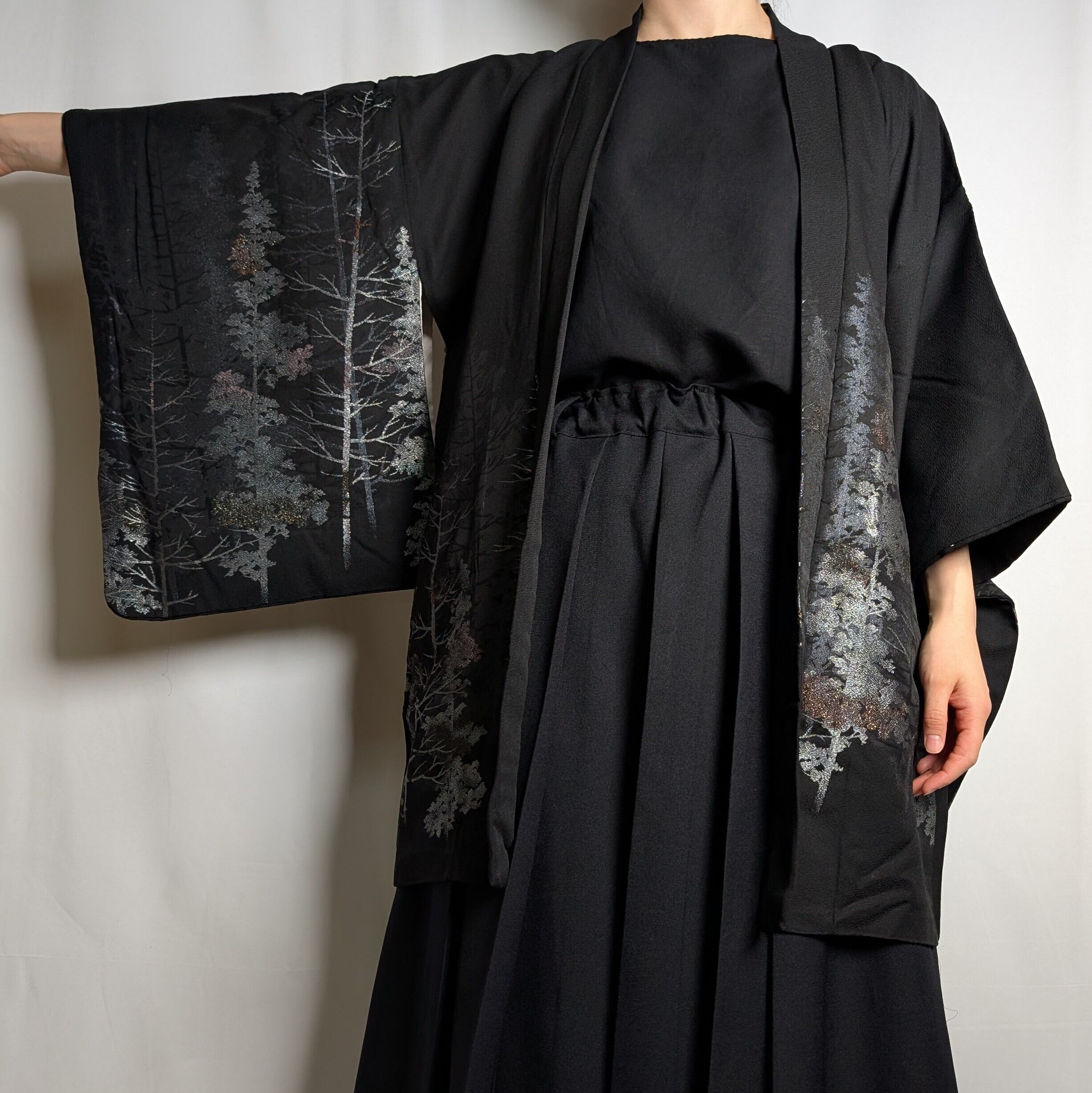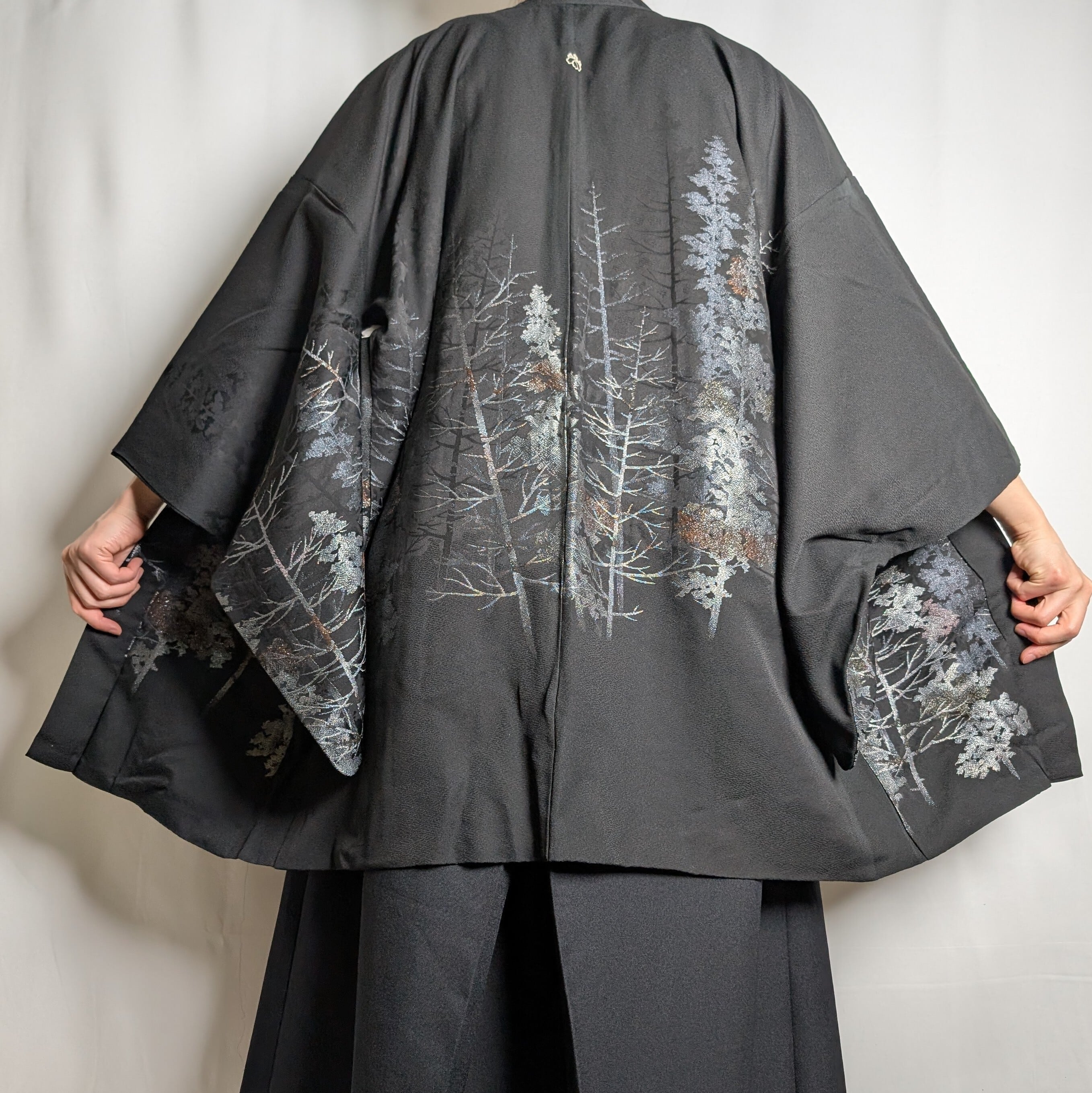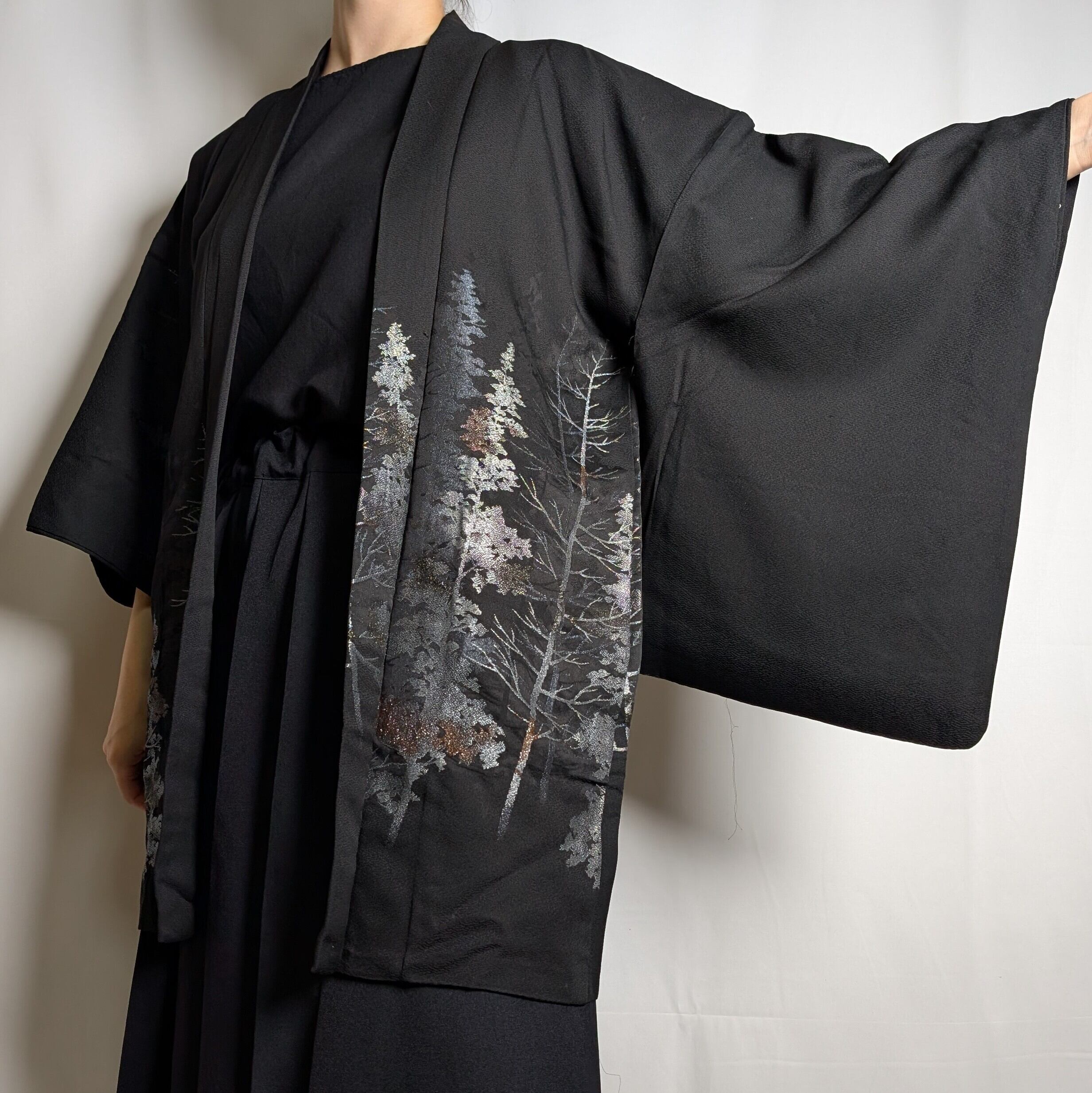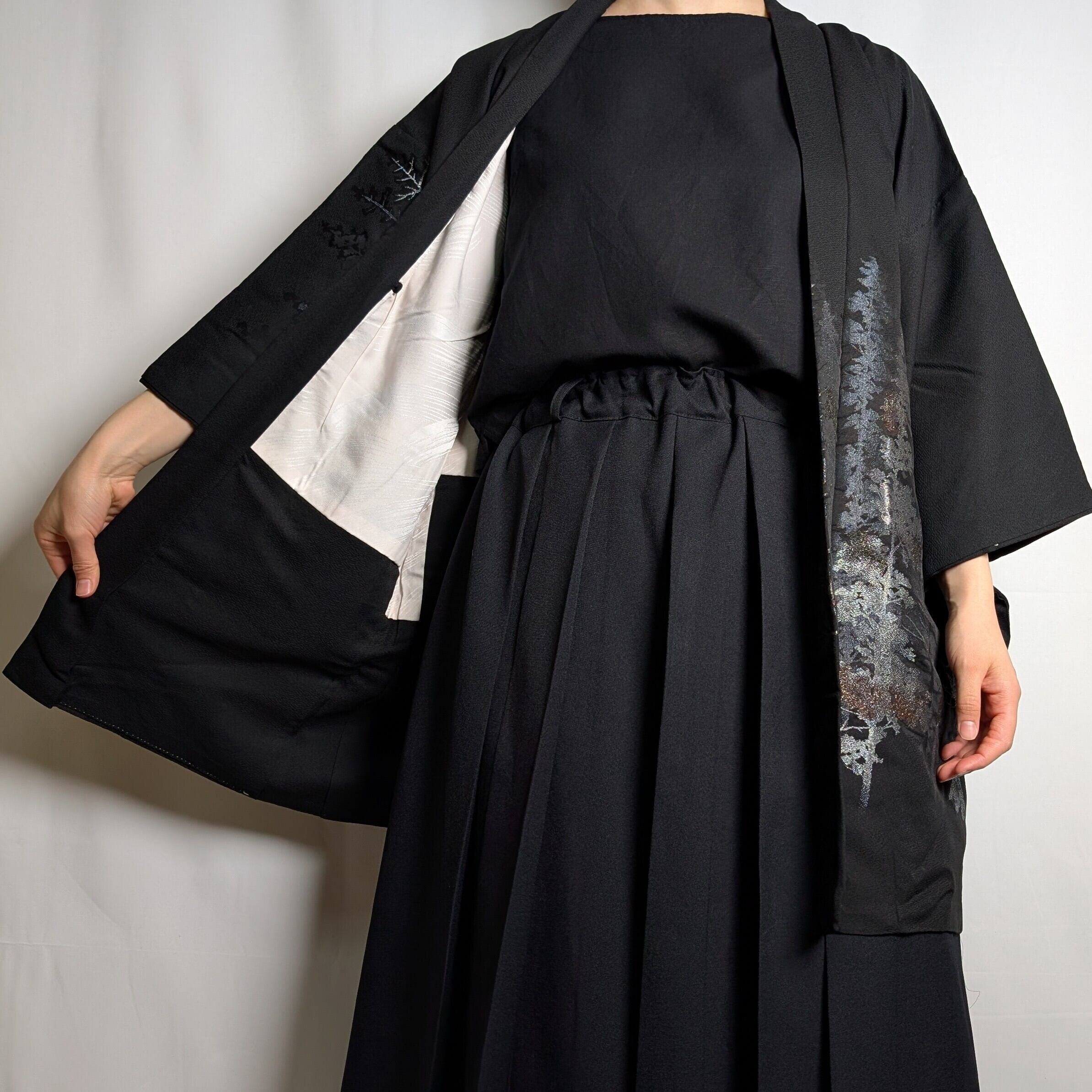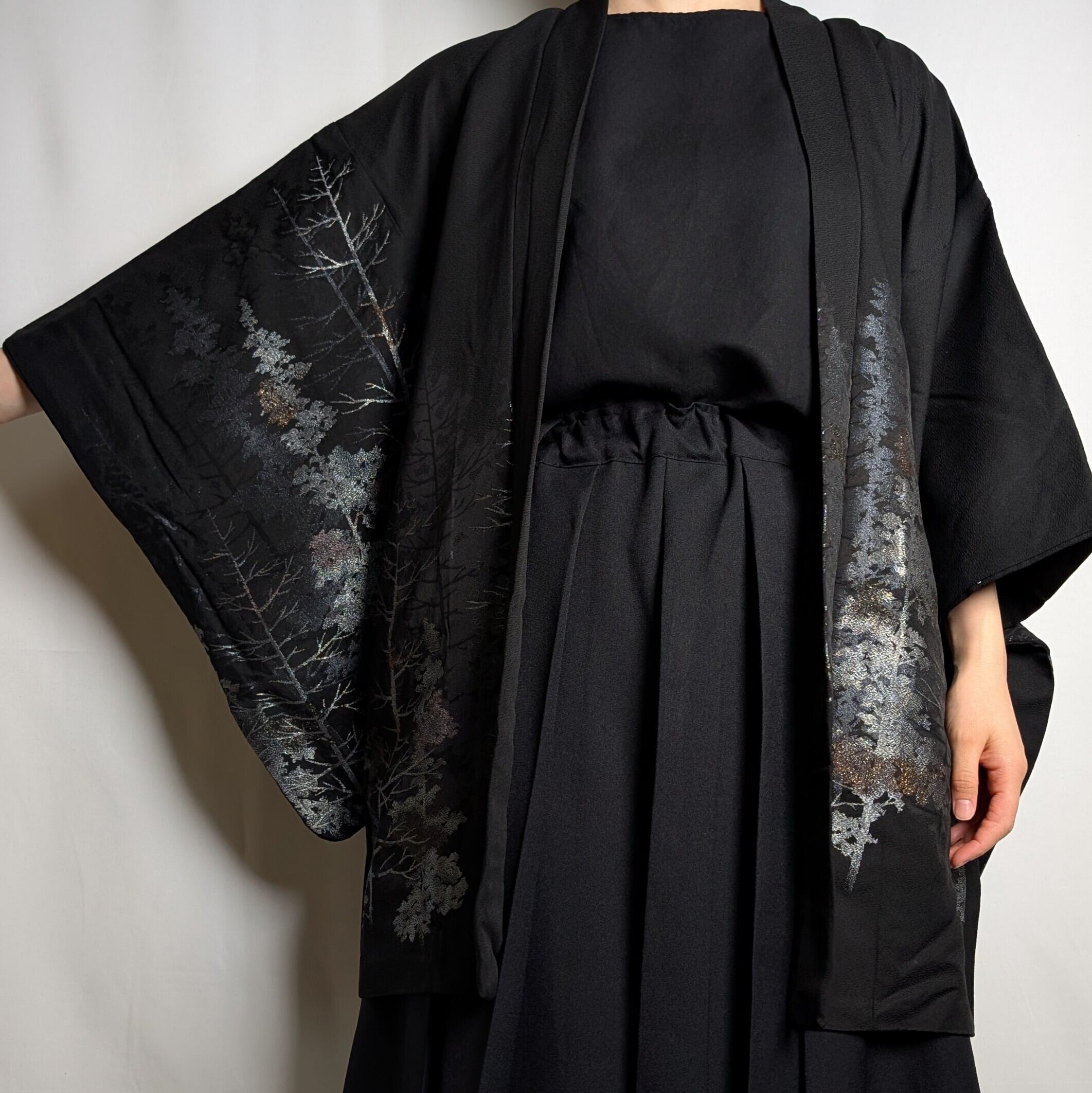 【14502】 ヴィンテージ 黒羽織 織り出し模様 銀 樹木風景 和洋折衷コーデ / Japanese vintage kimono black haori jacket