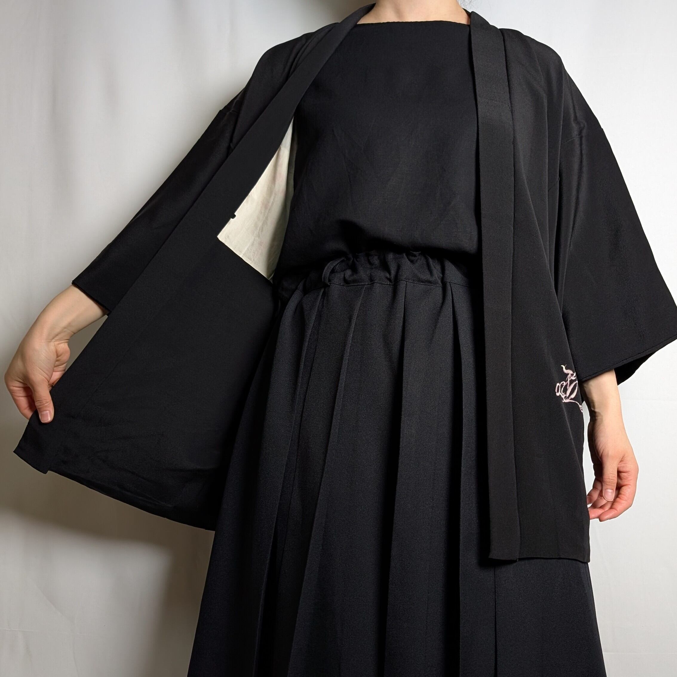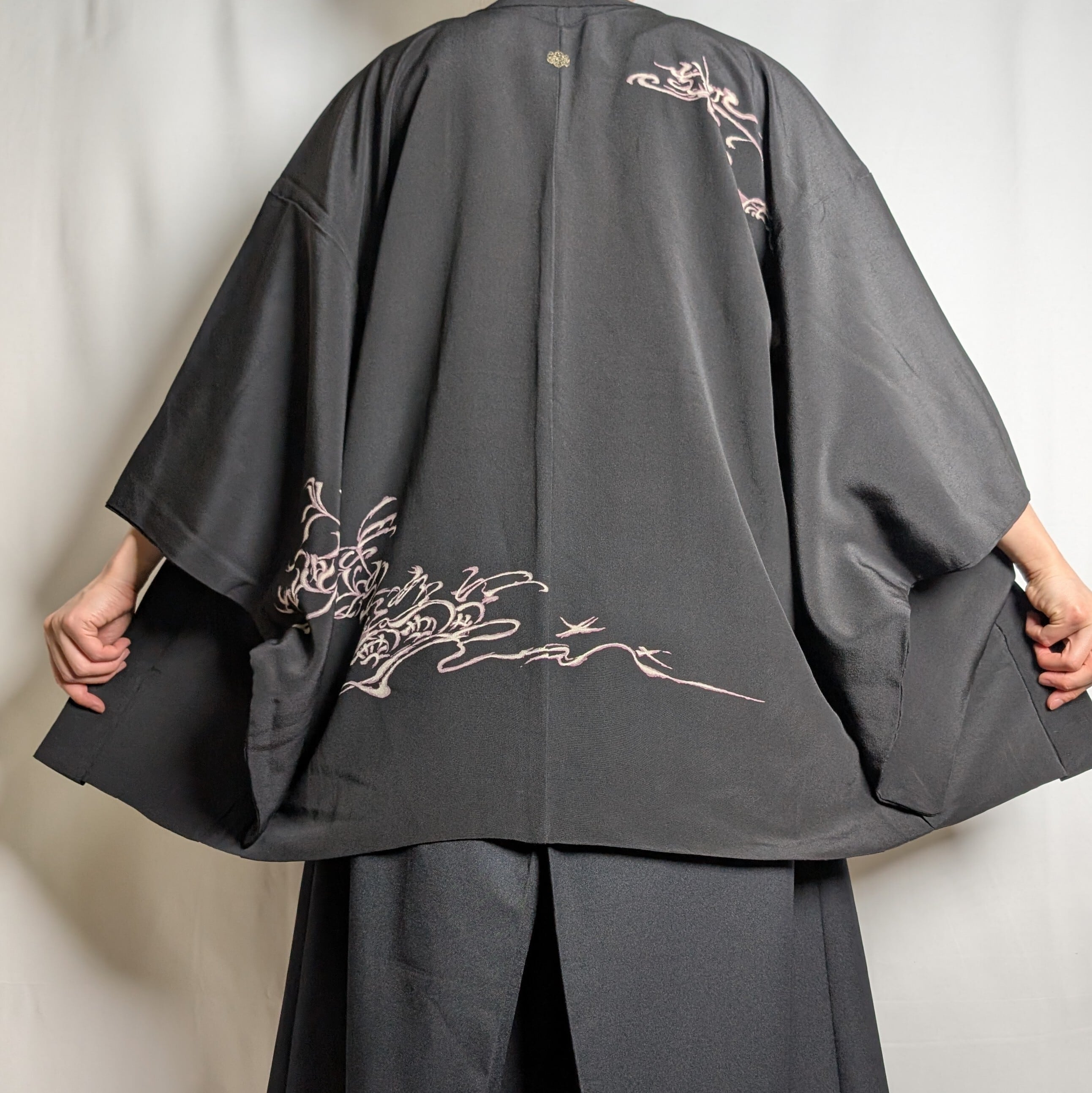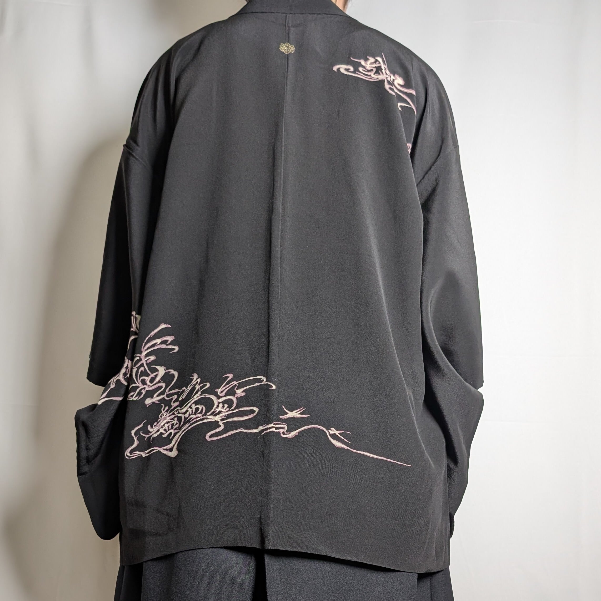 【14503】 ヴィンテージ 黒羽織 織り出し模様 金 銀 ピンク和洋折衷コーデ / Japanese vintage kimono black haori jacket
