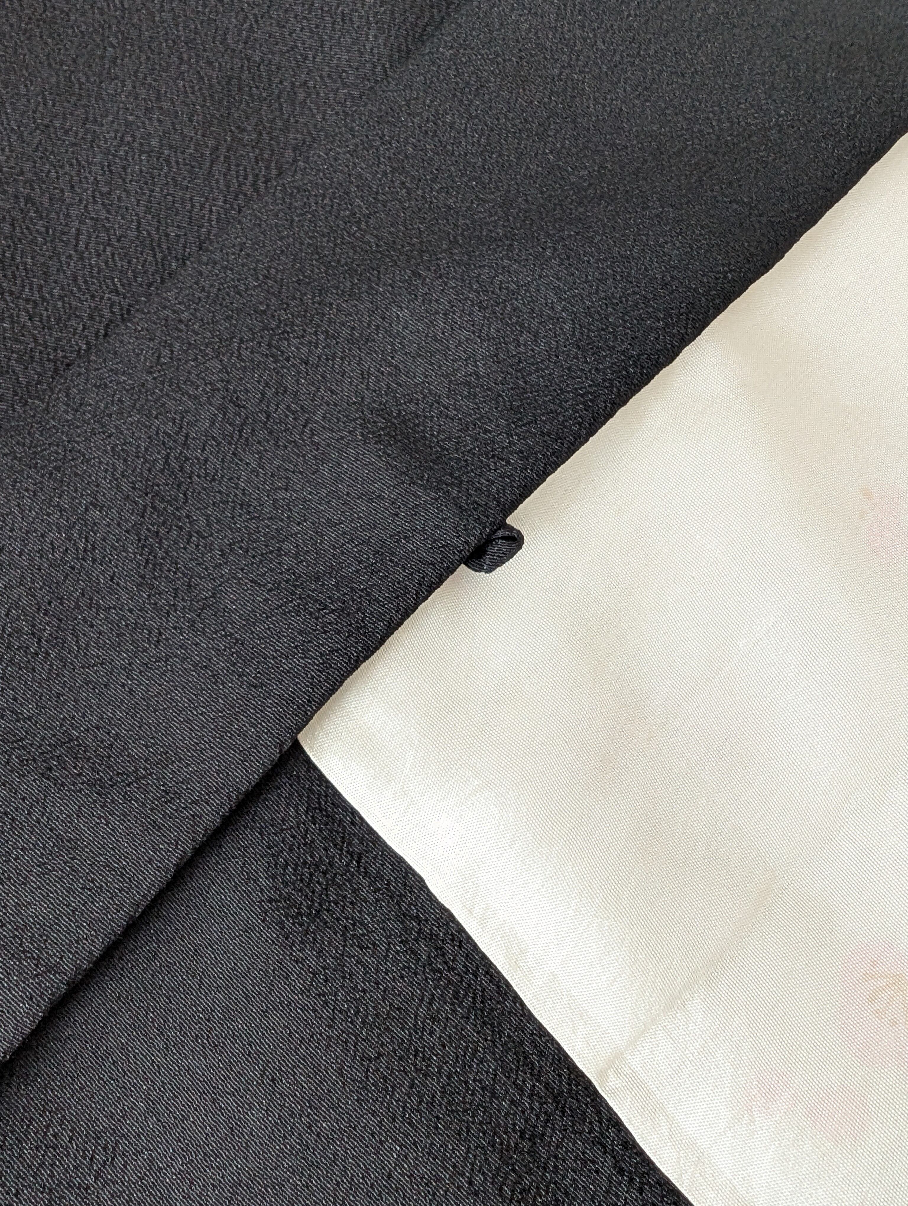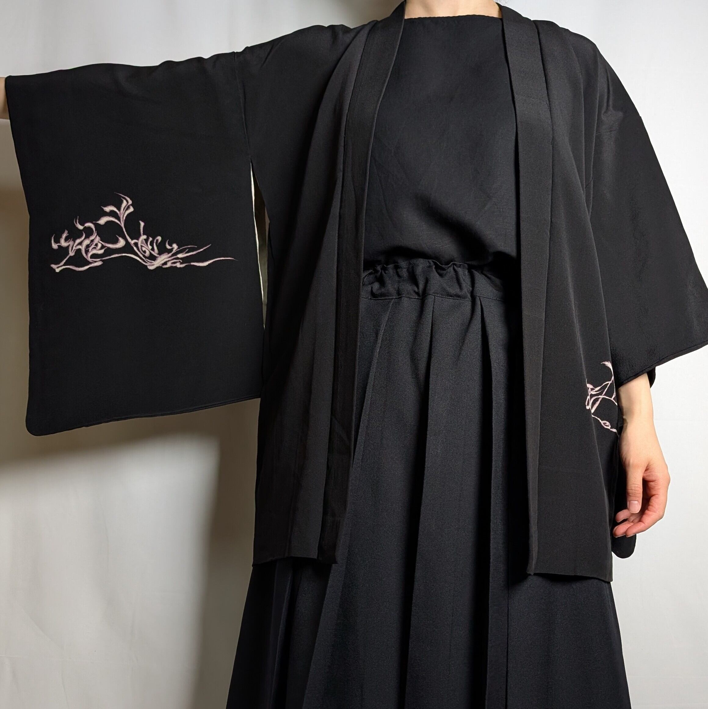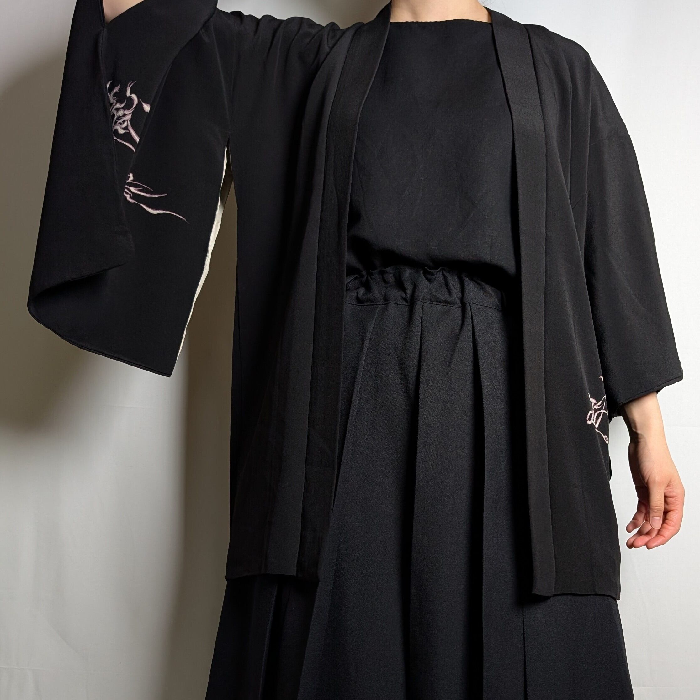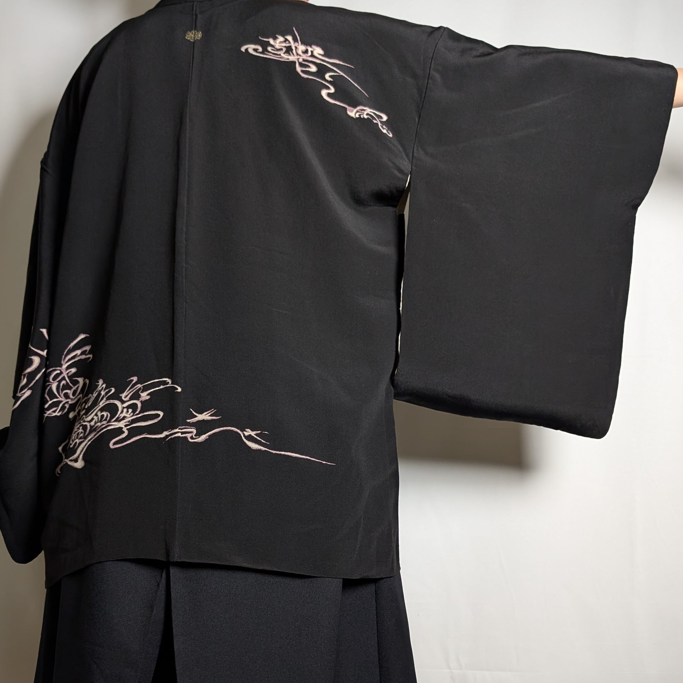 【14503】 ヴィンテージ 黒羽織 織り出し模様 金 銀 ピンク和洋折衷コーデ / Japanese vintage kimono black haori jacket