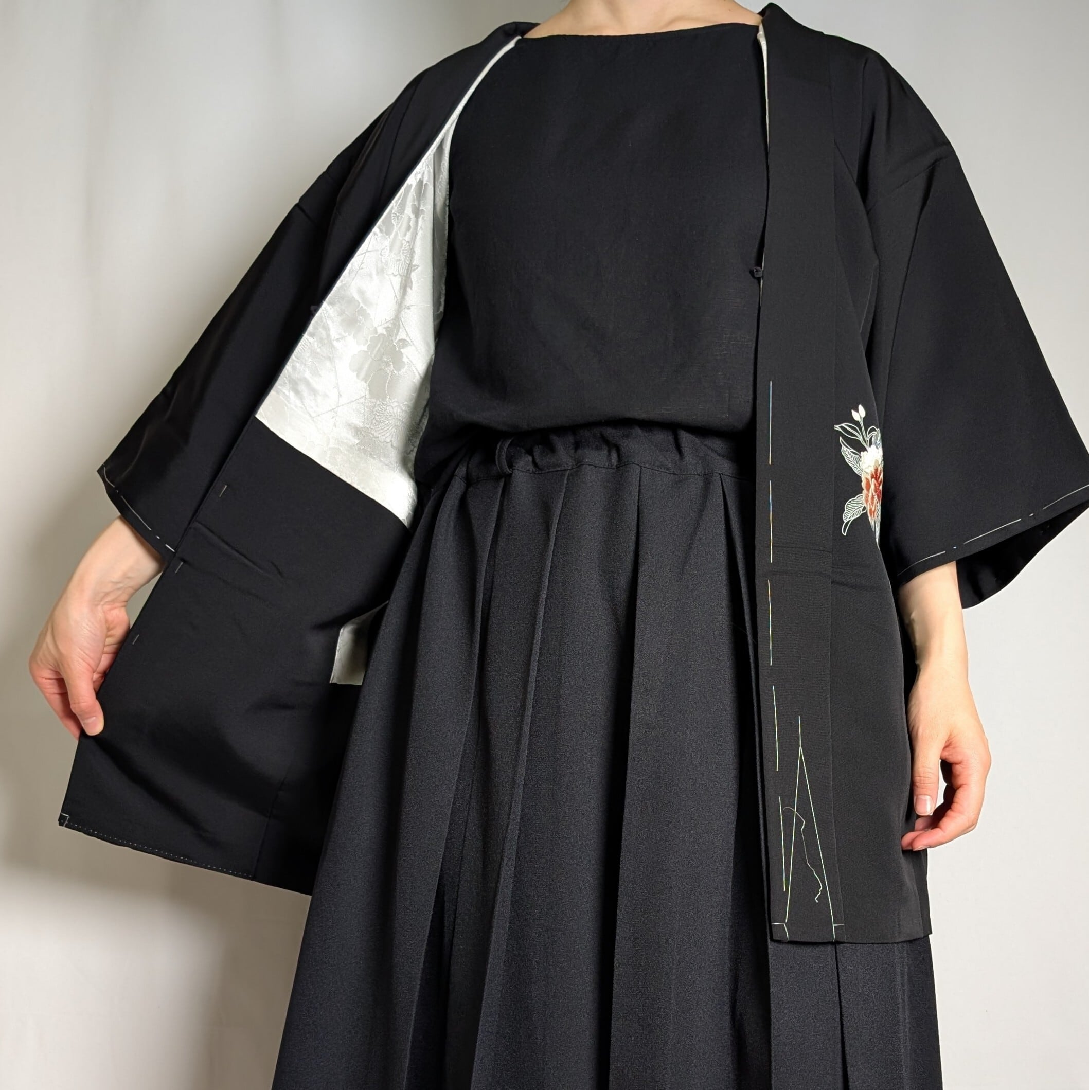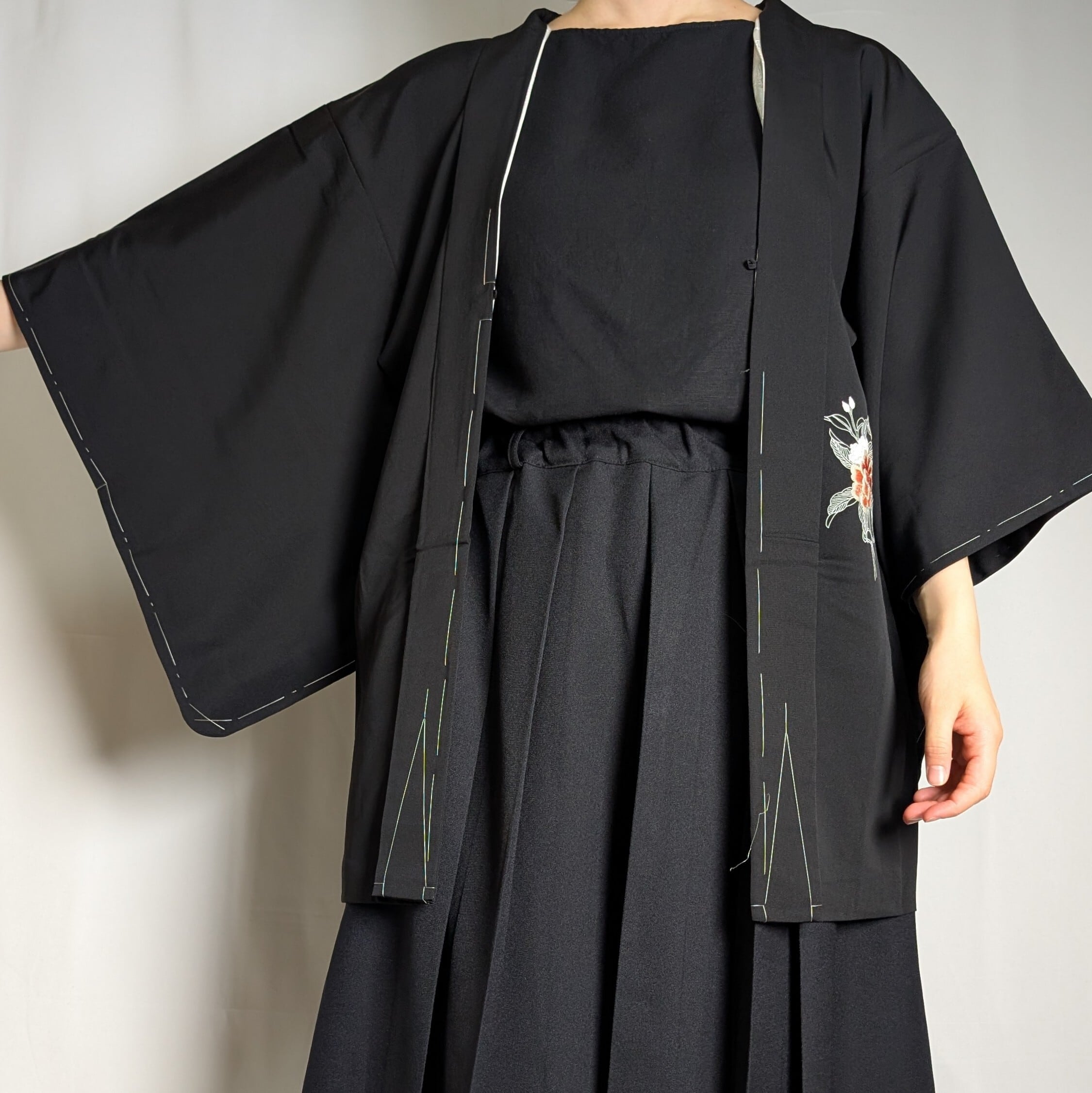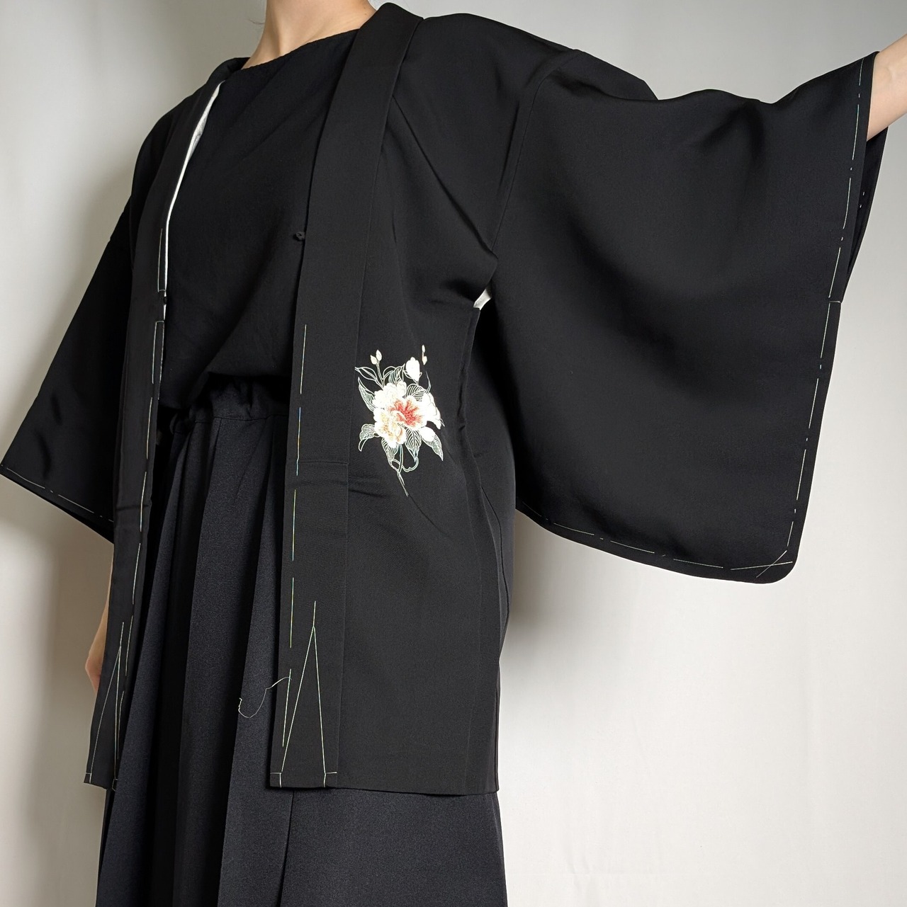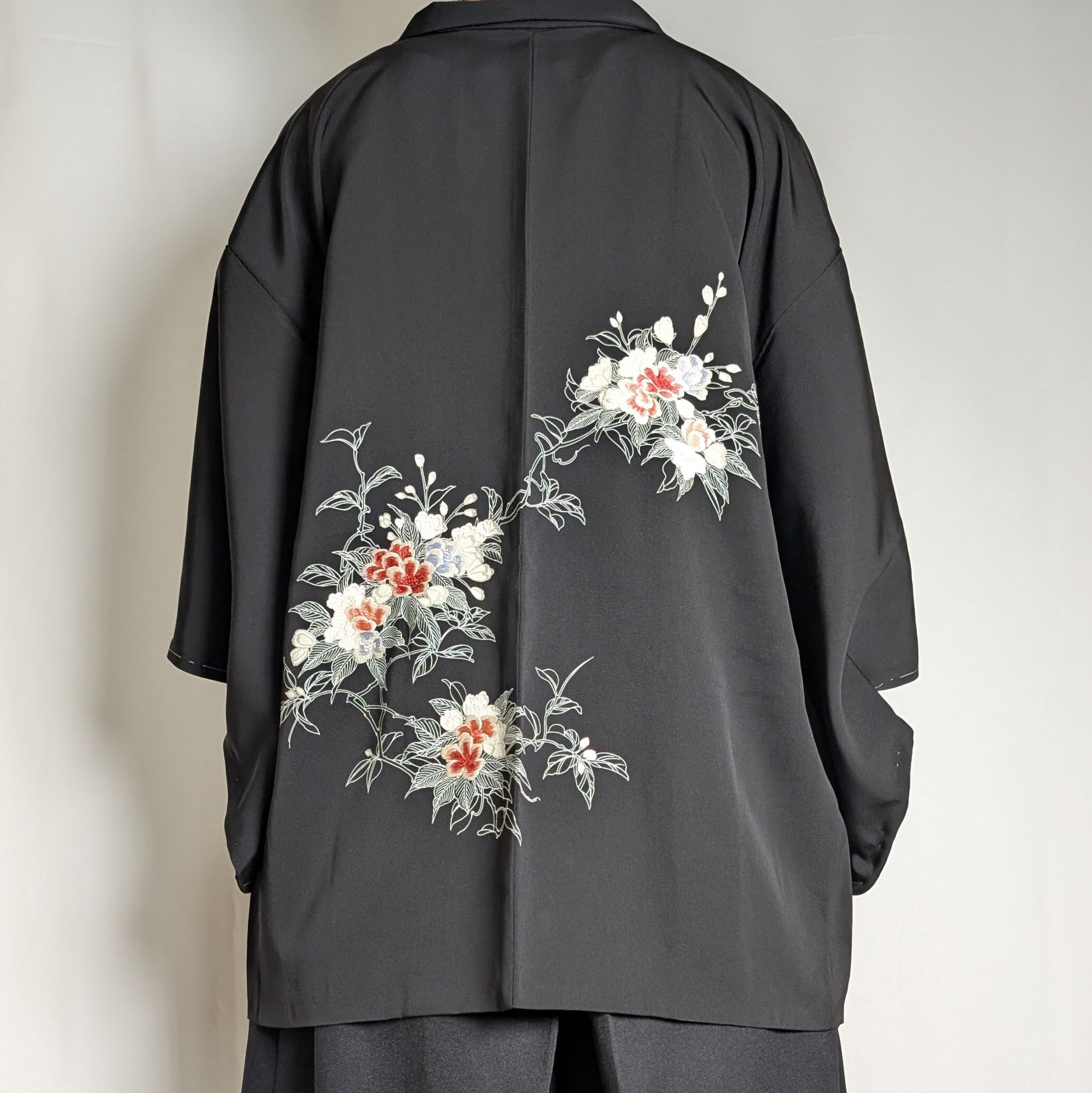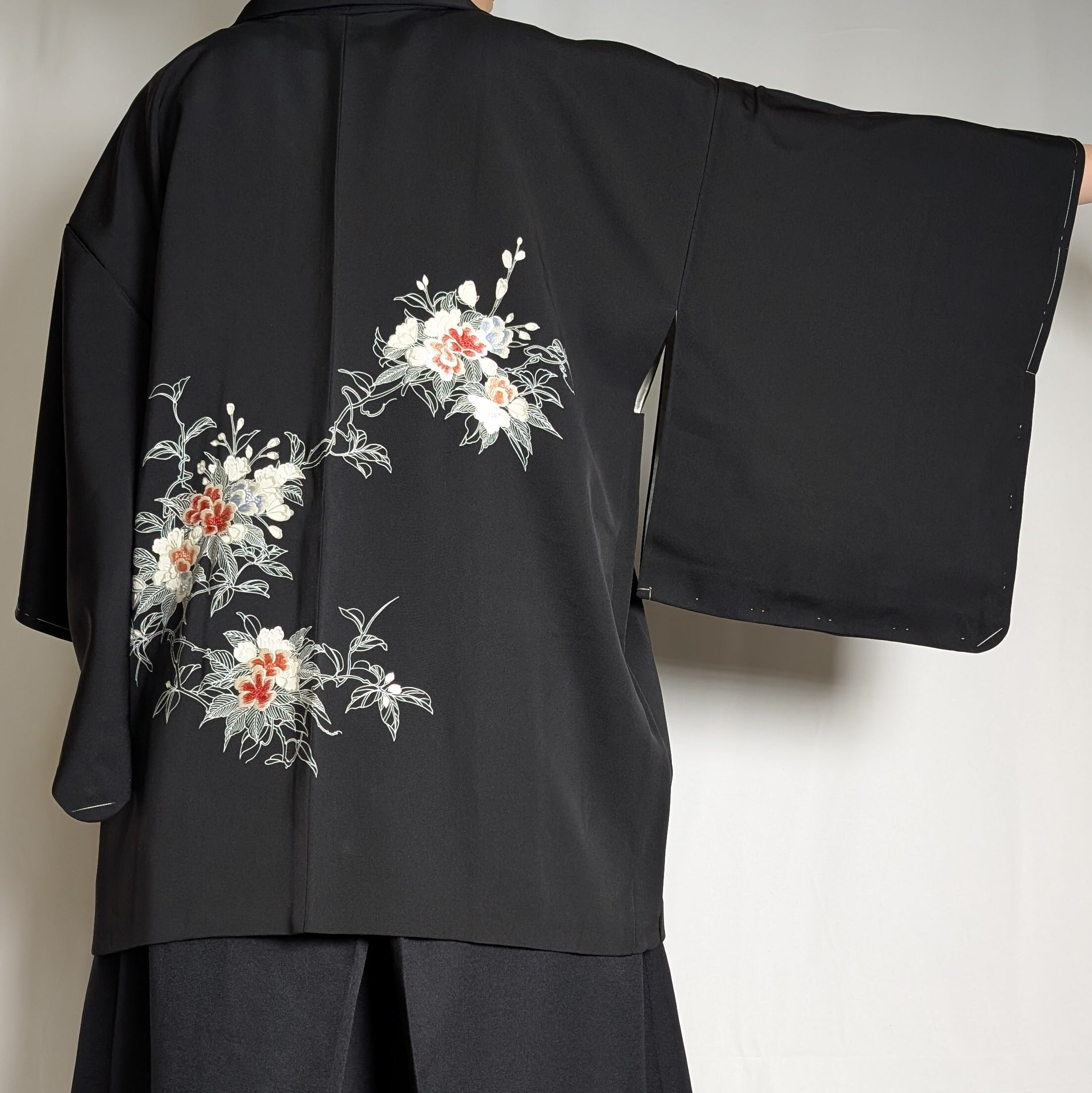 【14505】 ヴィンテージ 黒羽織 刺繍 花模様 白 赤 青 和洋折衷コーデ / Japanese vintage kimono black haori jacket