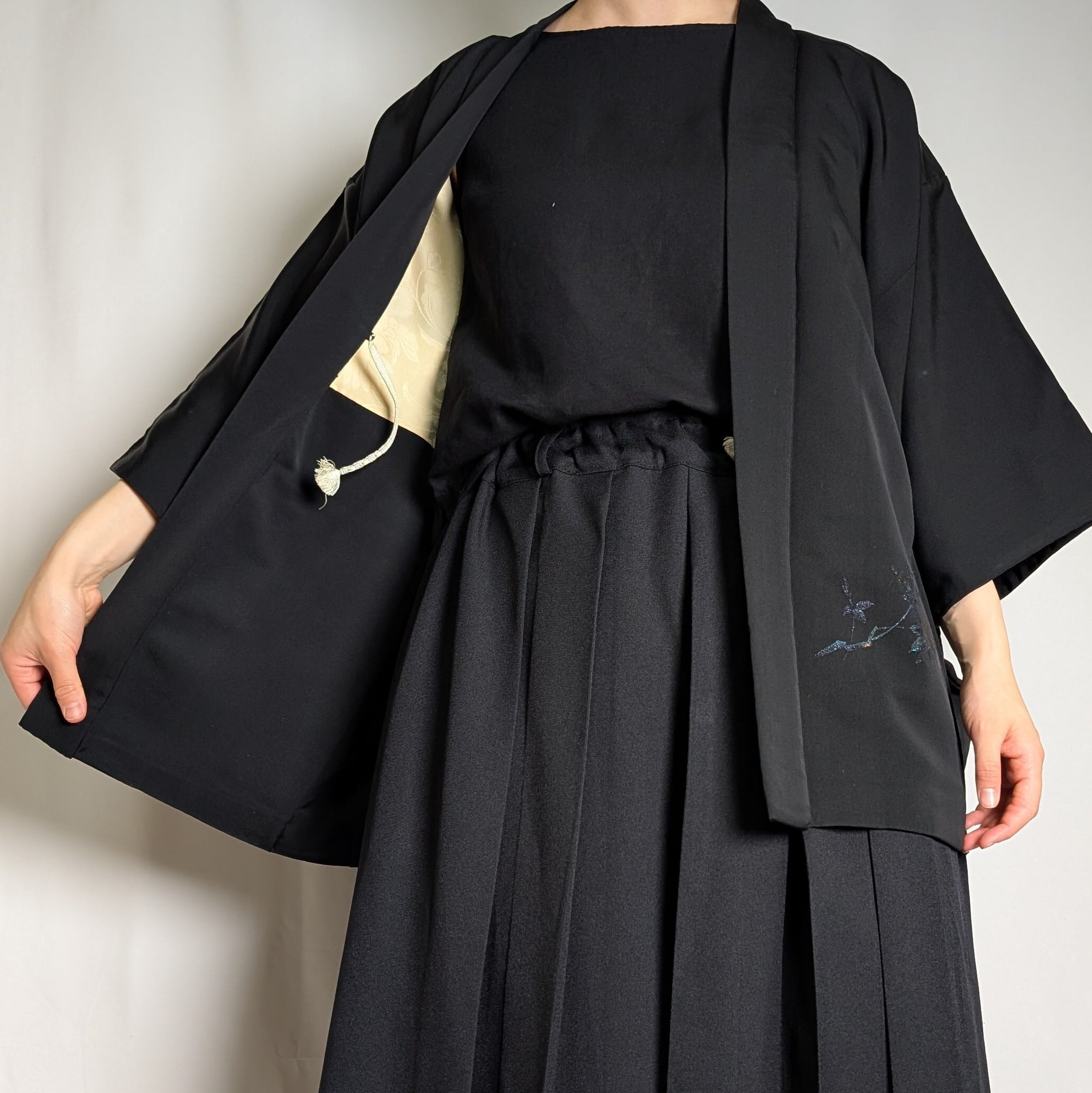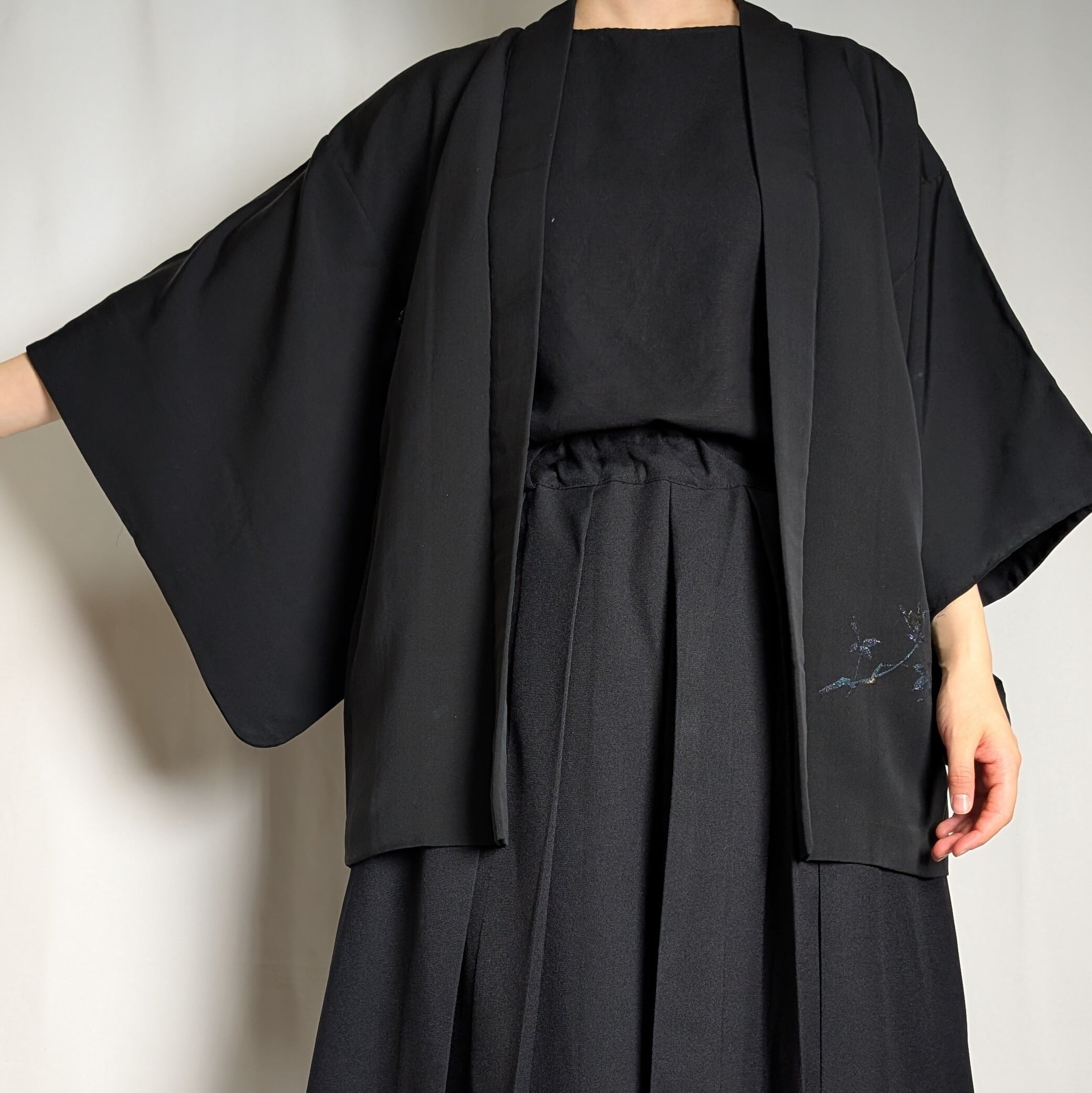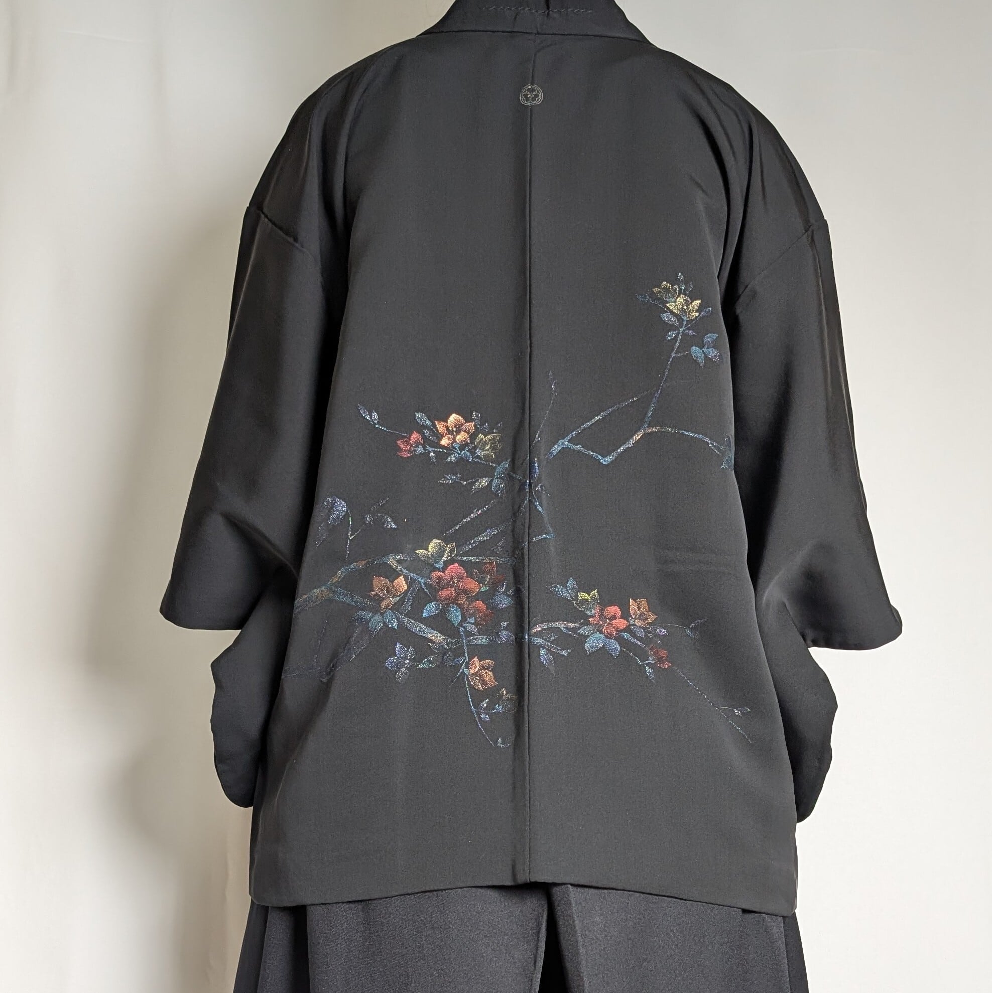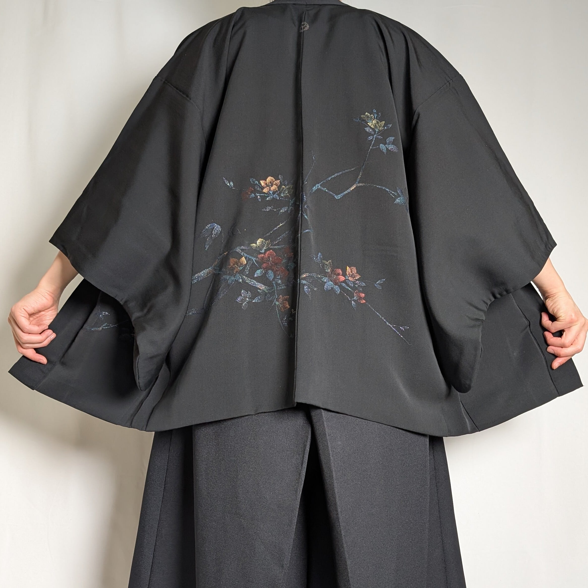 【14506】 ヴィンテージ 黒羽織 織り出し 樹木 花模様和洋折衷コーデ / Japanese vintage kimono black haori jacket