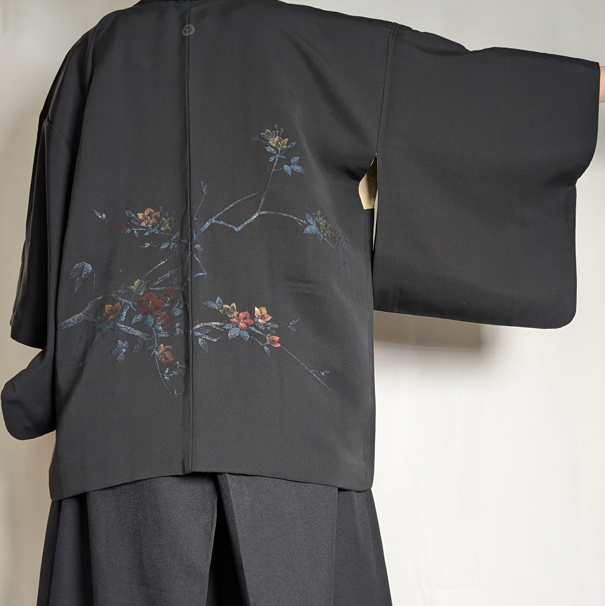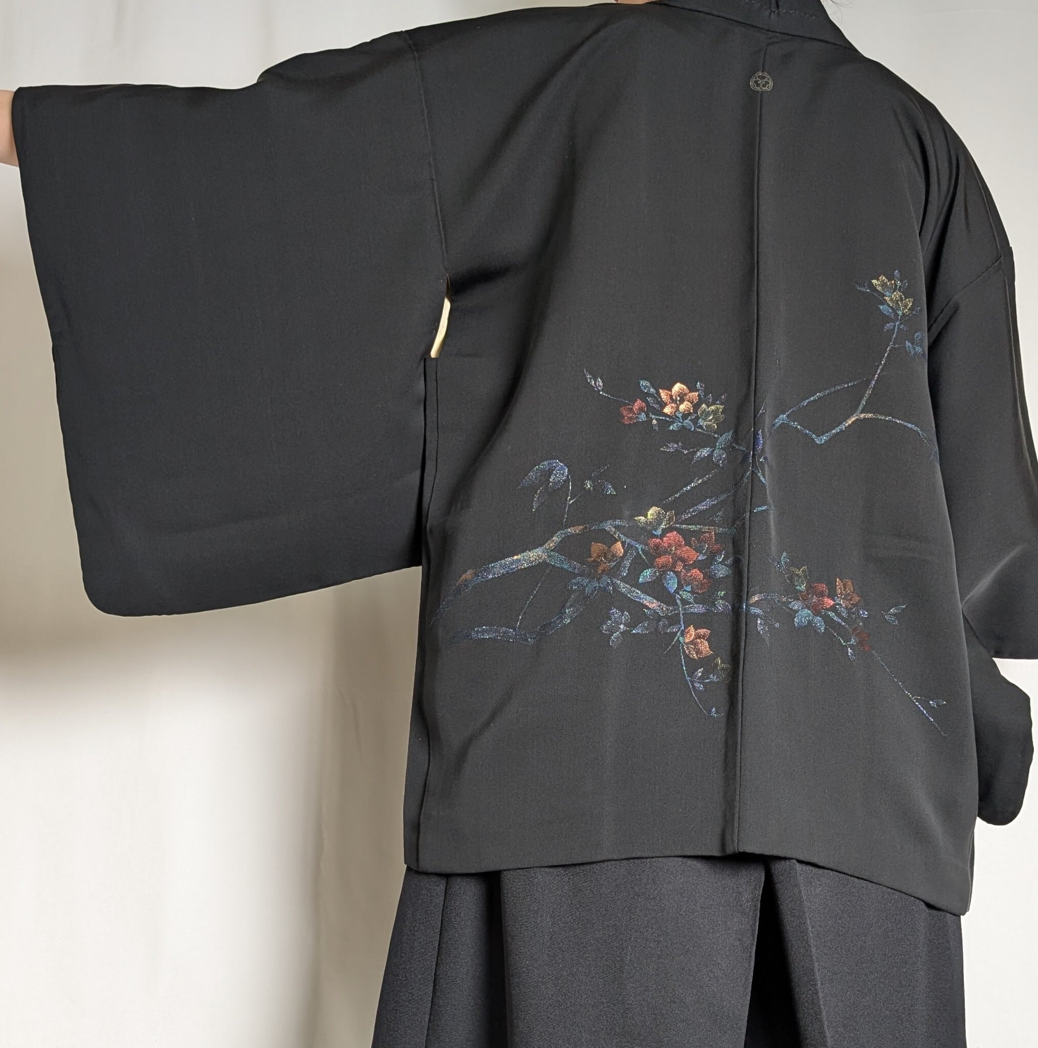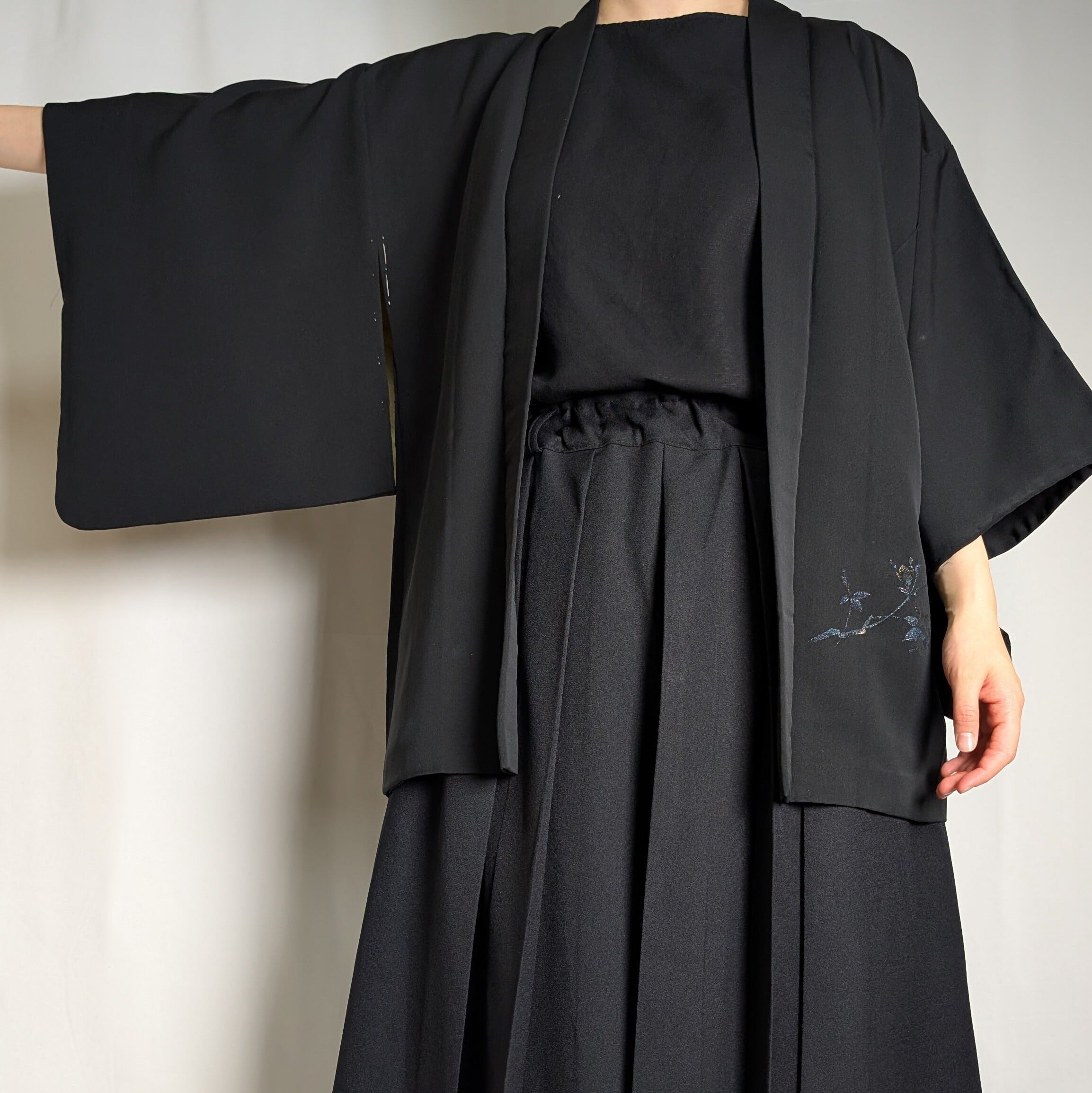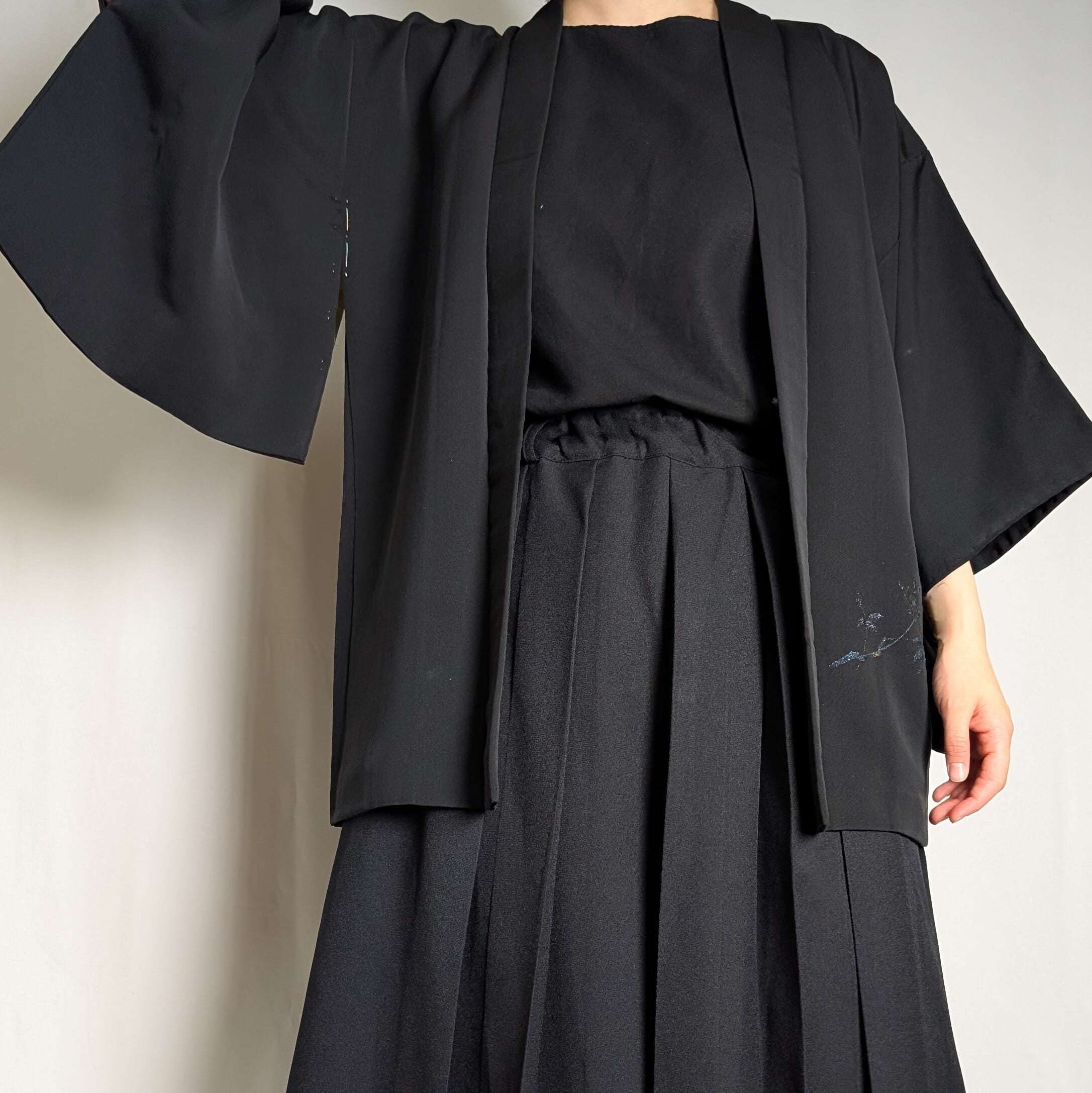 【14506】 ヴィンテージ 黒羽織 織り出し 樹木 花模様和洋折衷コーデ / Japanese vintage kimono black haori jacket
