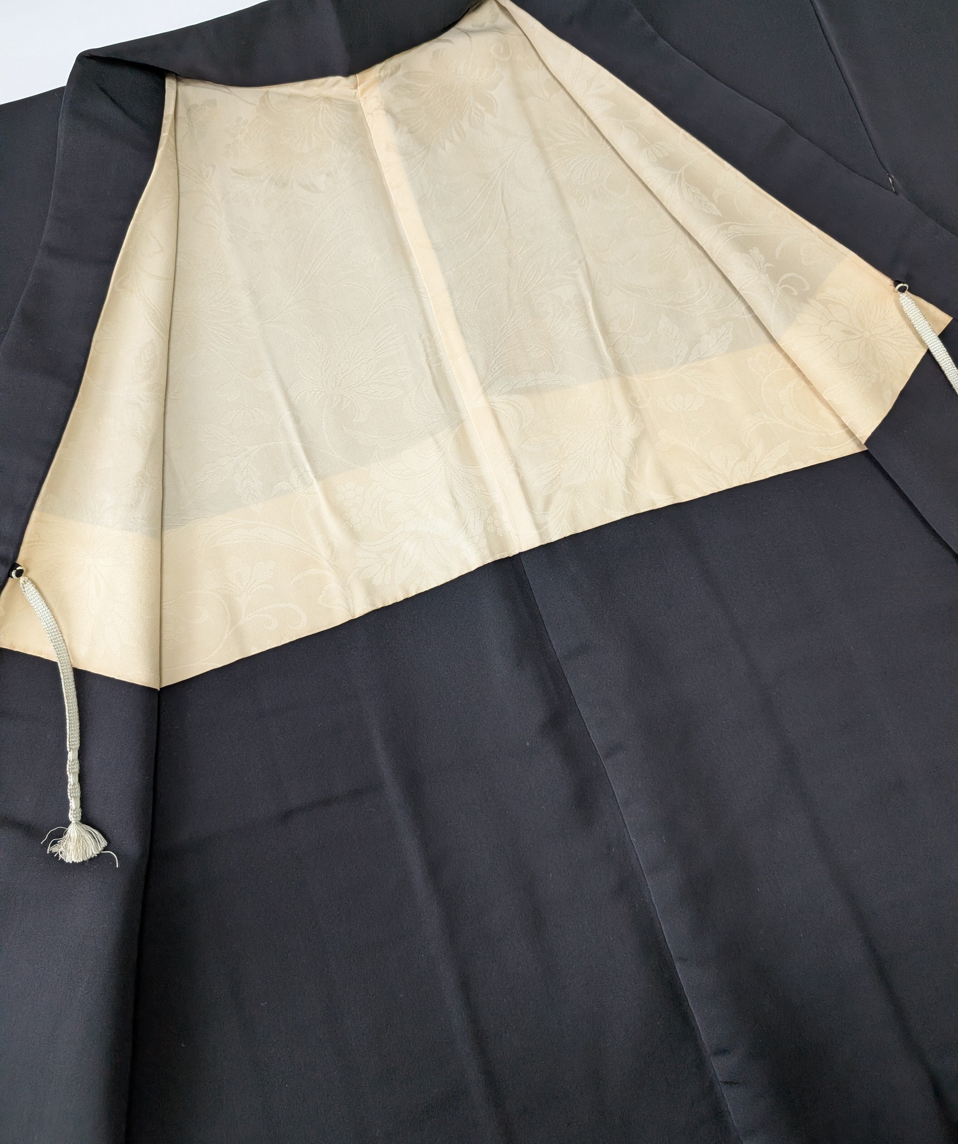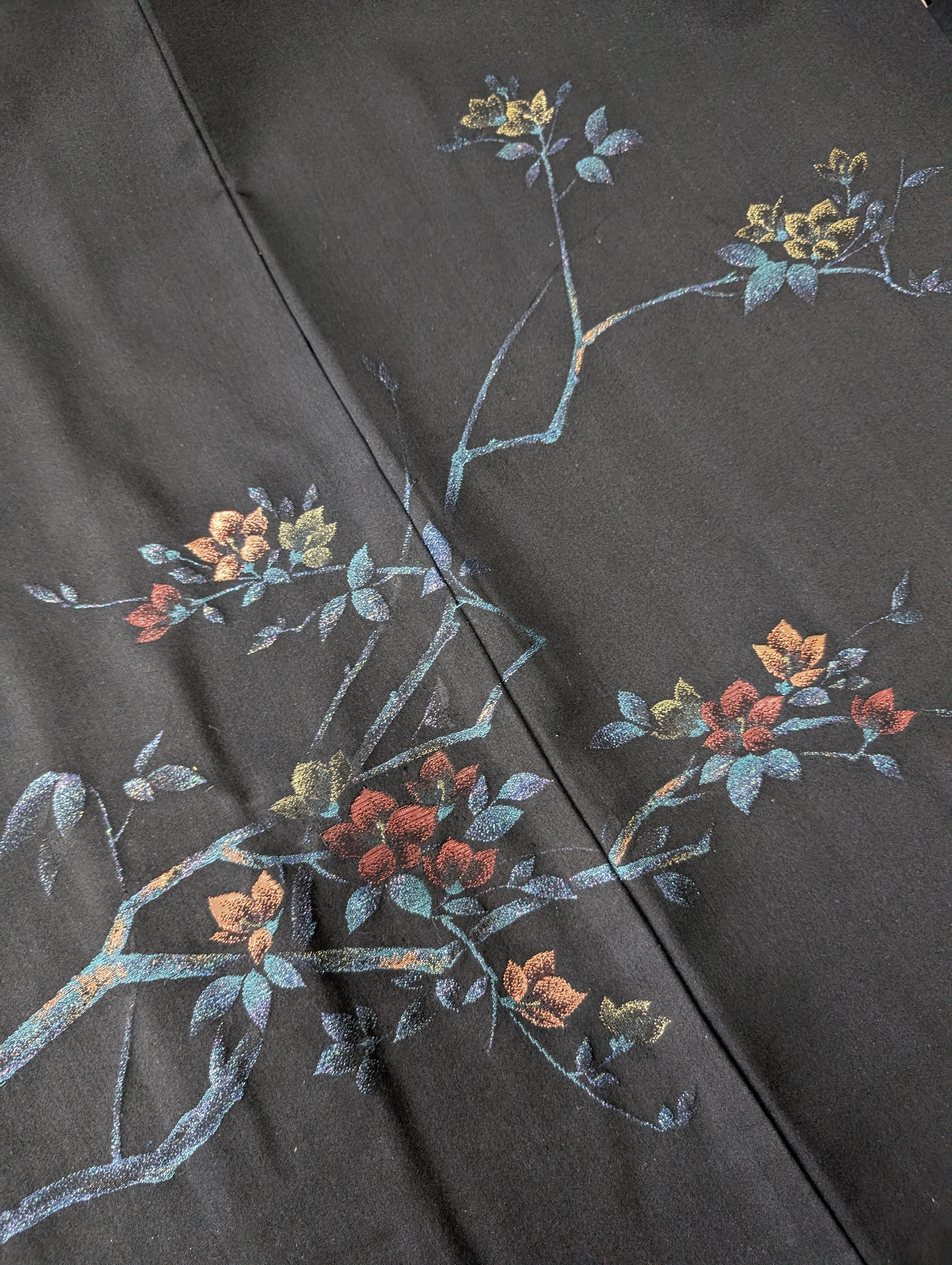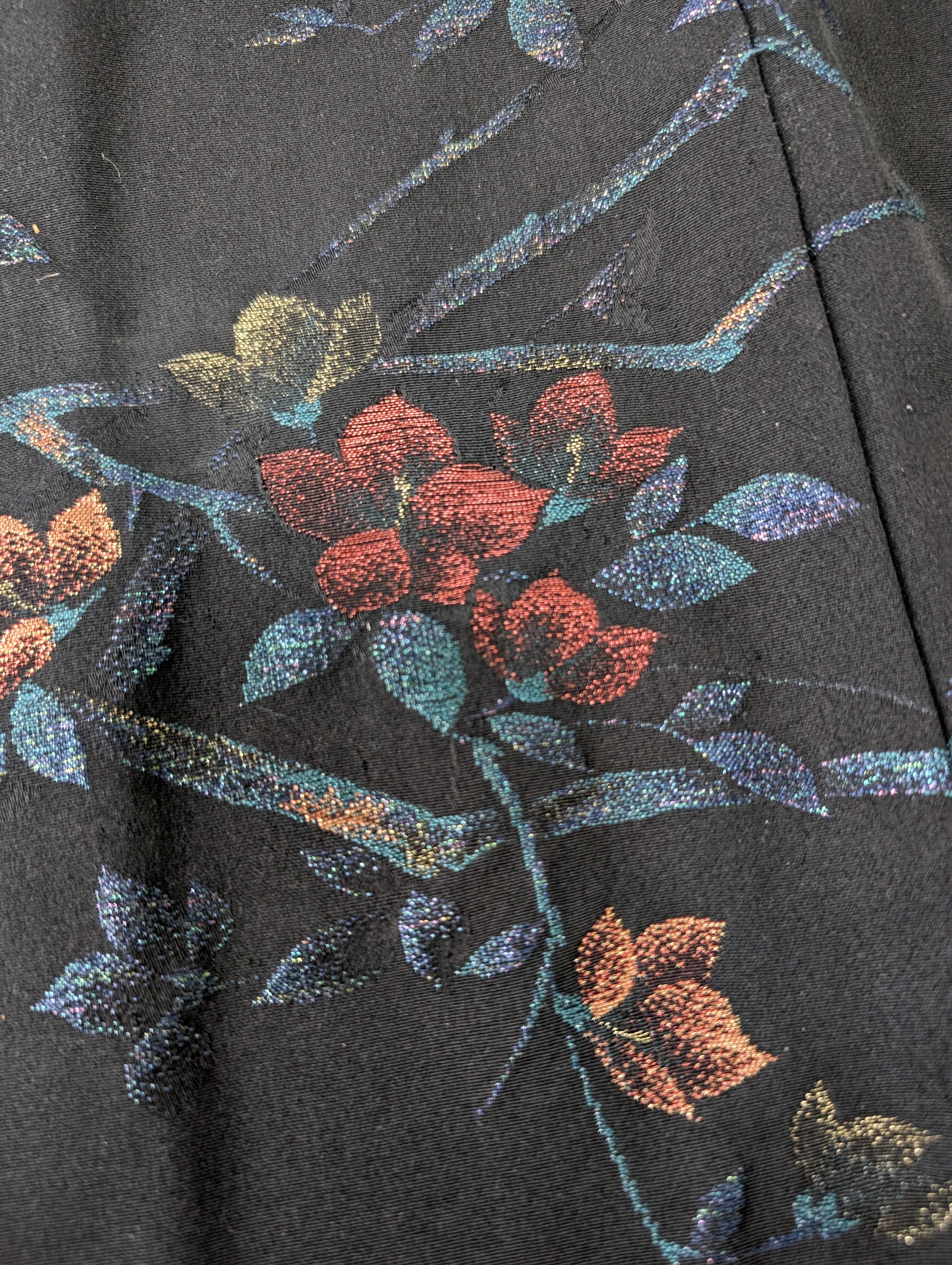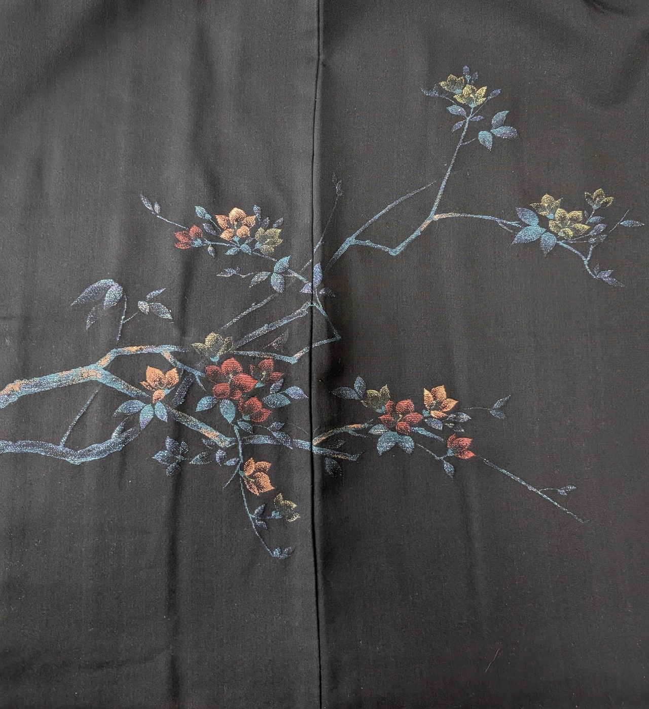 【14506】 ヴィンテージ 黒羽織 織り出し 樹木 花模様和洋折衷コーデ / Japanese vintage kimono black haori jacket