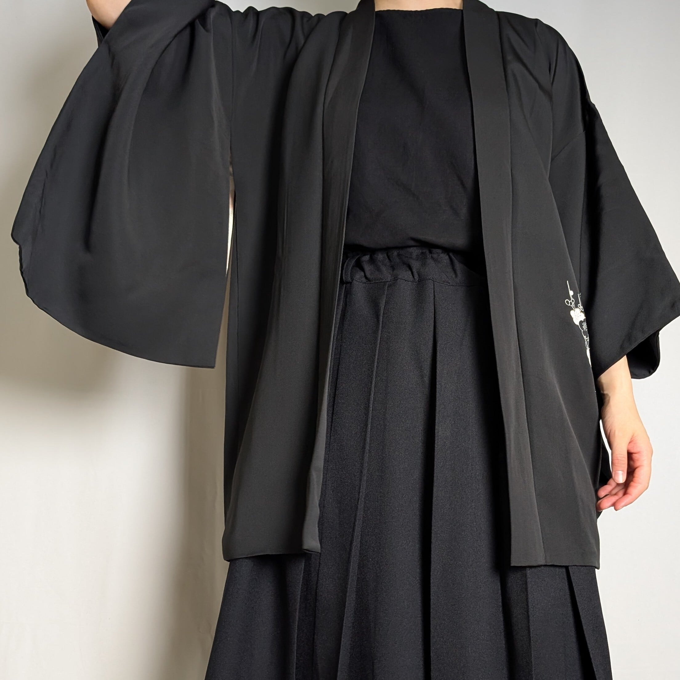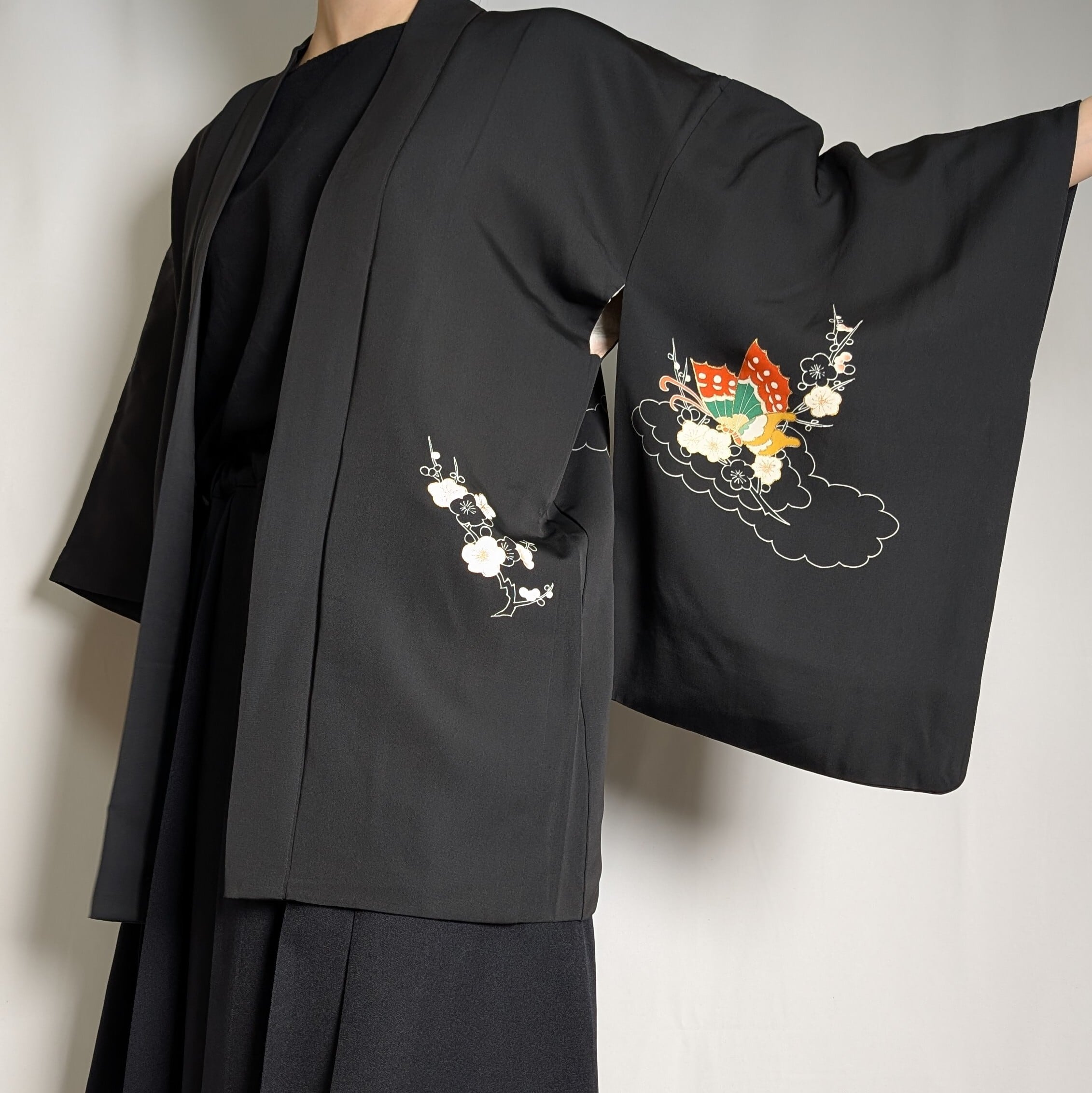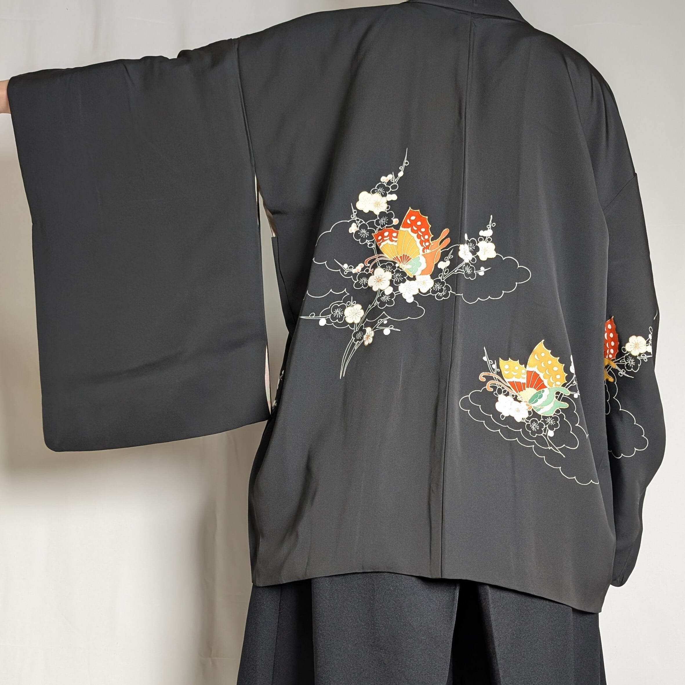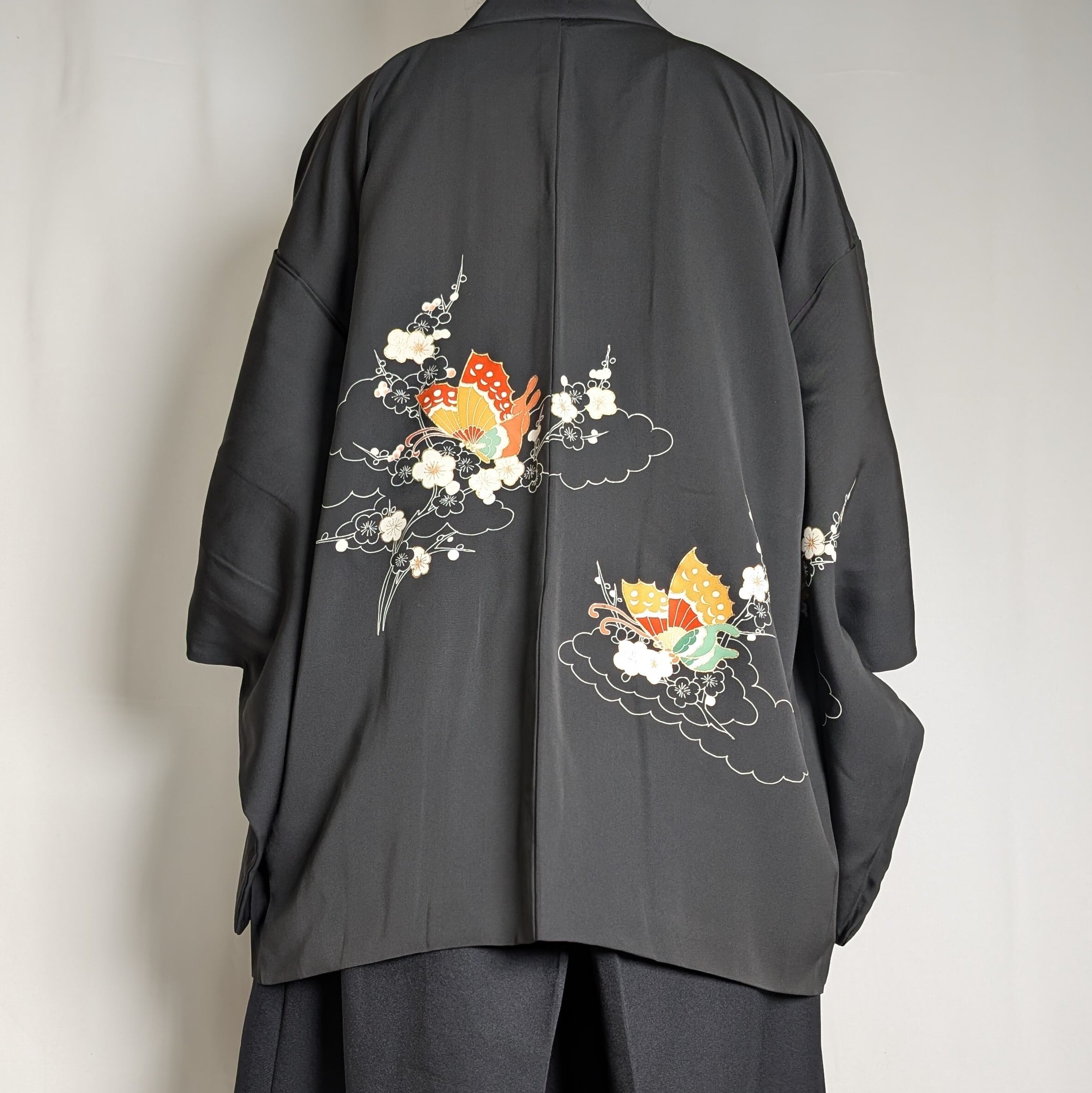 【14508】 ヴィンテージ 黒羽織 蝶々 梅 和洋折衷コーデ / Japanese vintage kimono black haori jacket
