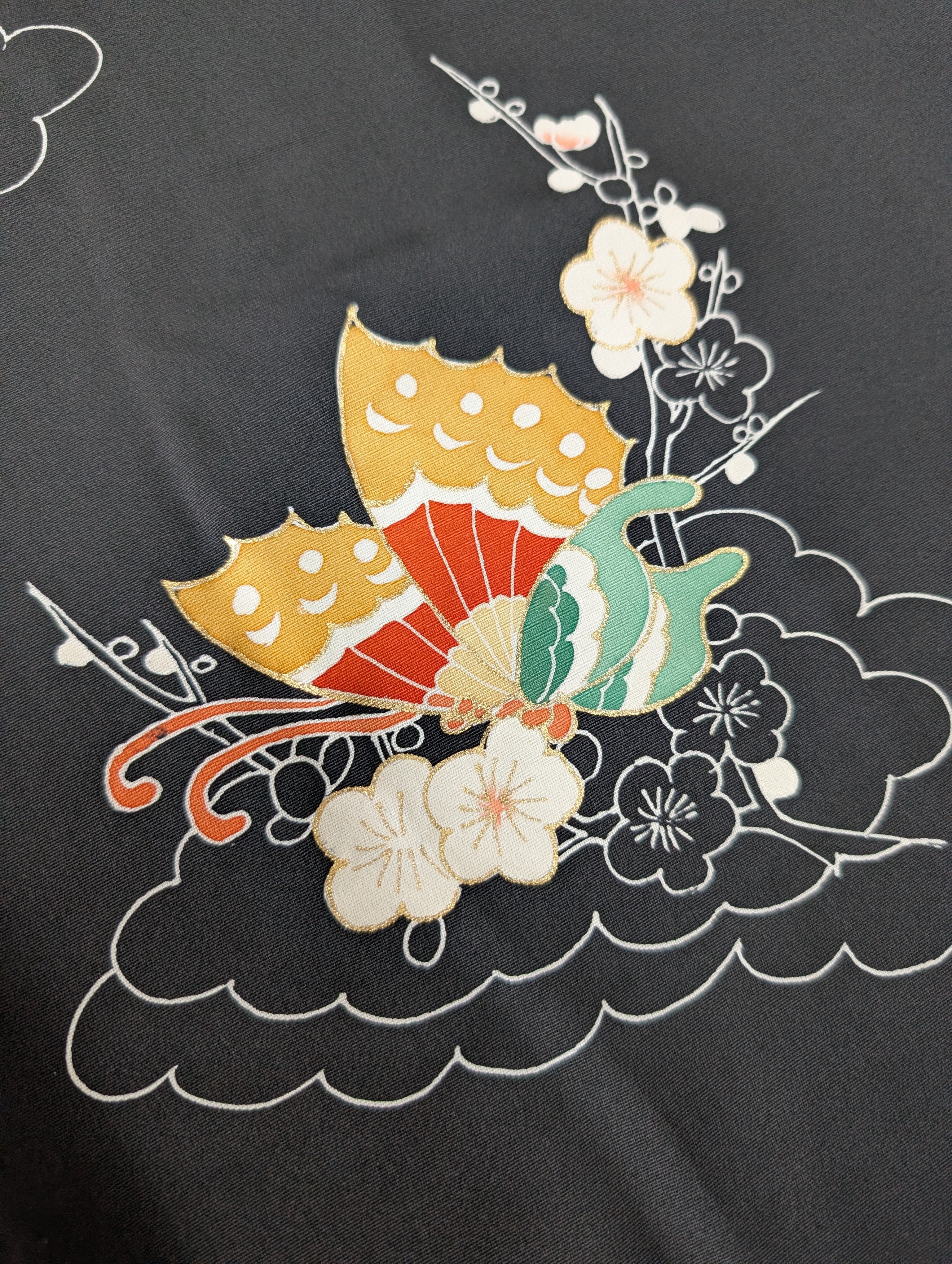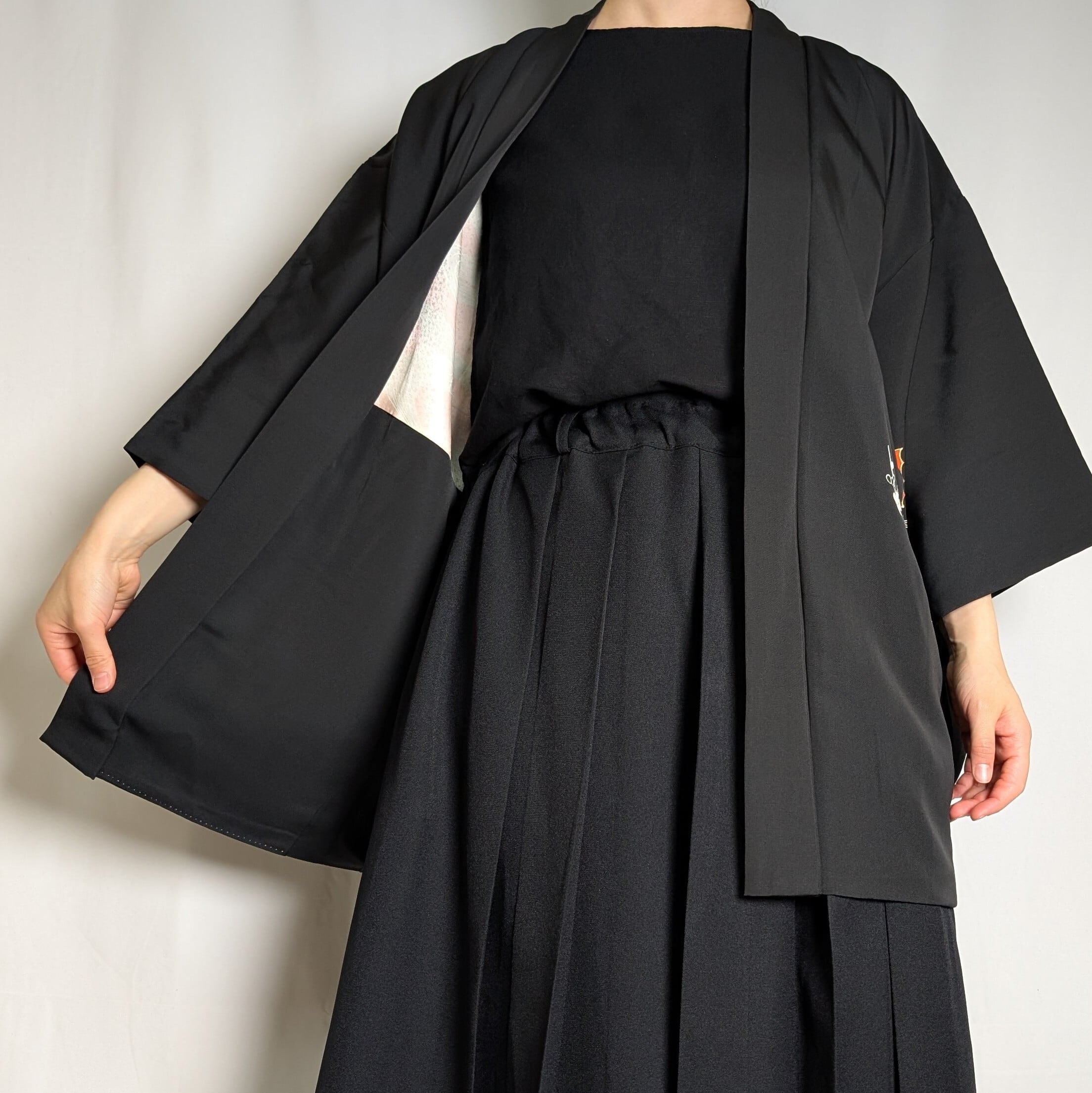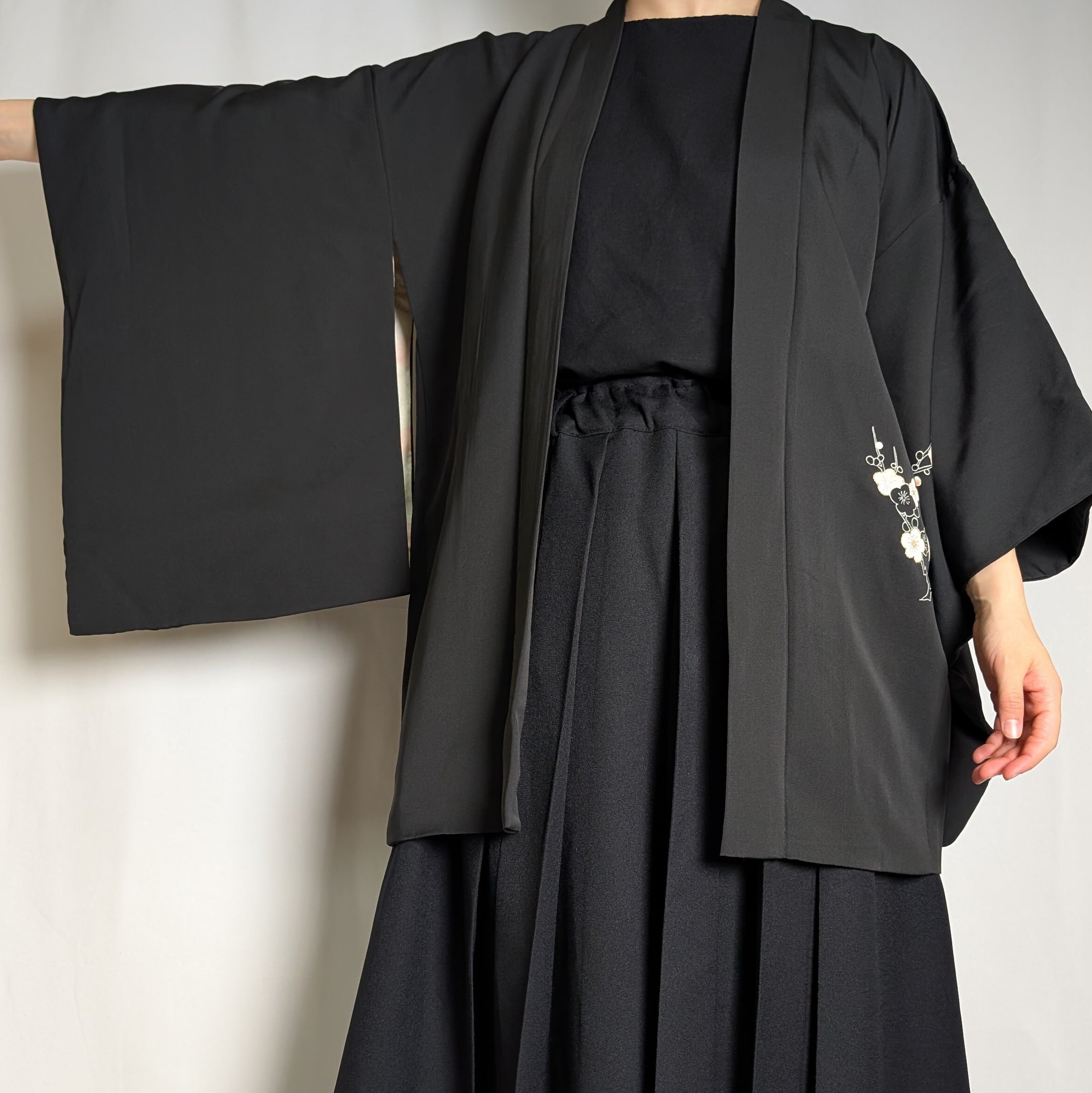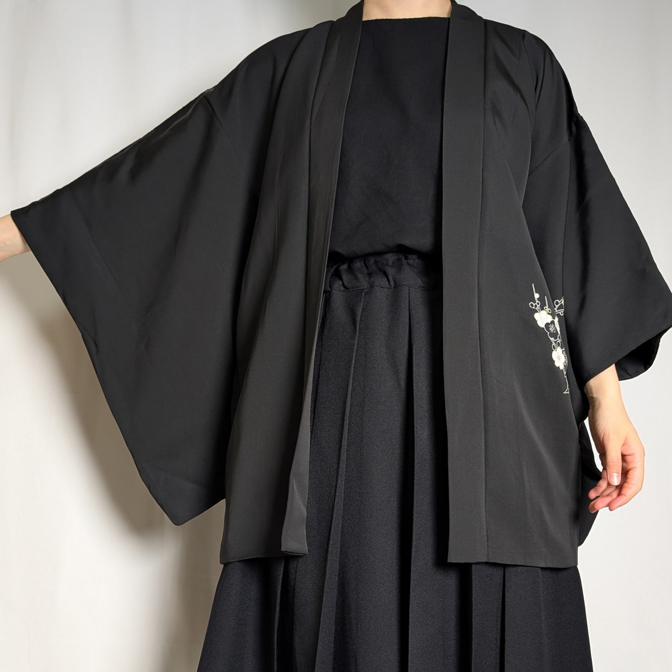 【14508】 ヴィンテージ 黒羽織 蝶々 梅 和洋折衷コーデ / Japanese vintage kimono black haori jacket