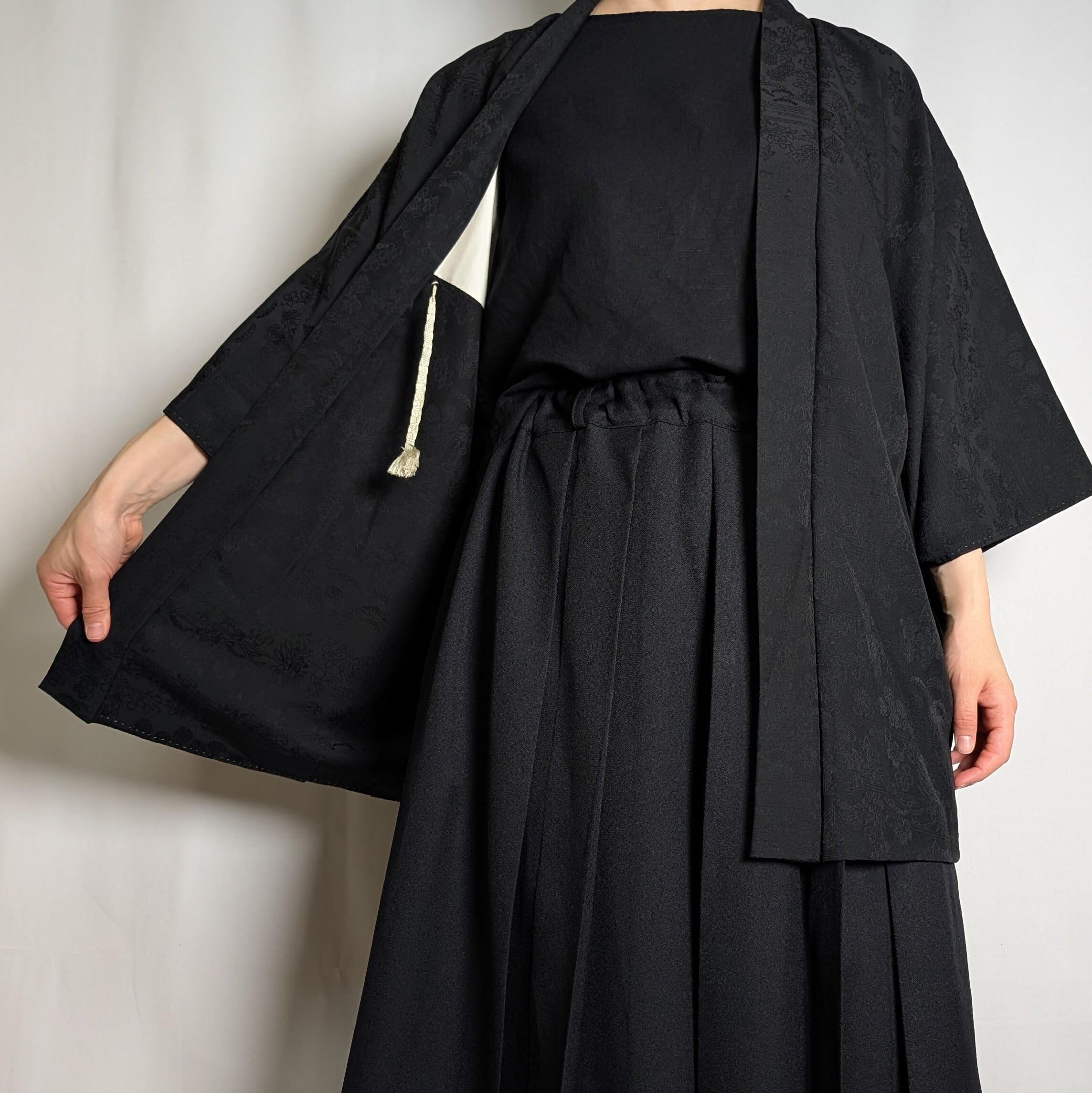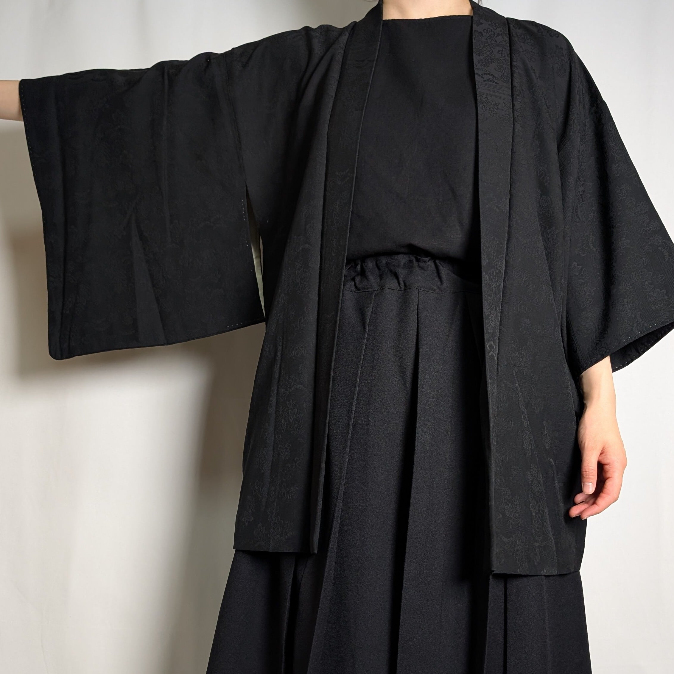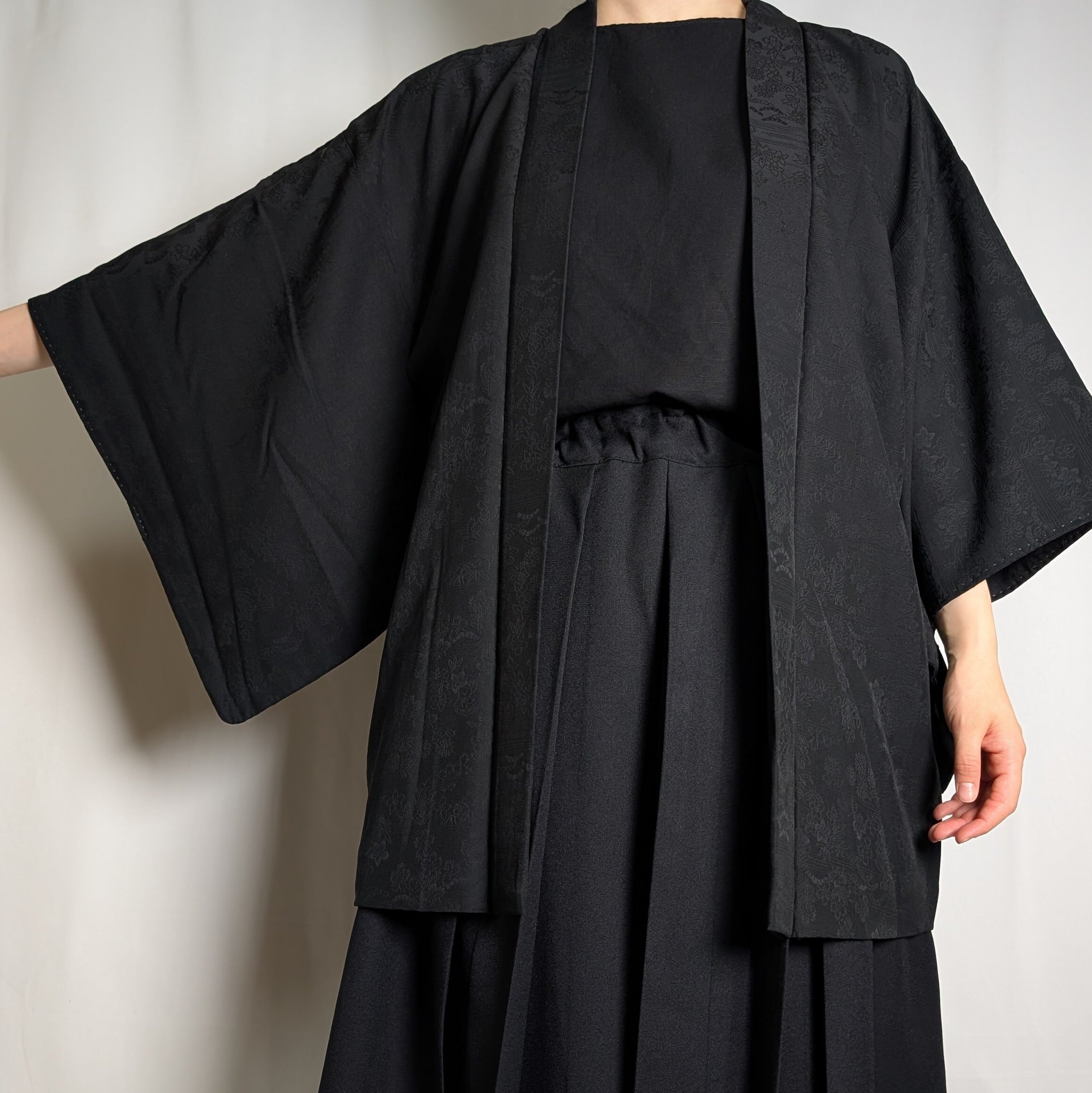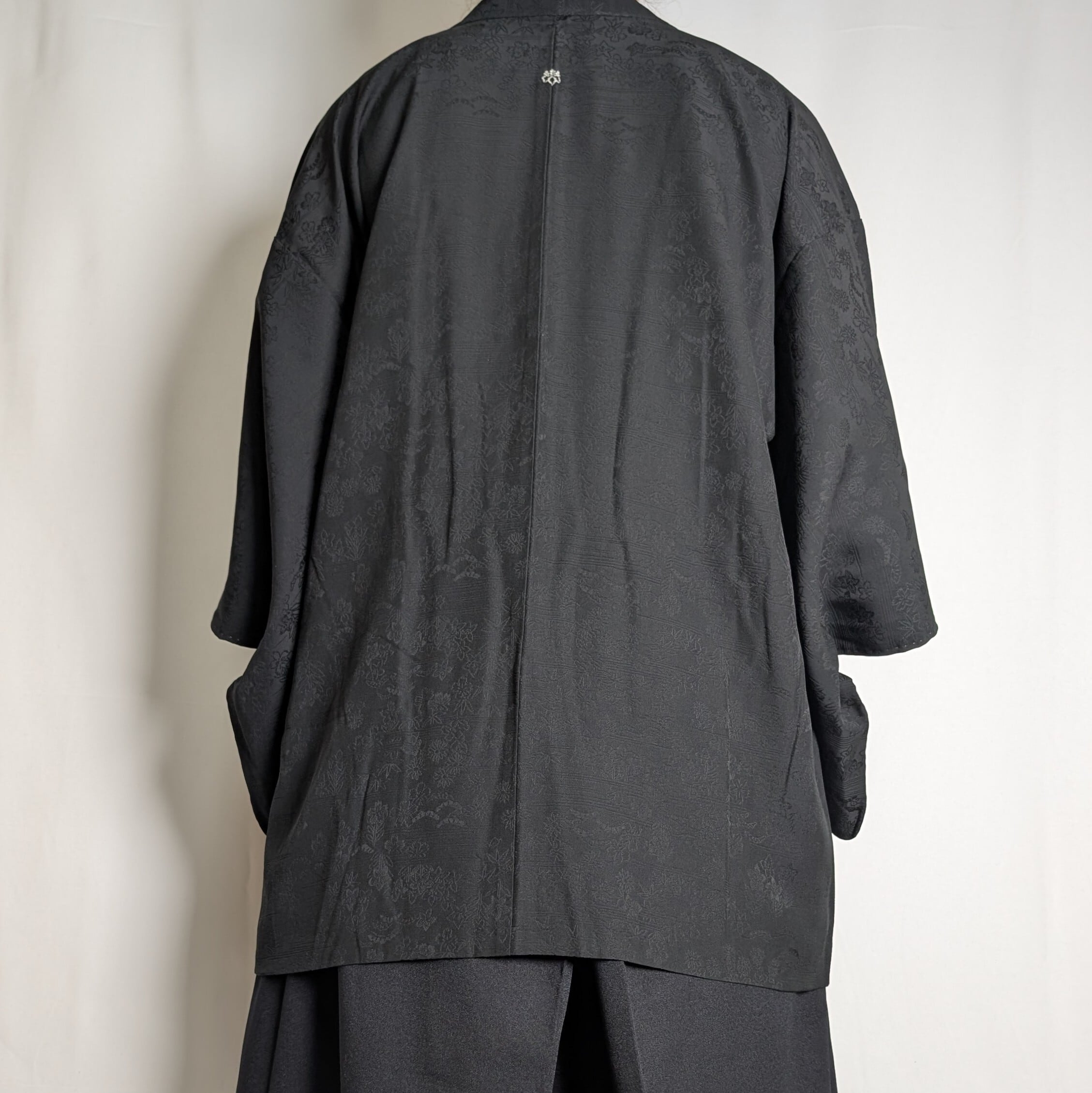 【14511】 ヴィンテージ 黒羽織 地模様 花 松 和洋折衷コーデ / Japanese vintage kimono black haori jacket