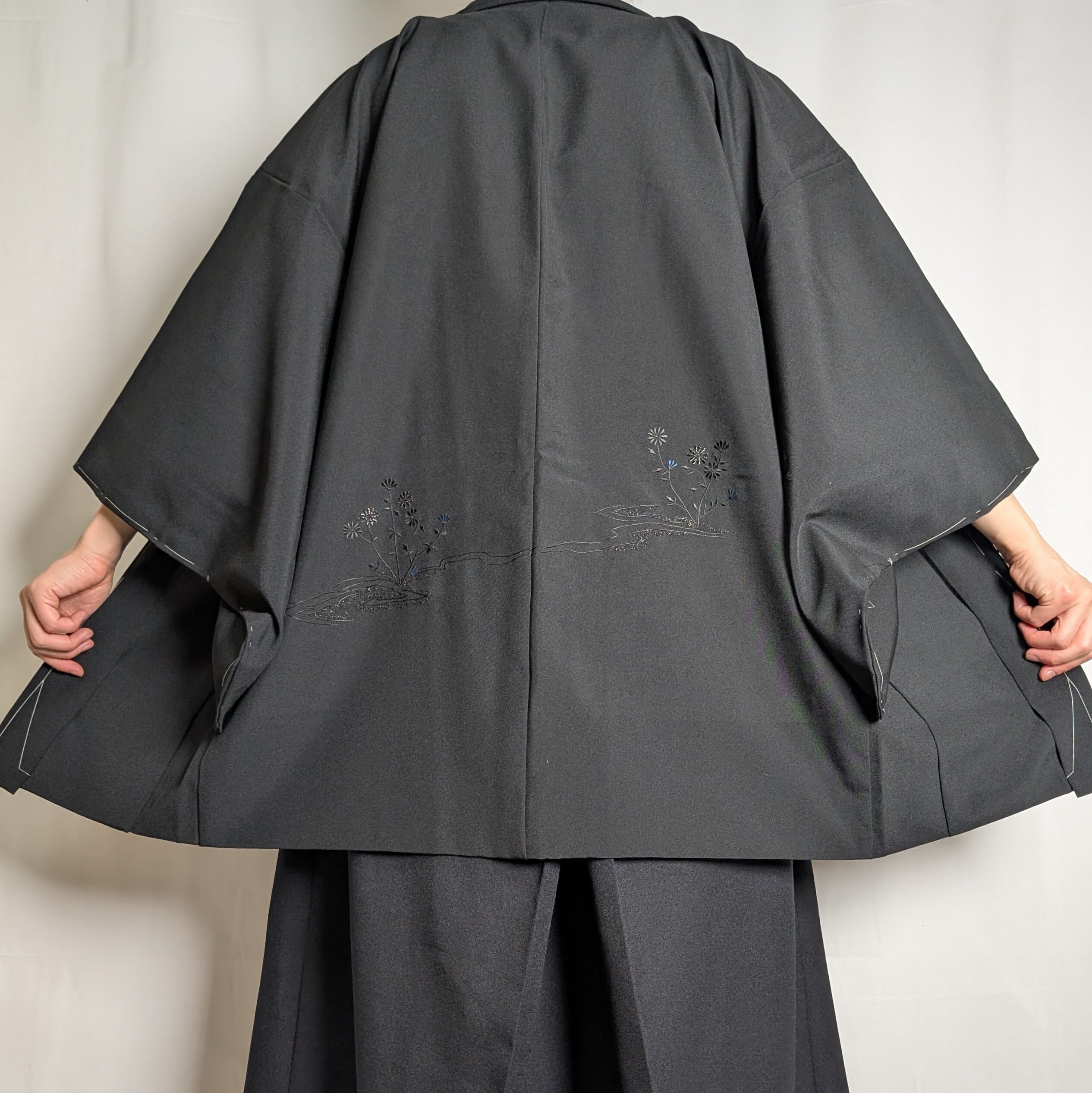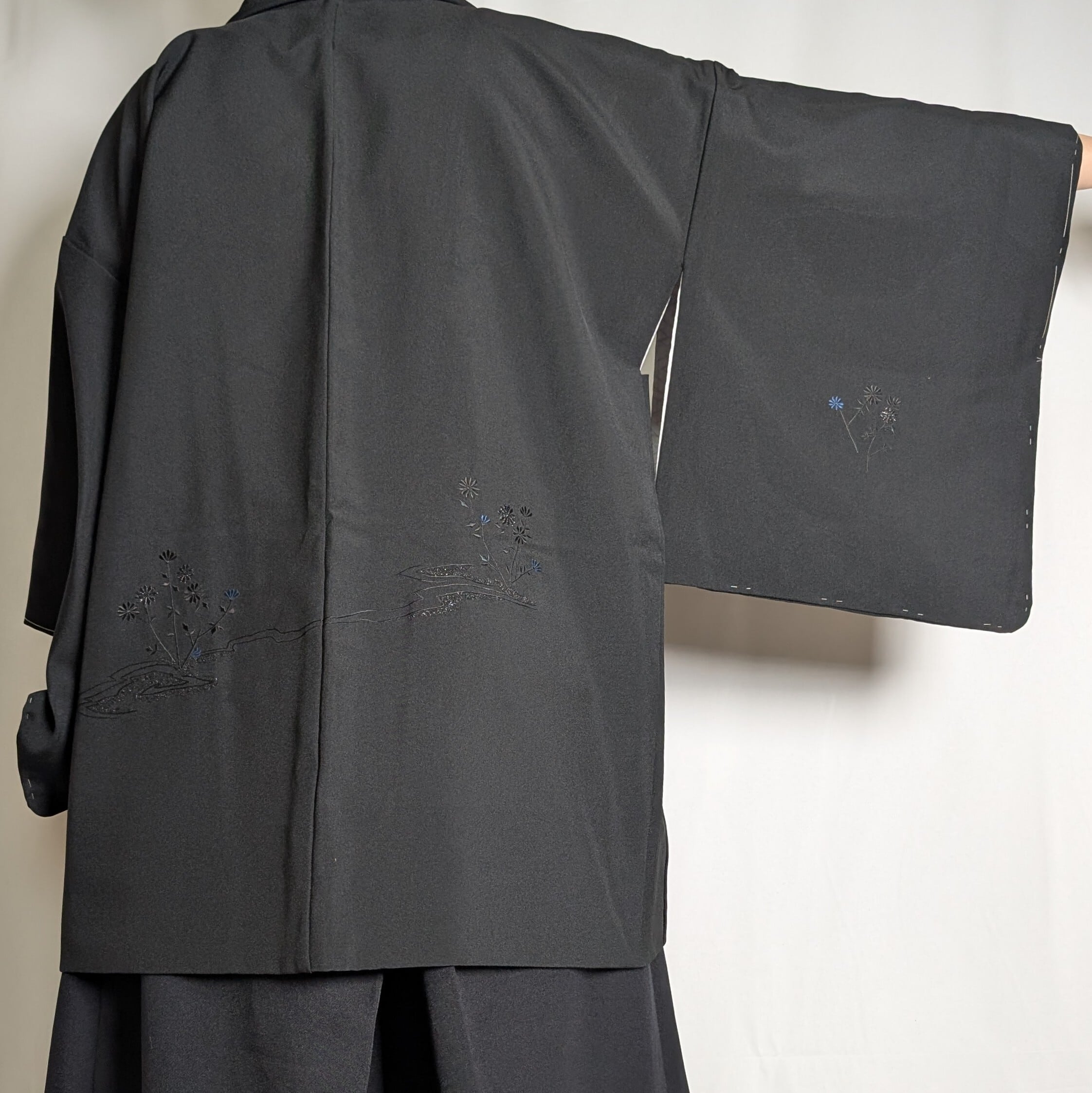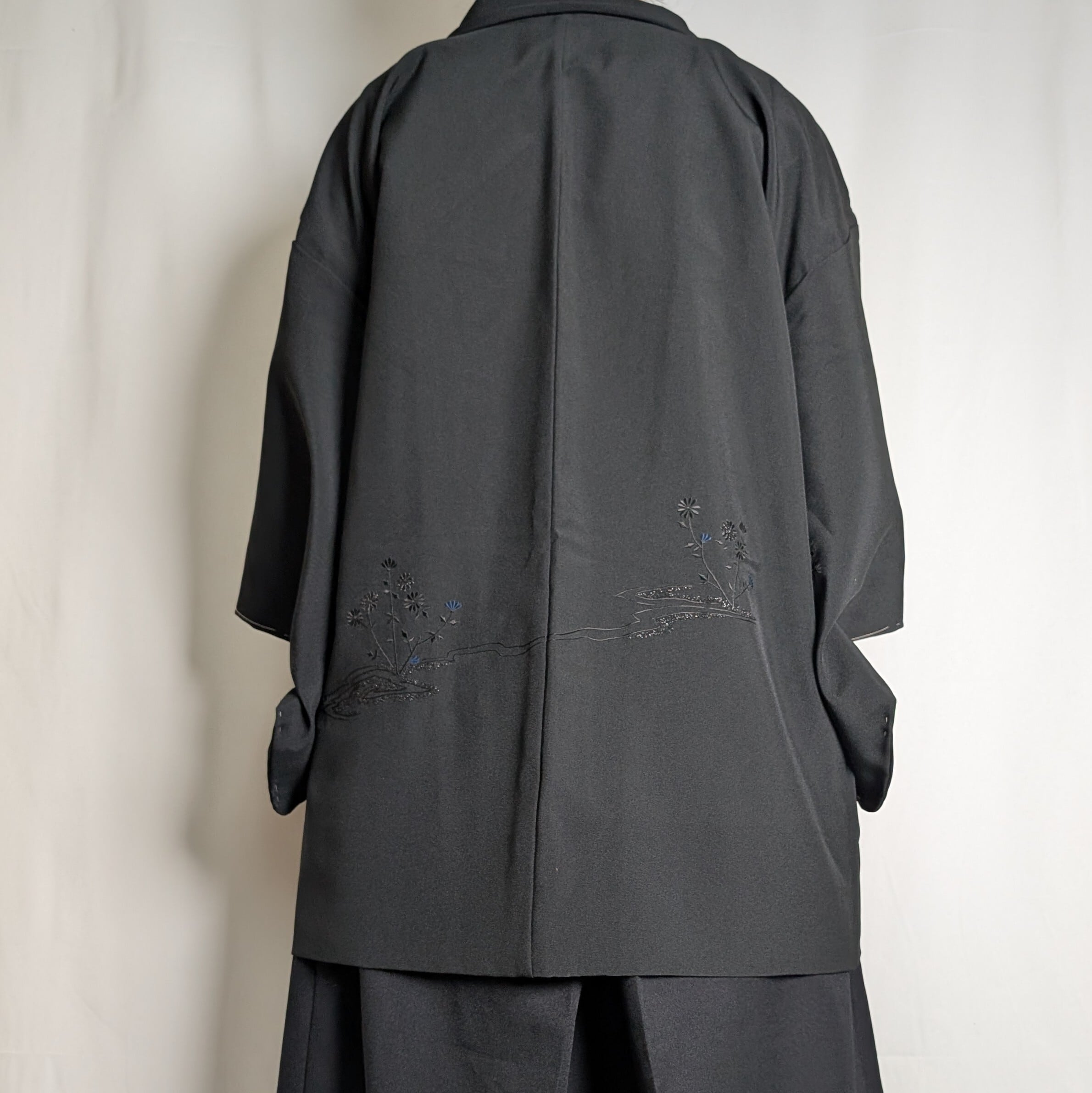 【14513】 ヴィンテージ 黒羽織 刺繍 花模様 黒 青 和洋折衷コーデ / Japanese vintage kimono black haori jacket