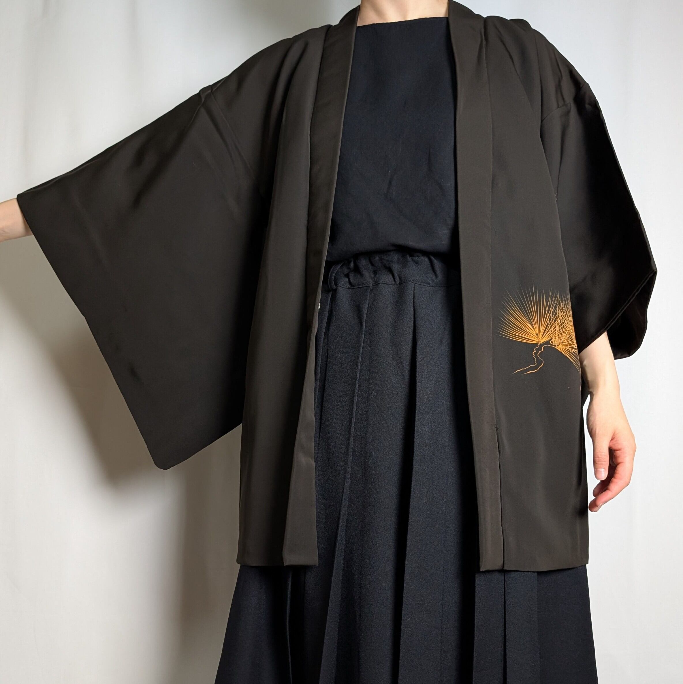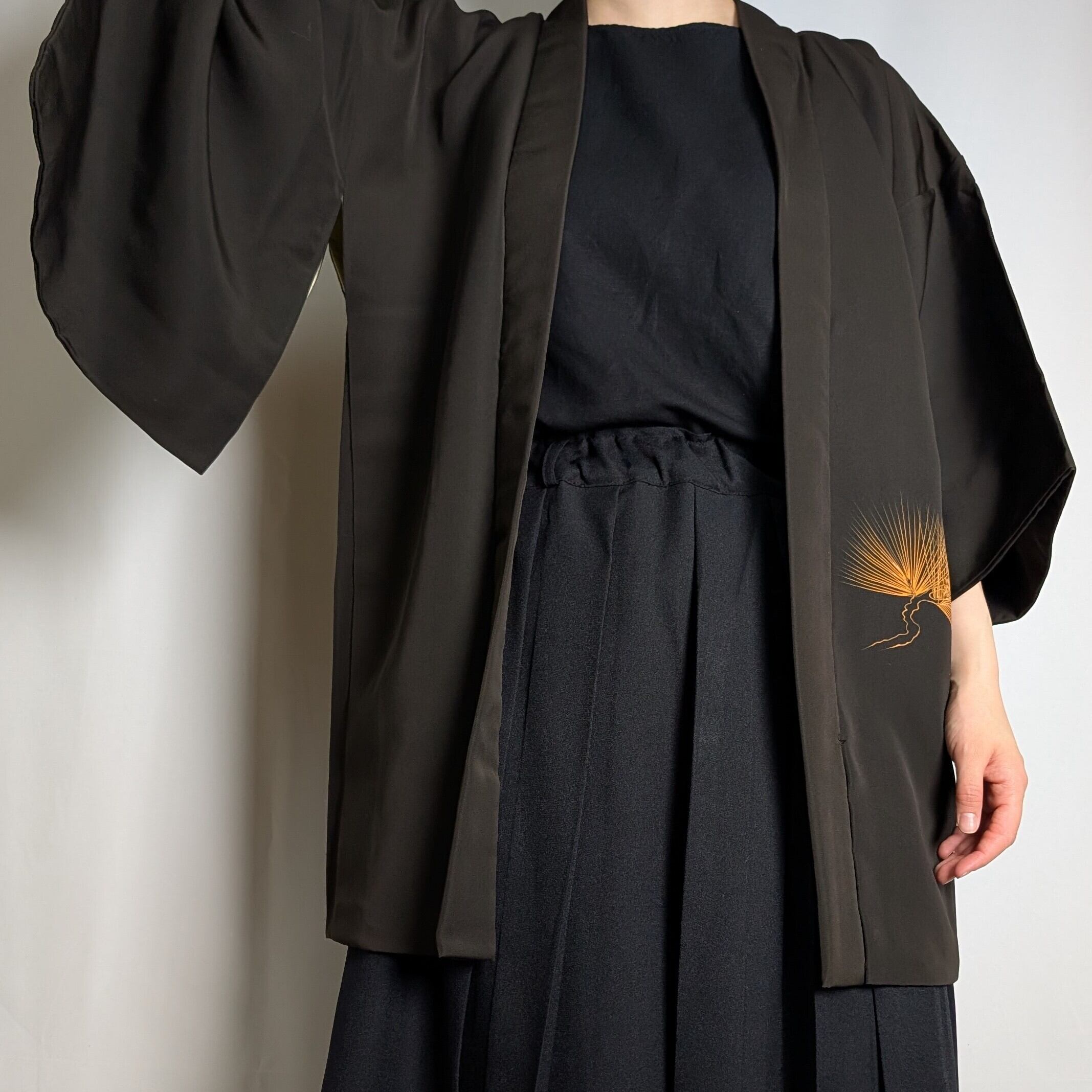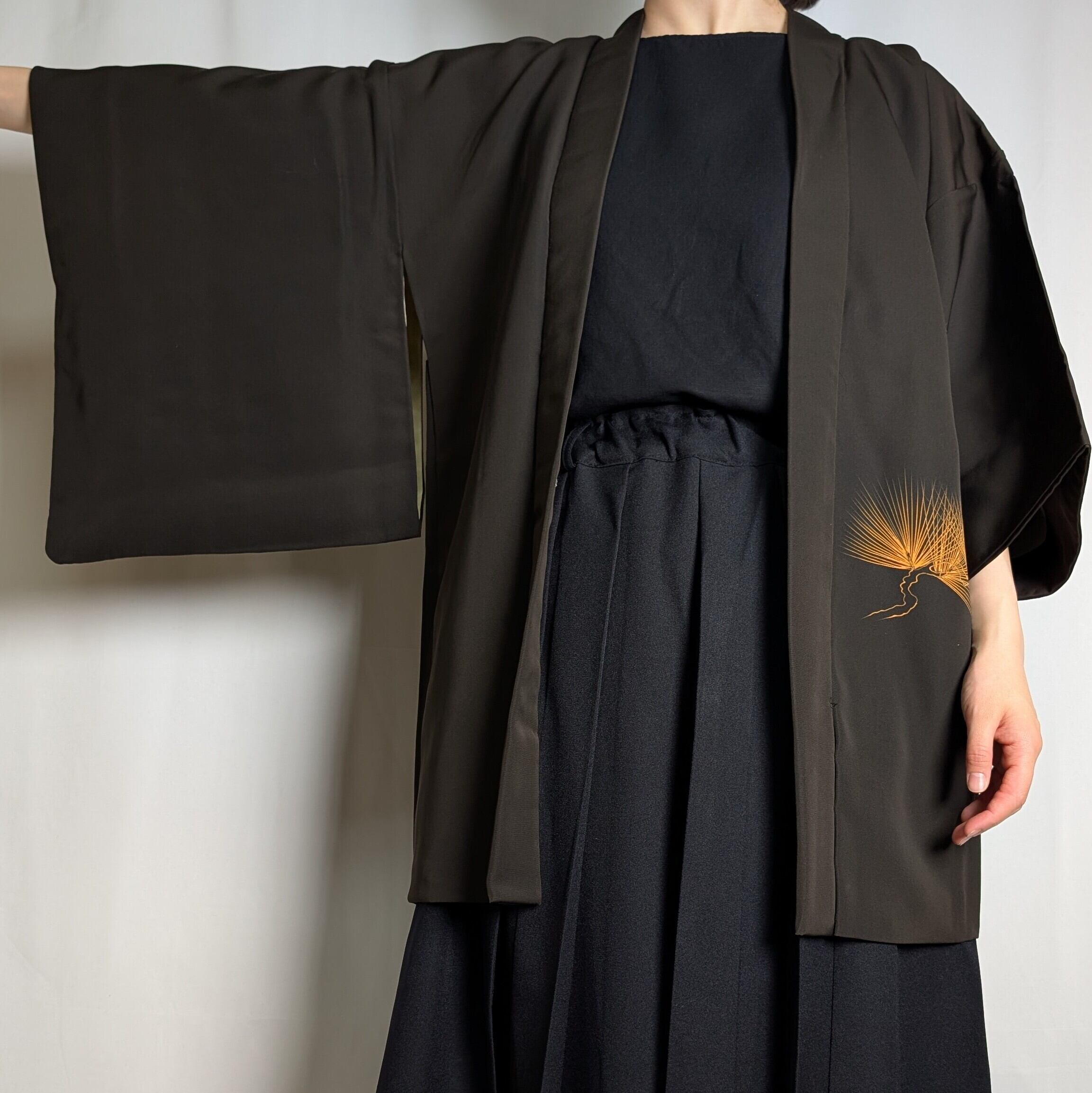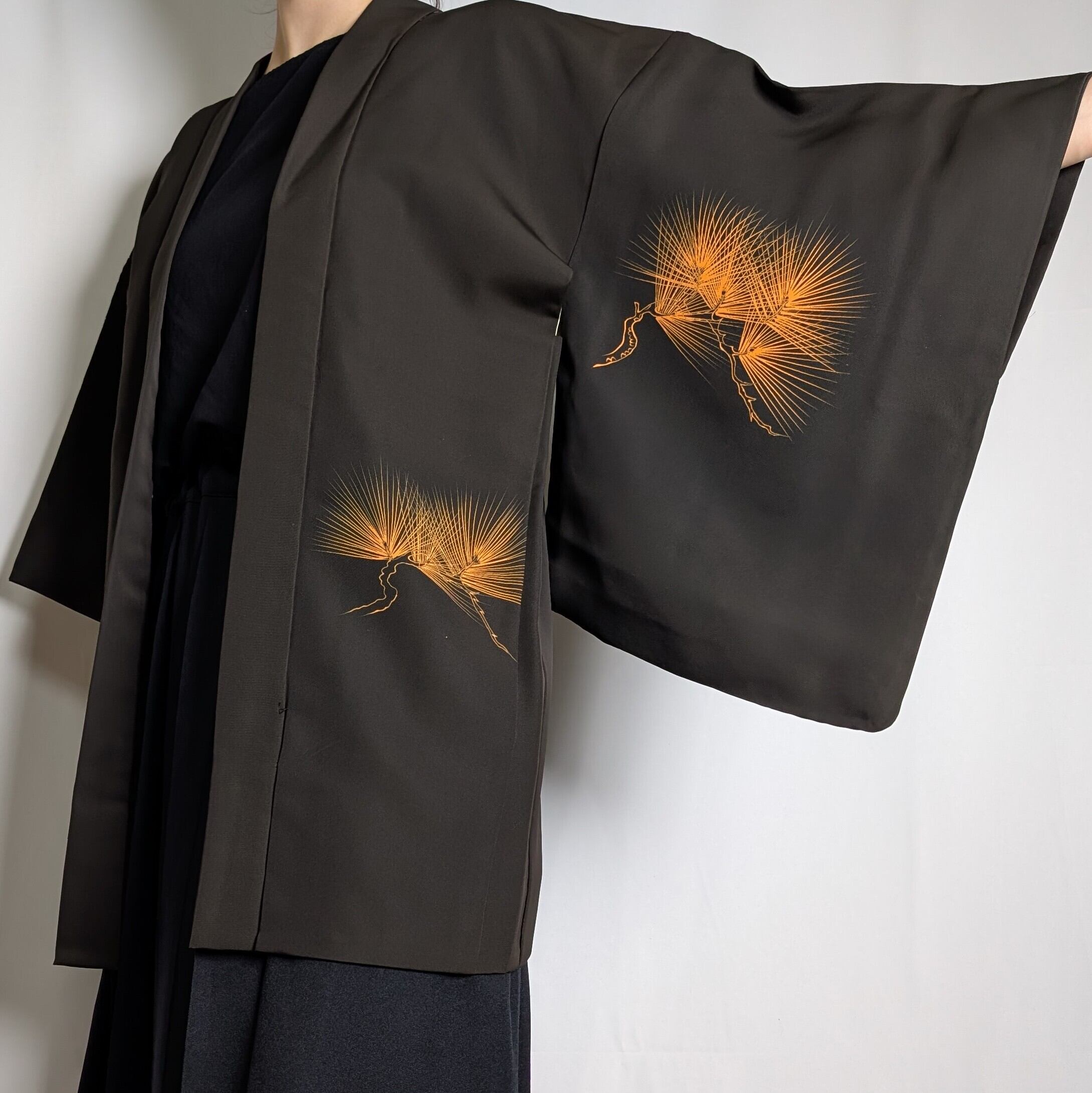 【14515】 ヴィンテージ 羽織 茶色 松模様 刺繍 オレンジ 和洋折衷コーデ / Japanese vintage kimono black haori jacket