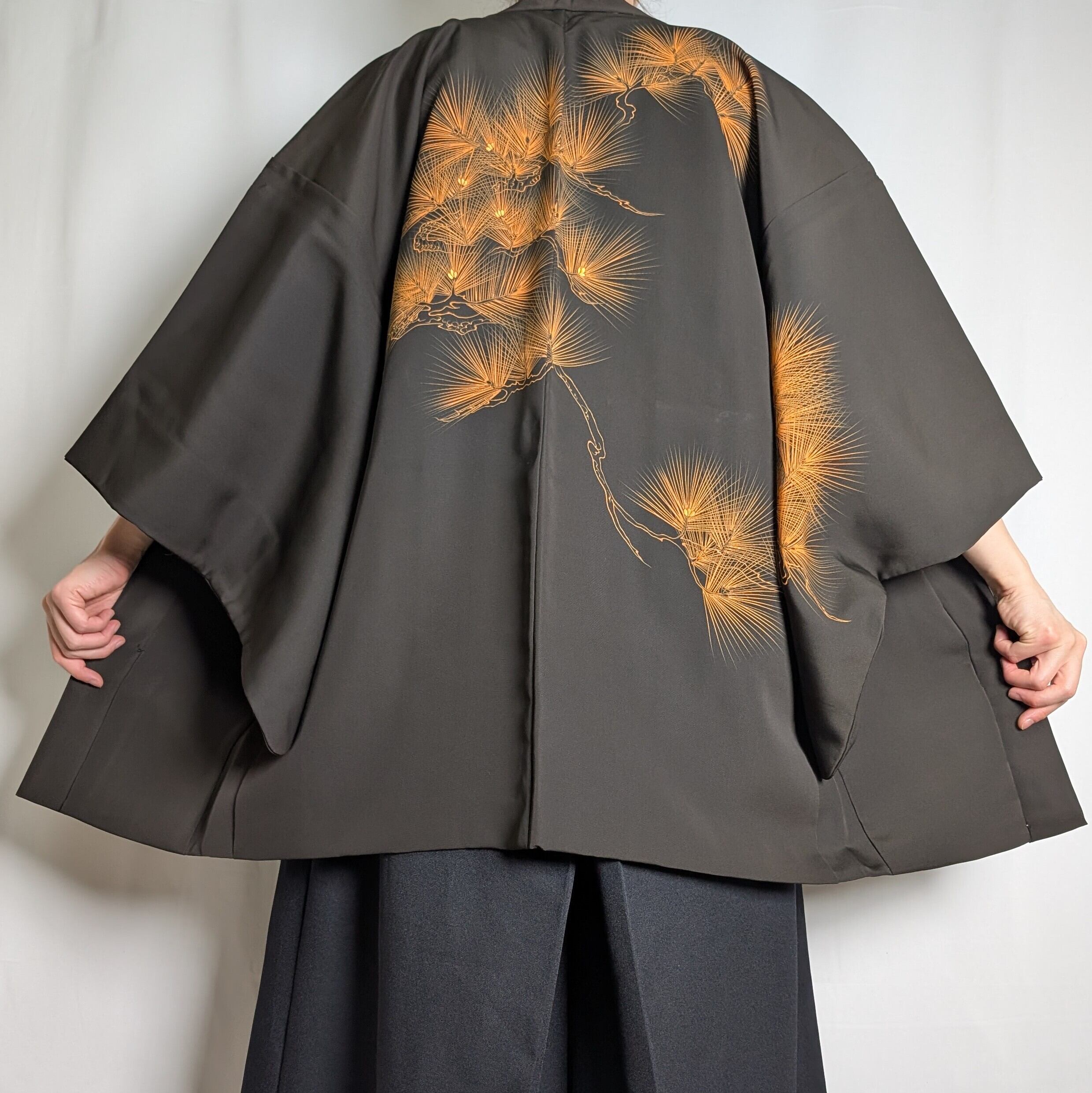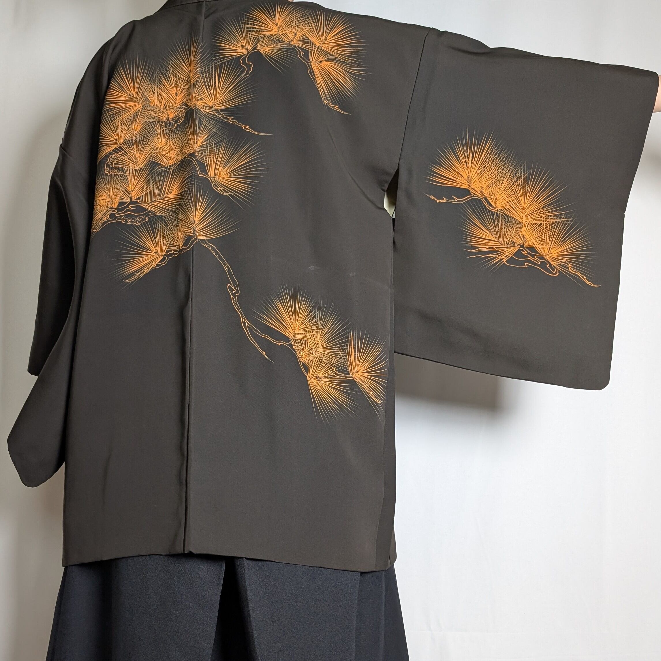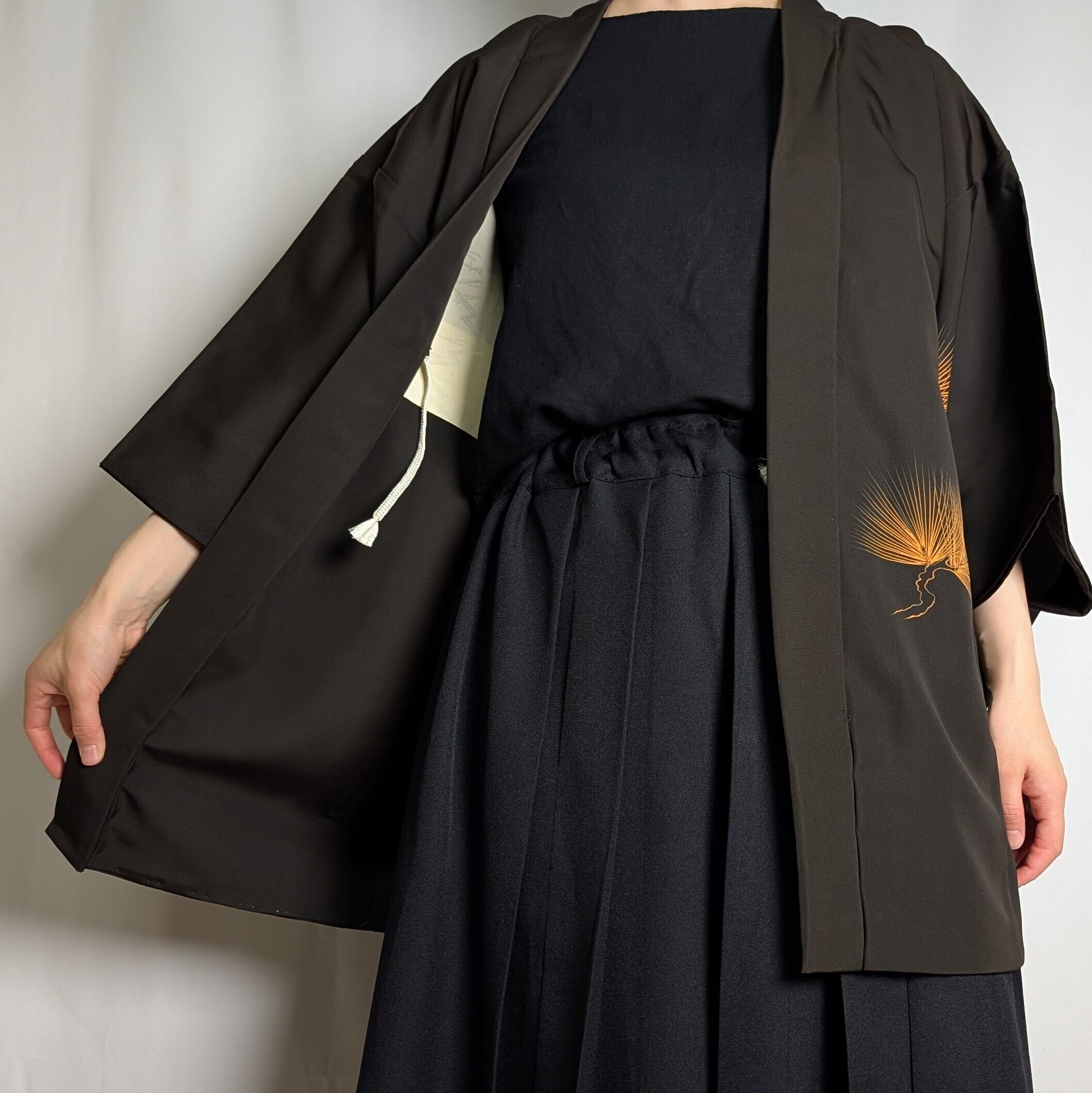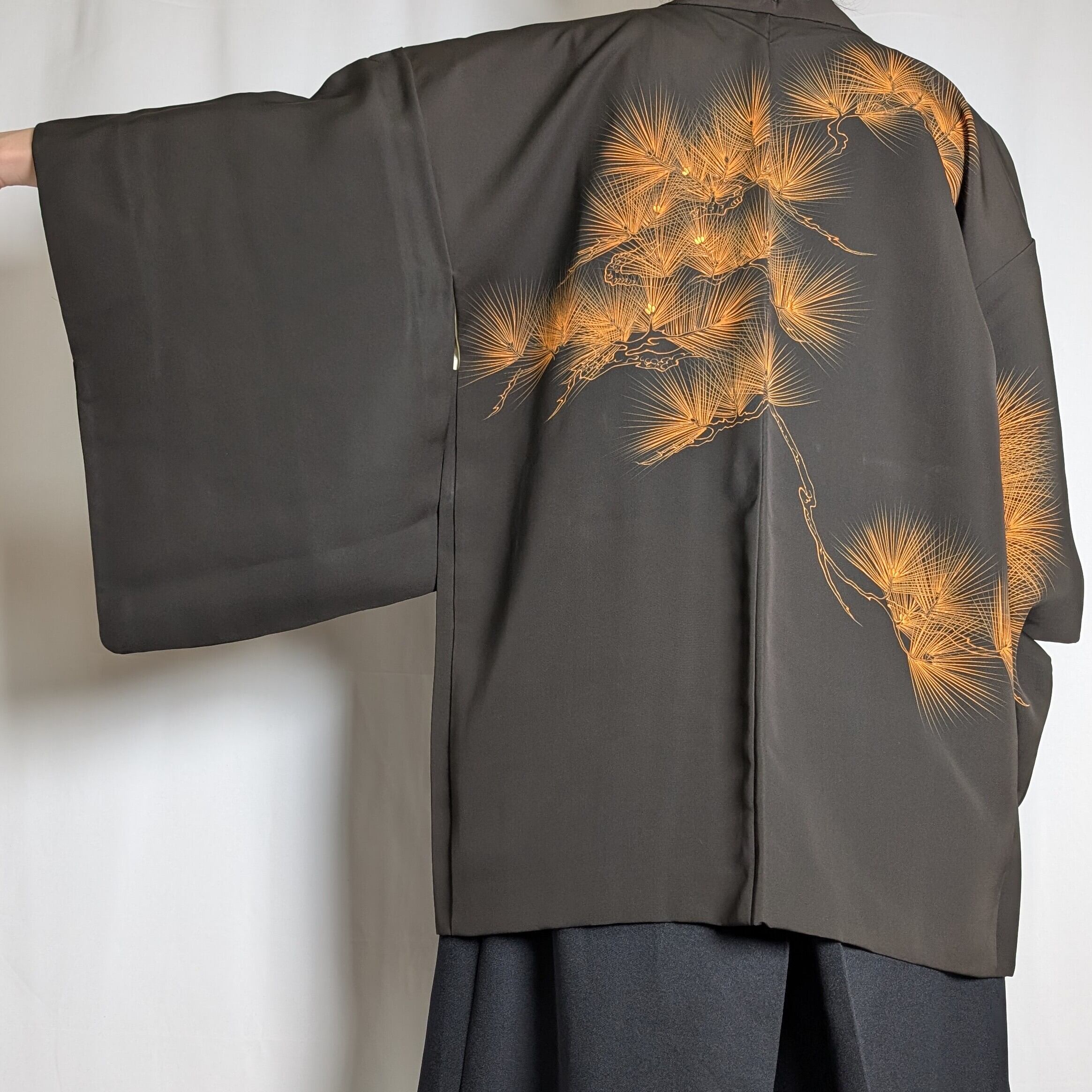 【14515】 ヴィンテージ 羽織 茶色 松模様 刺繍 オレンジ 和洋折衷コーデ / Japanese vintage kimono black haori jacket