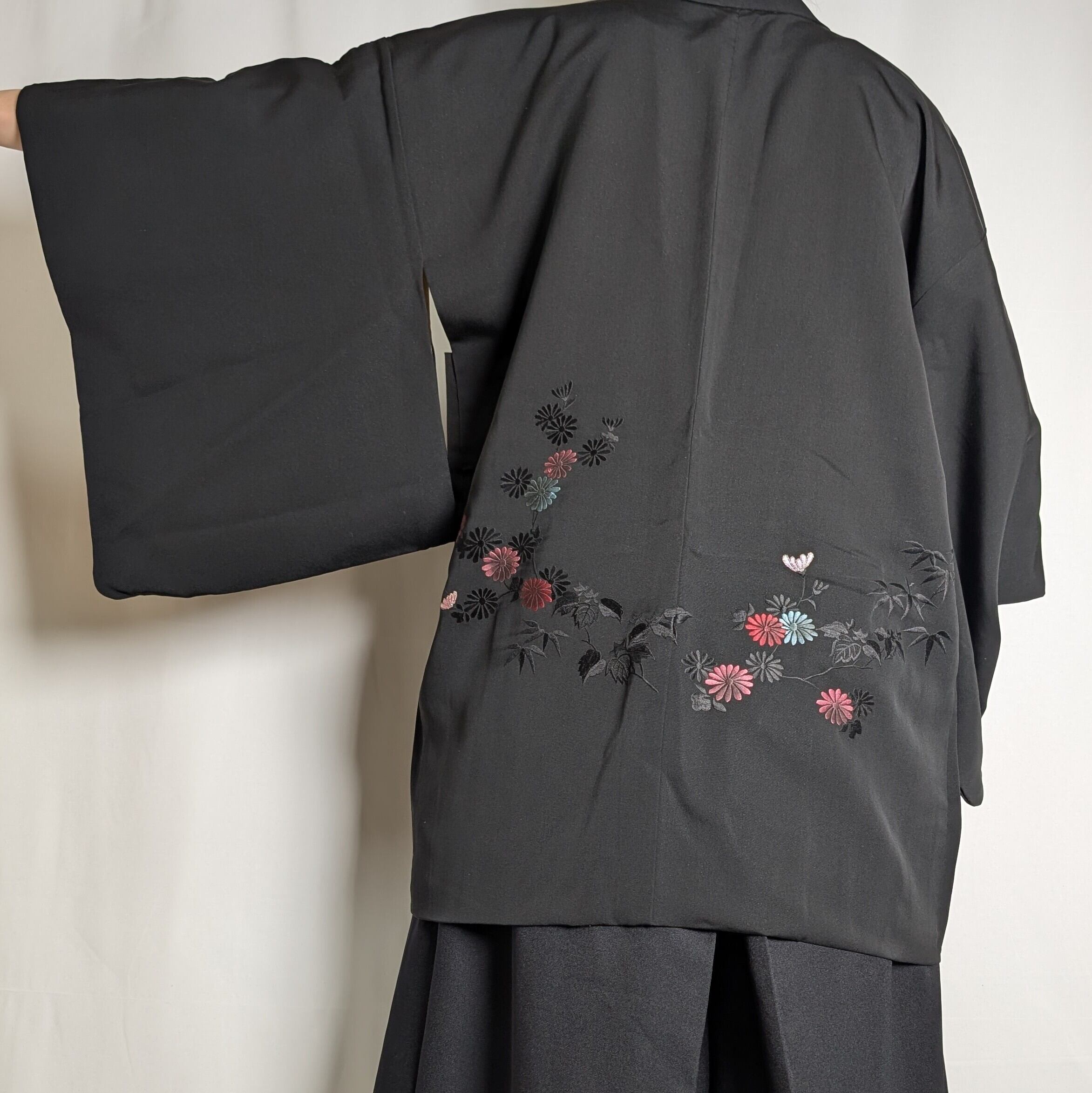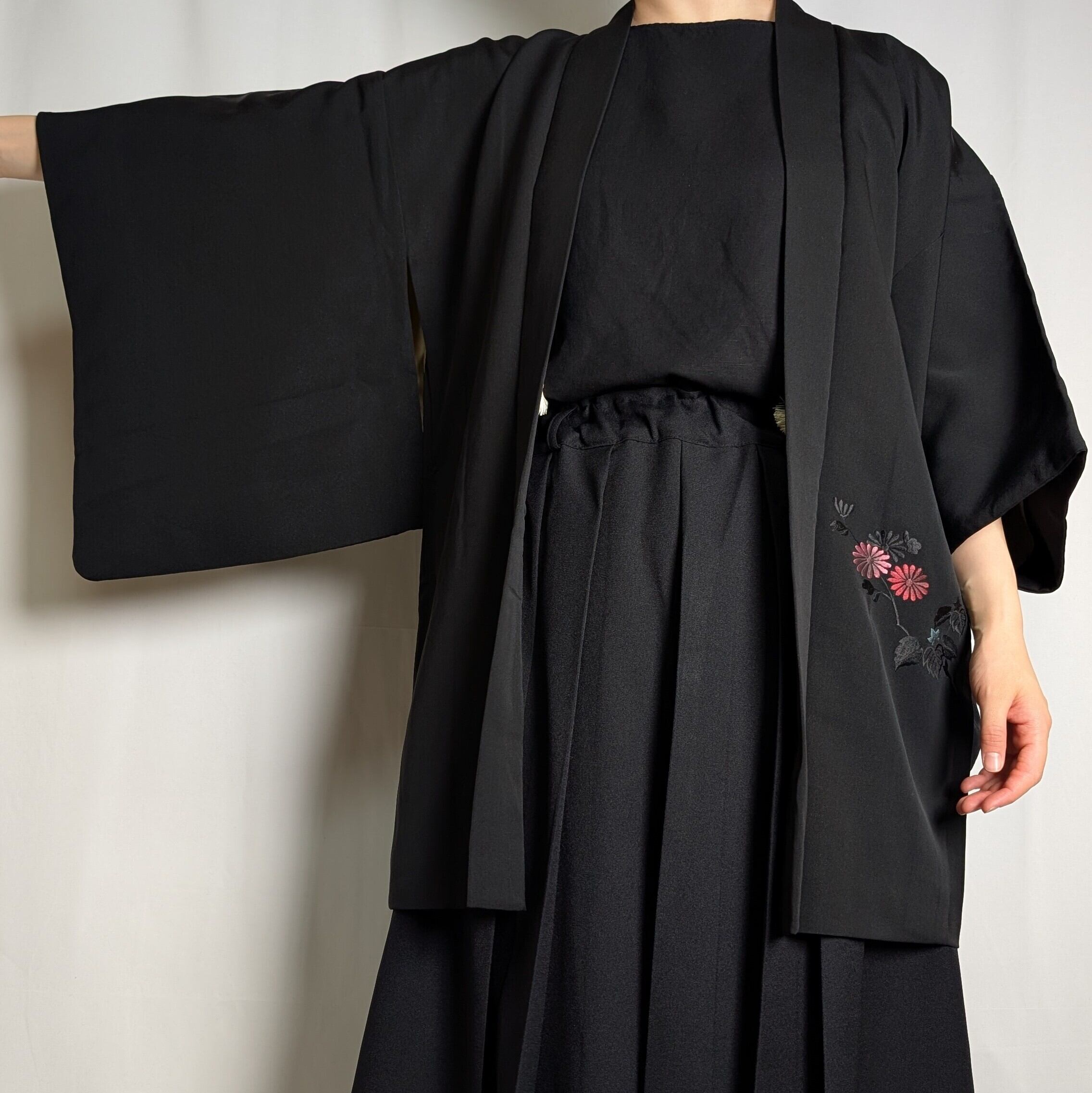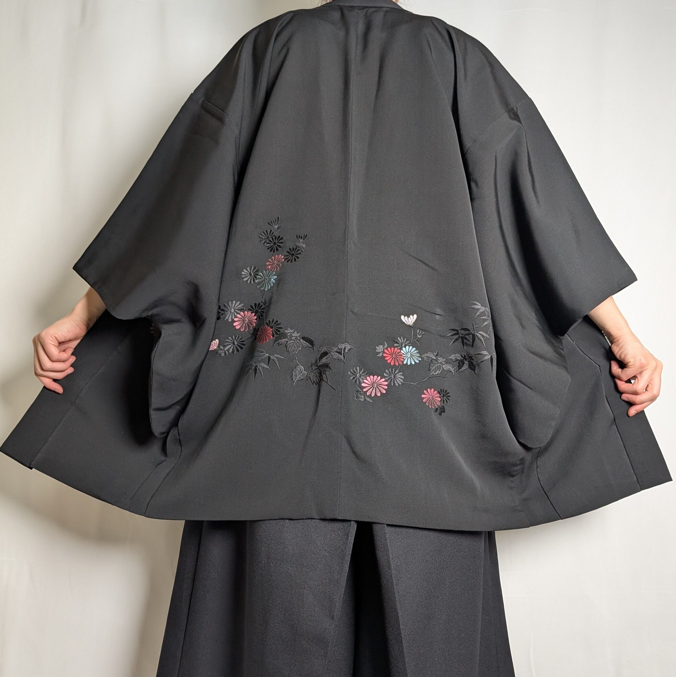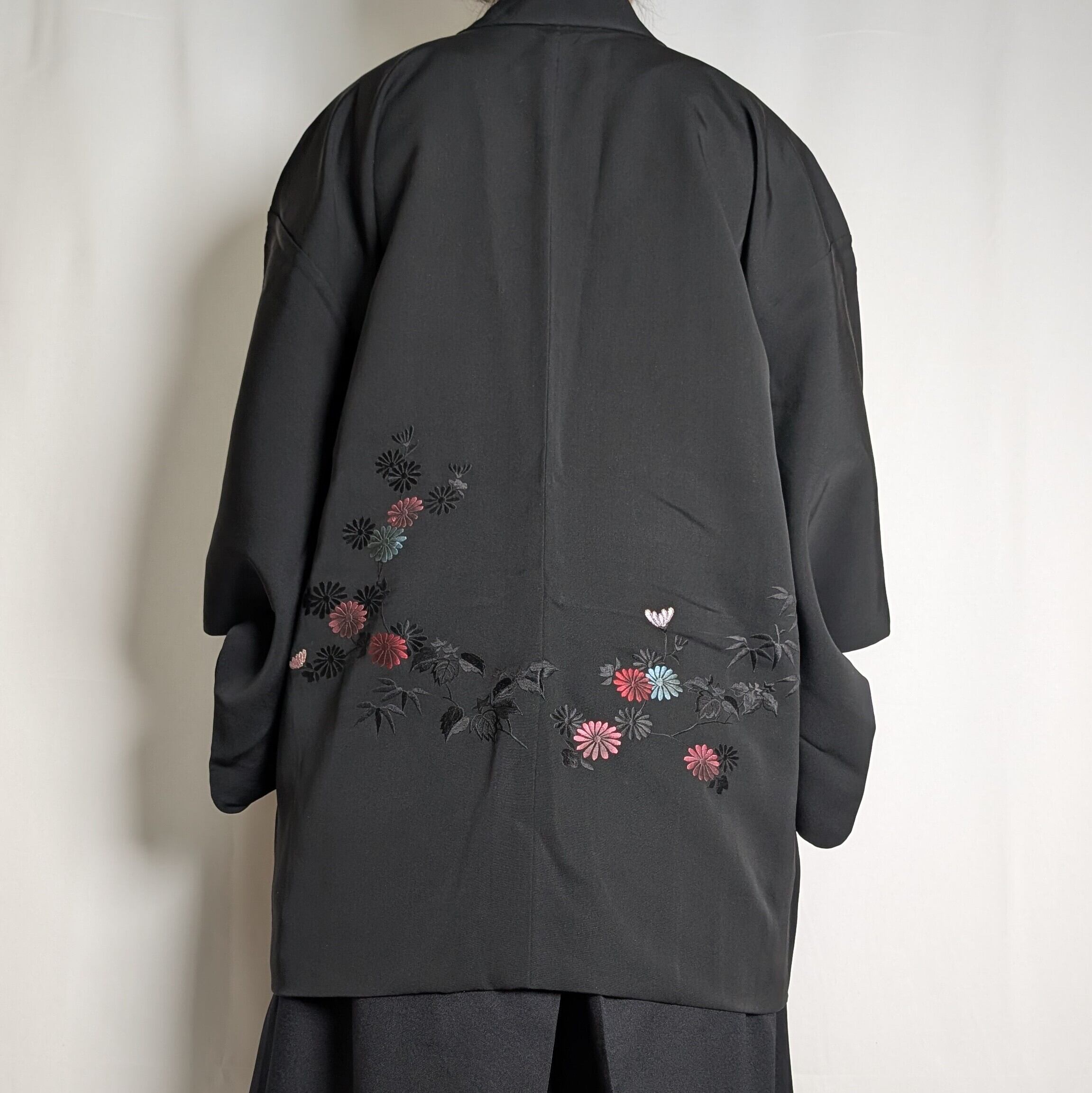 【14520】 ヴィンテージ 黒羽織 刺繍 菊 和洋折衷コーデ / Japanese vintage kimono black haori jacket