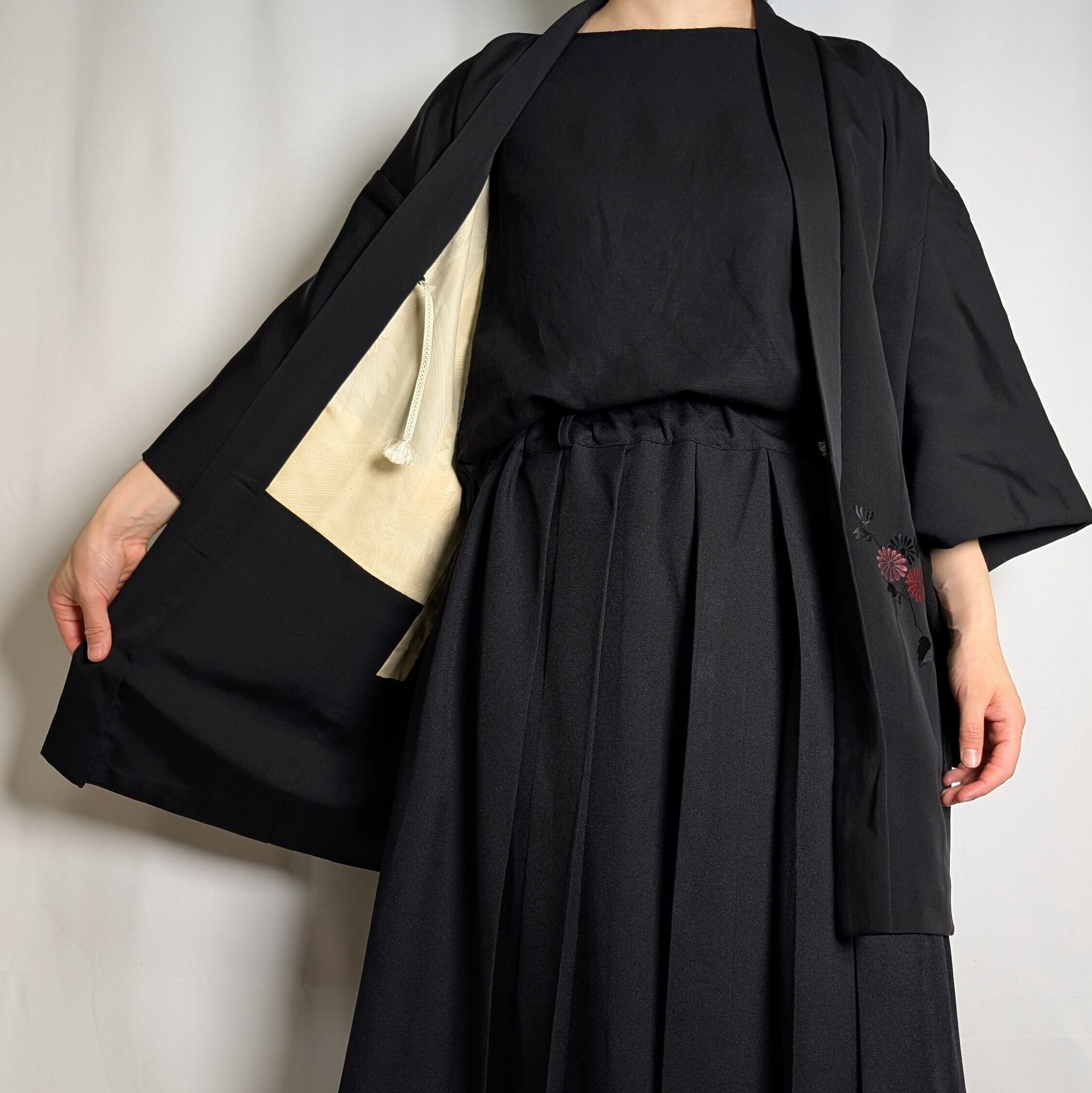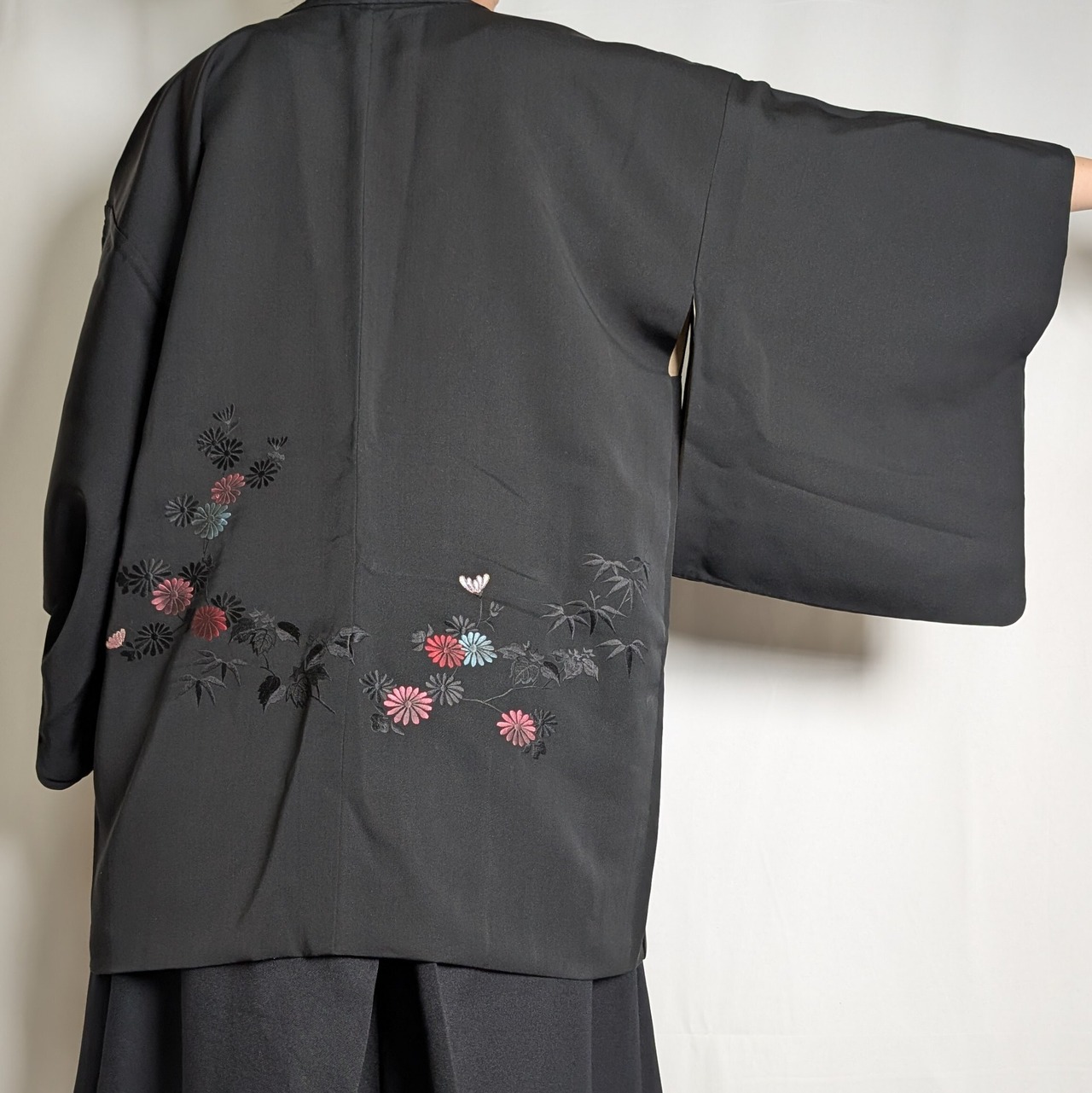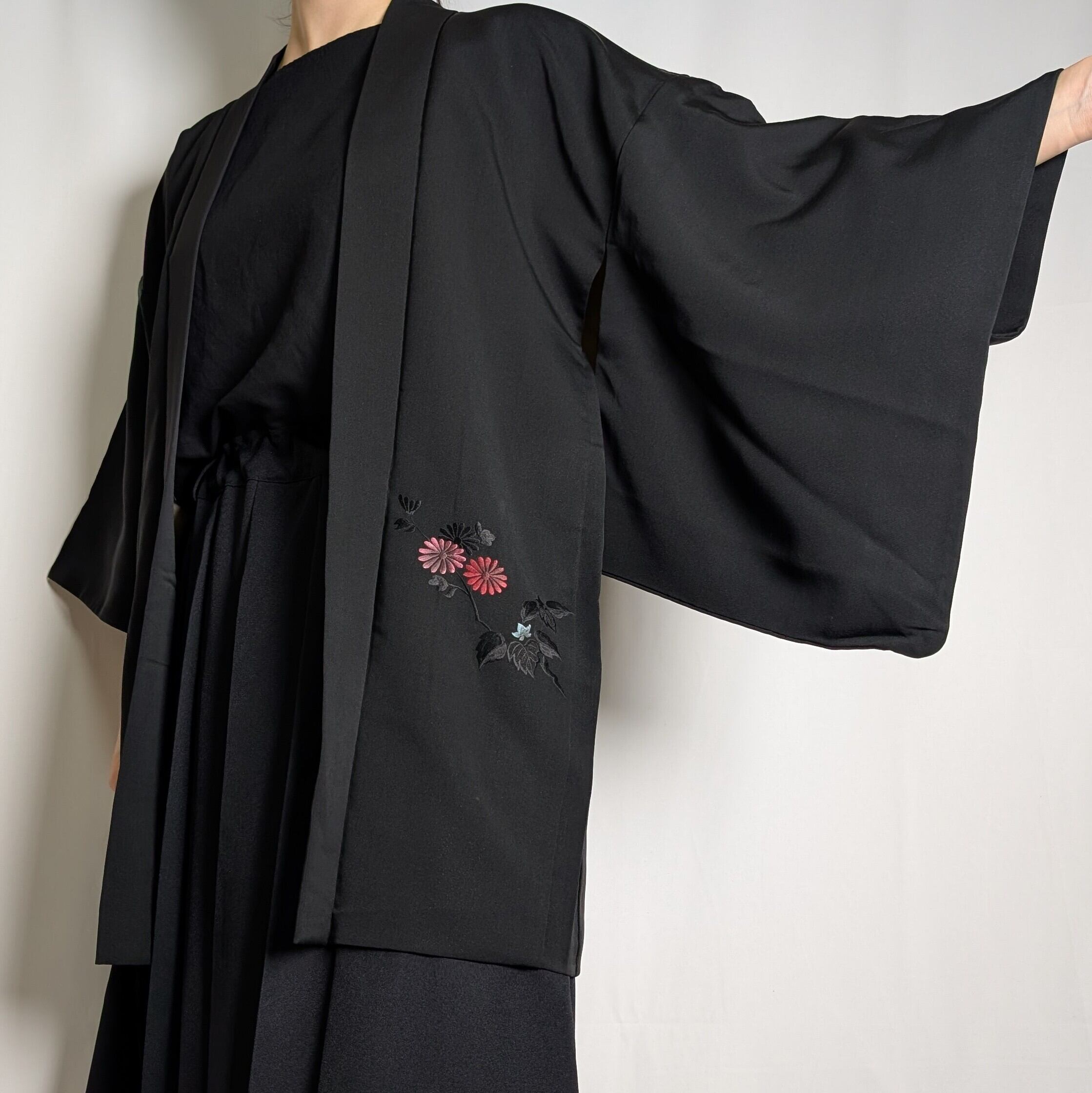 【14520】 ヴィンテージ 黒羽織 刺繍 菊 和洋折衷コーデ / Japanese vintage kimono black haori jacket
