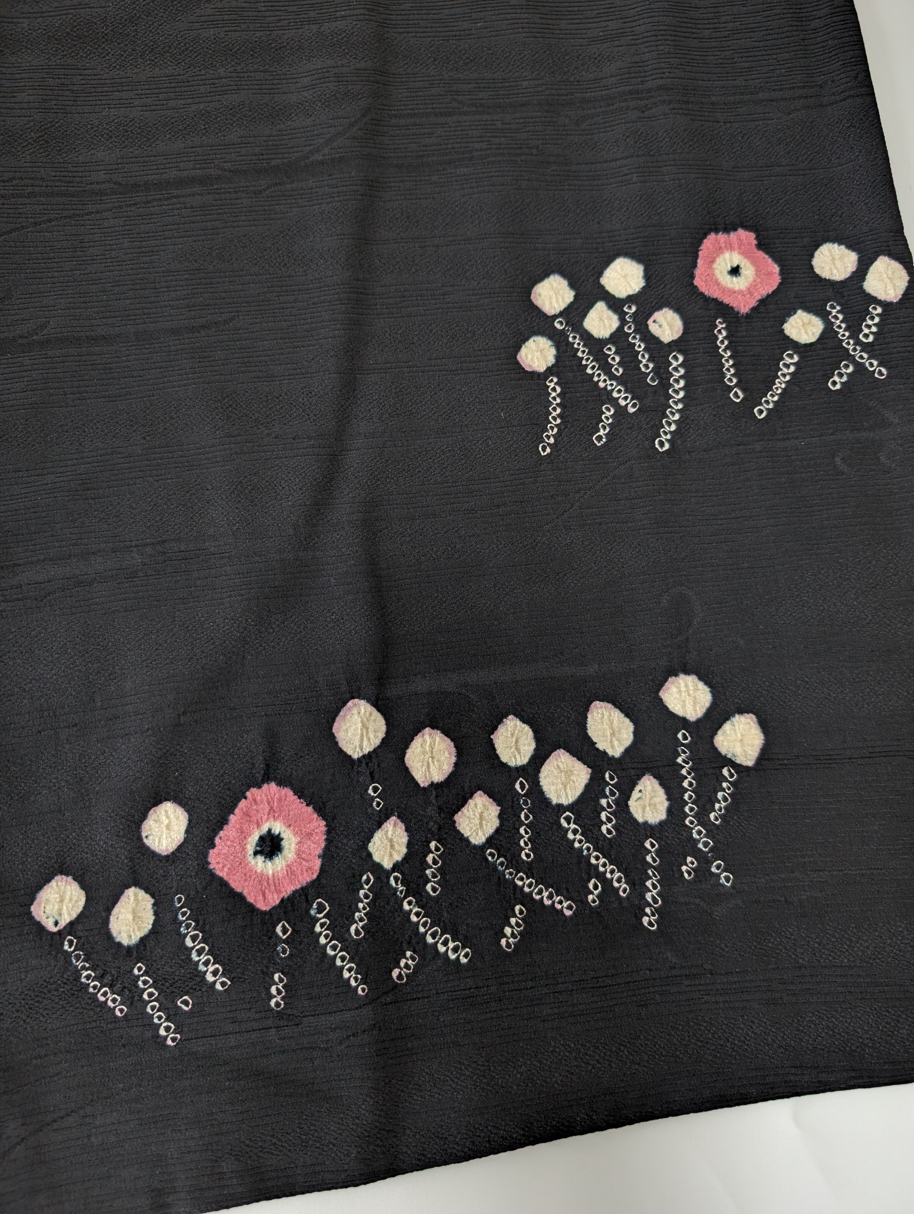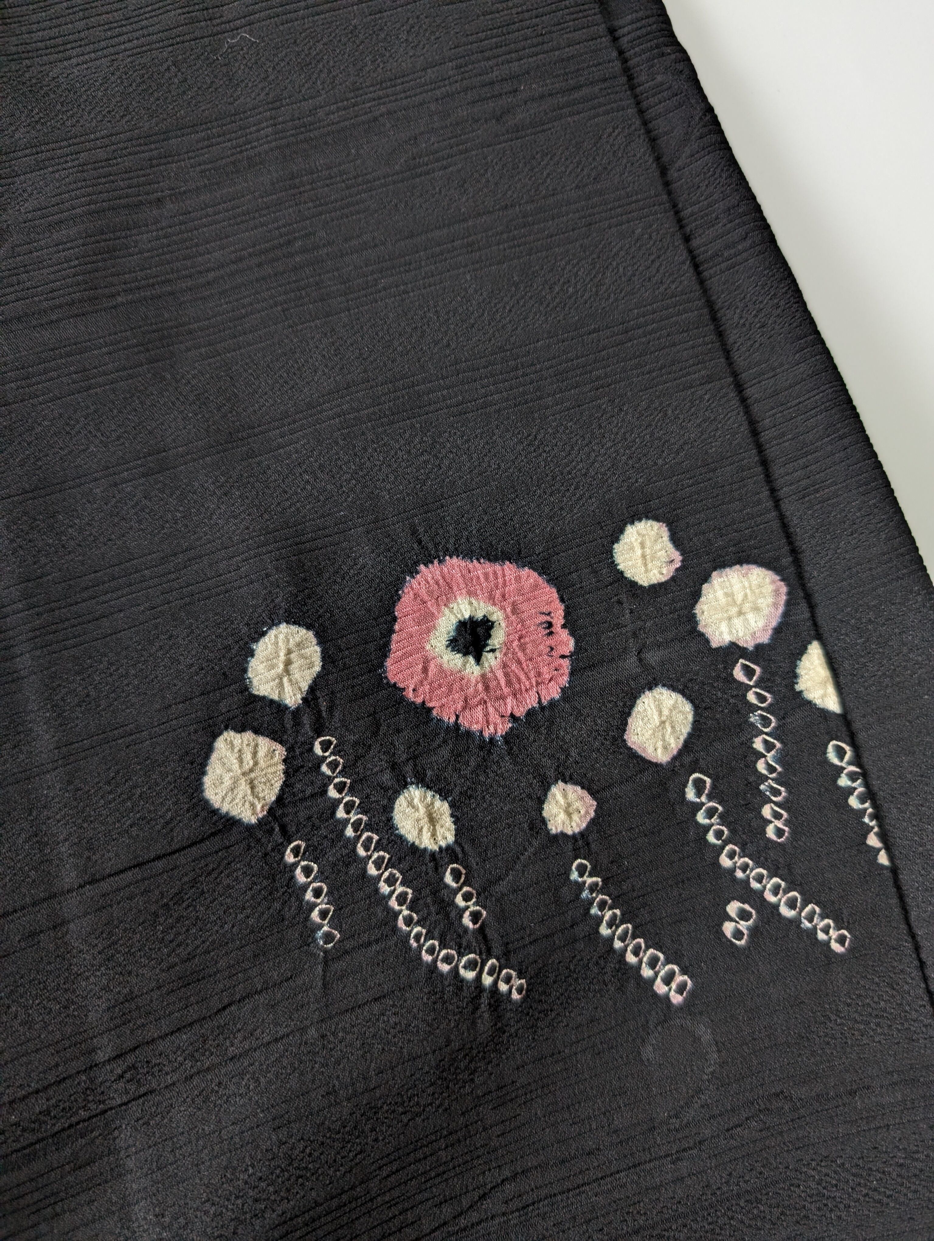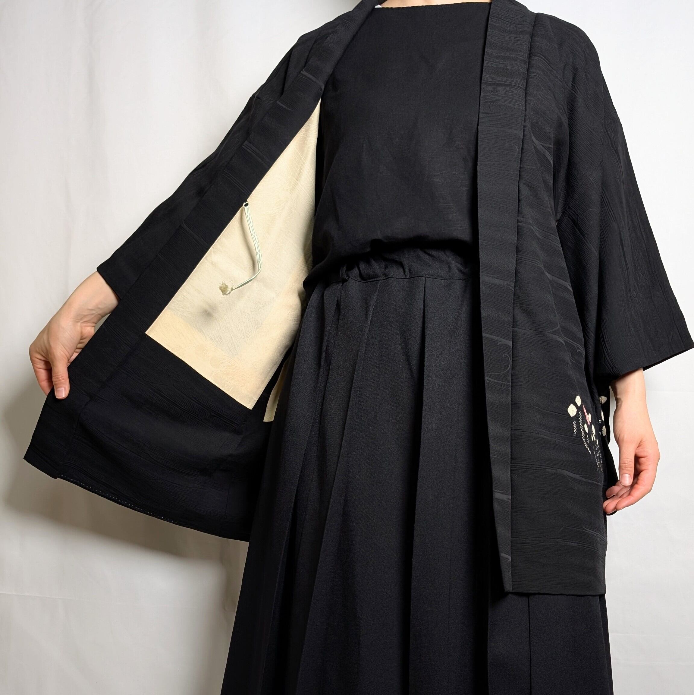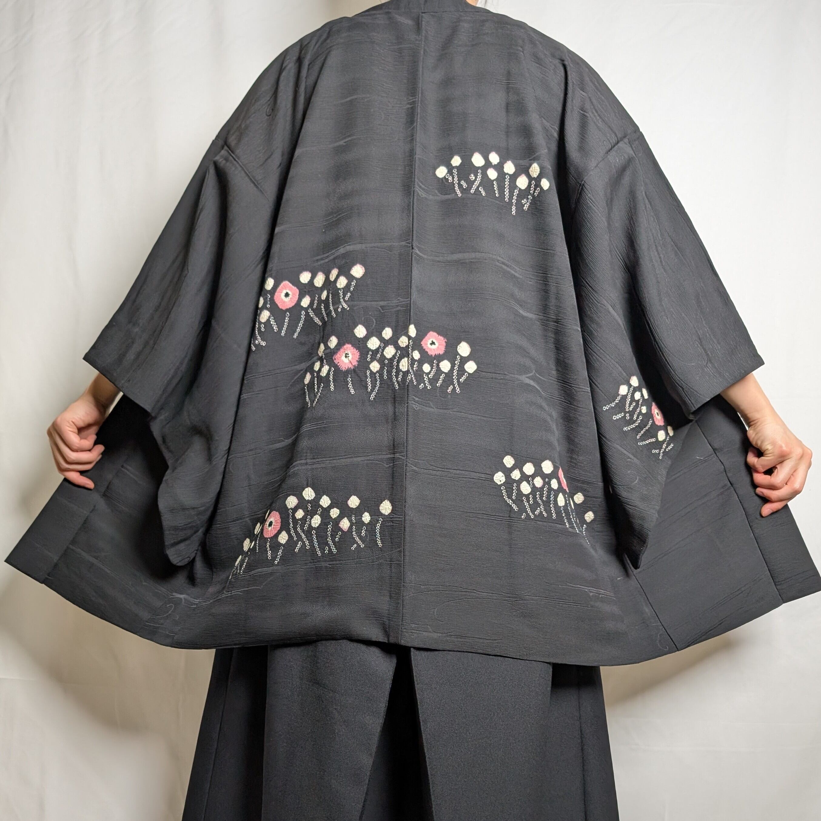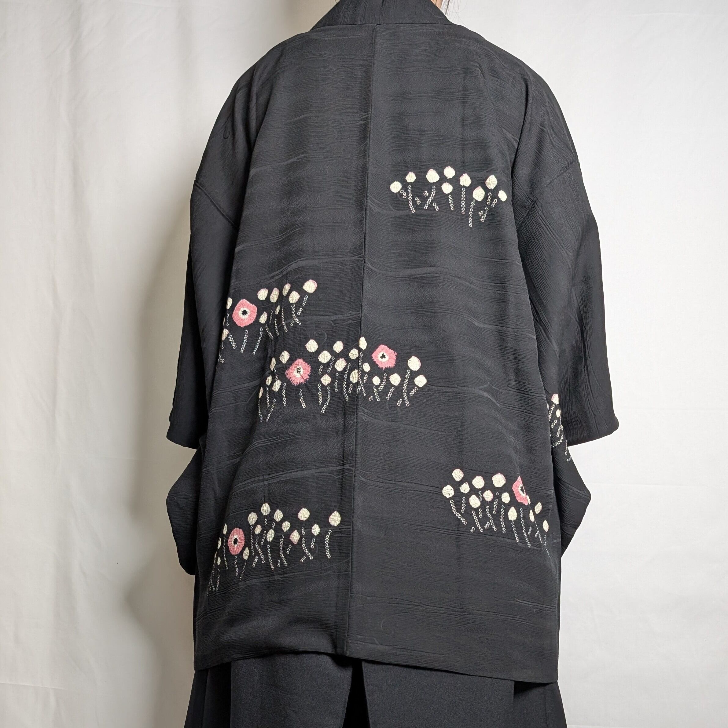【14534】 ヴィンテージ 黒羽織 抽象花模様 ピンク 白 和洋折衷コーデ / Japanese vintage kimono black haori jacket