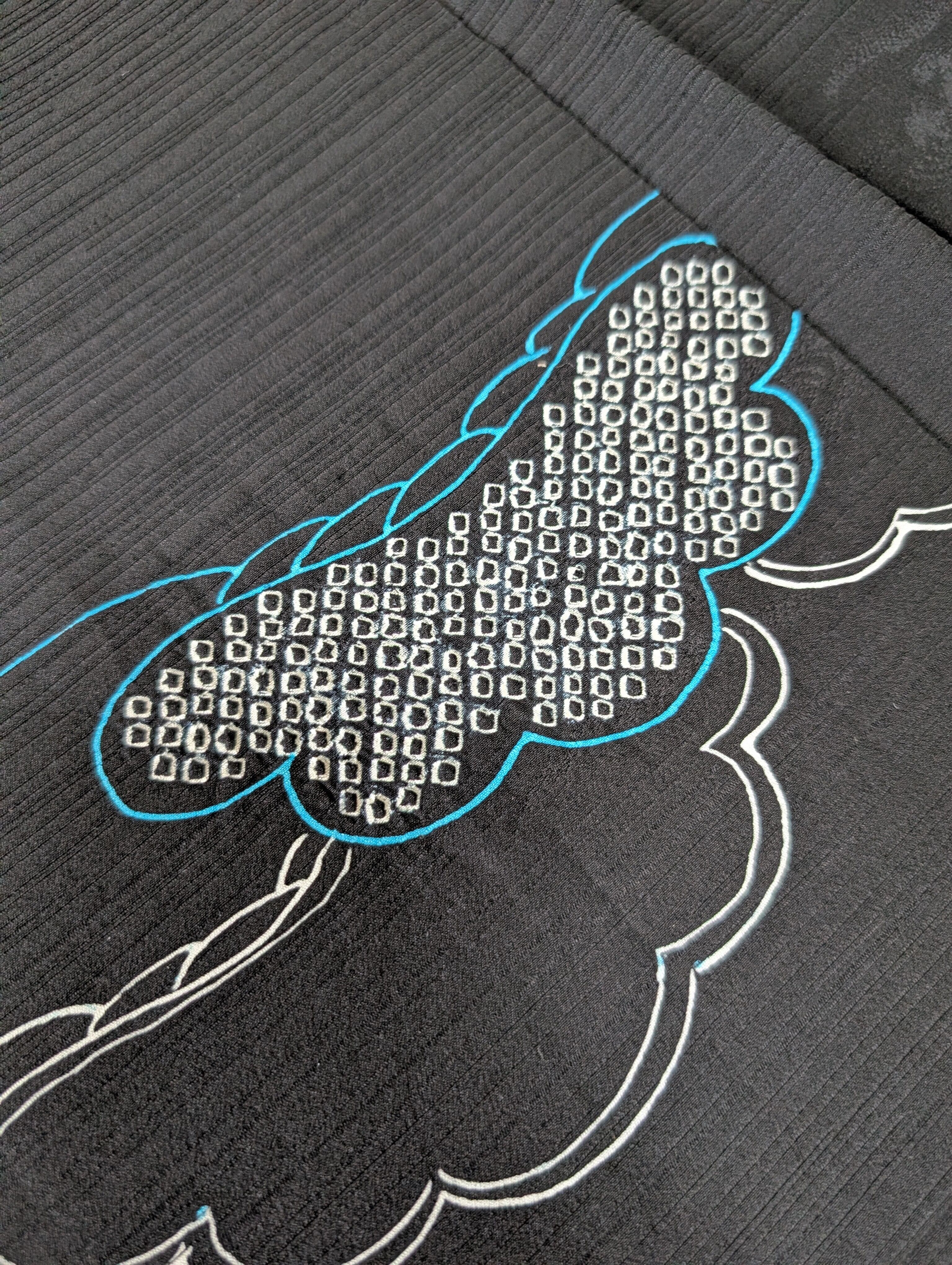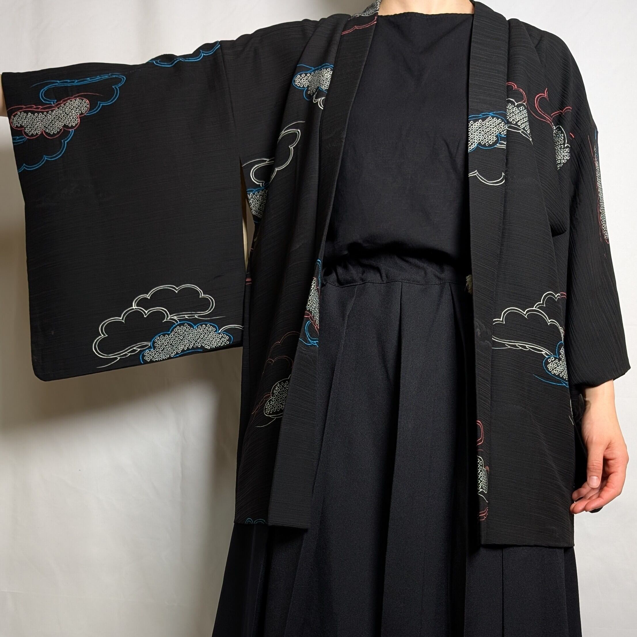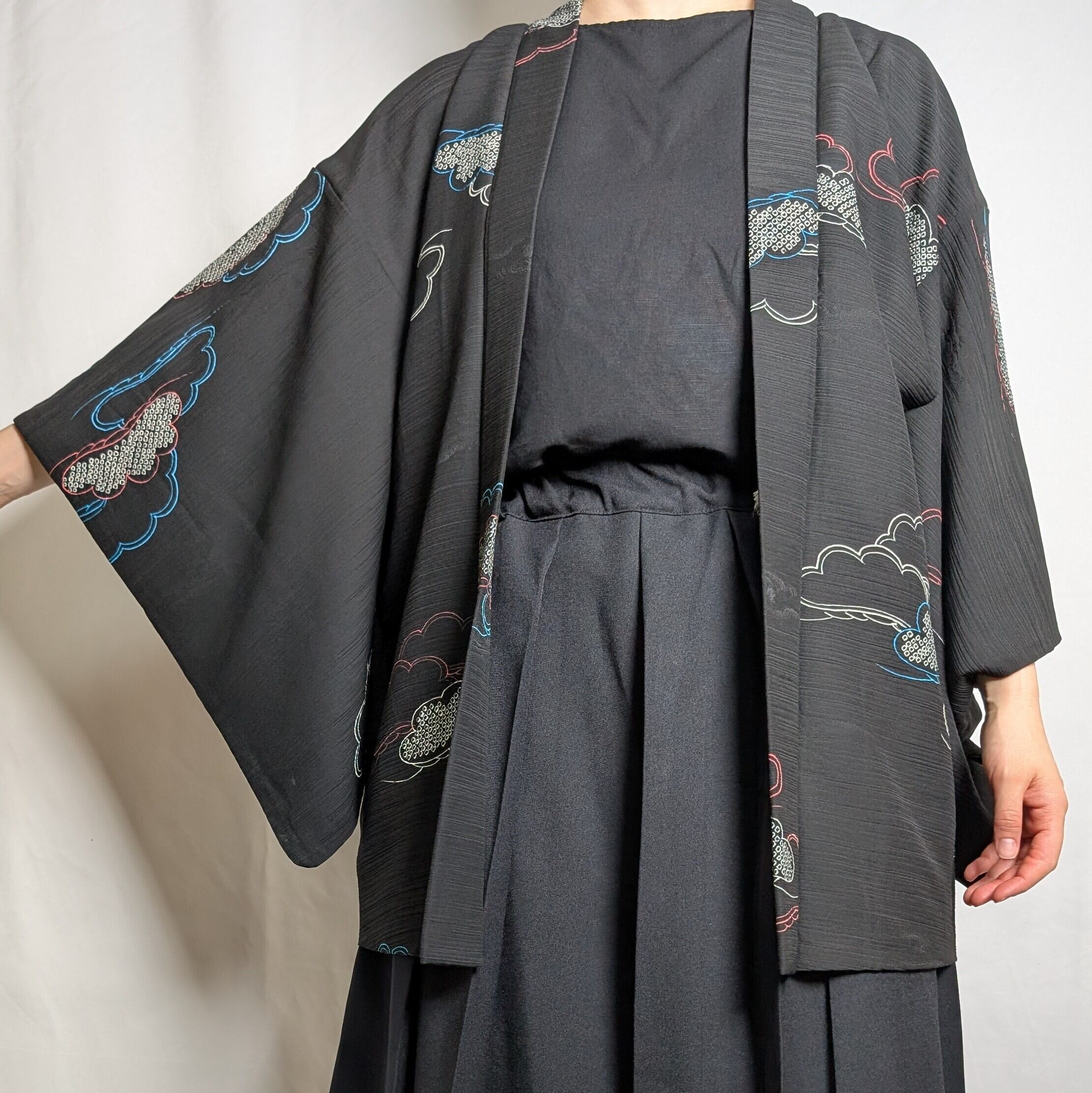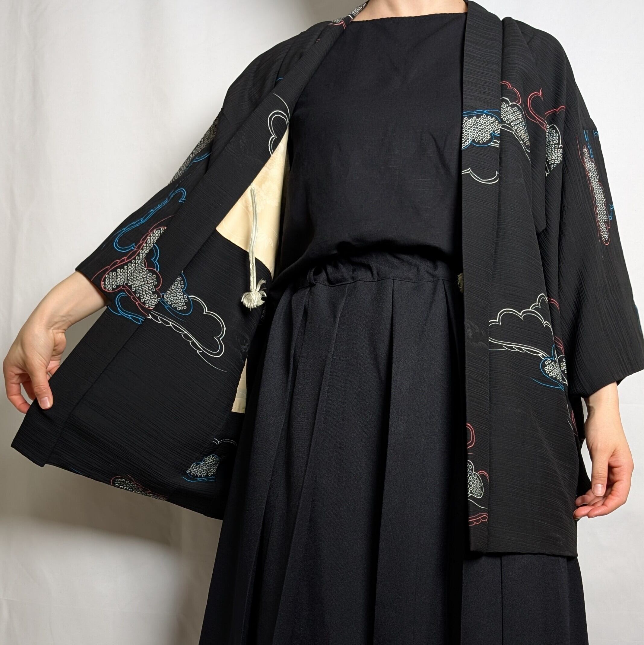 【14536】 ヴィンテージ 黒羽織 松模様 ピンク 水色 和洋折衷コーデ / Japanese vintage kimono black haori jacket