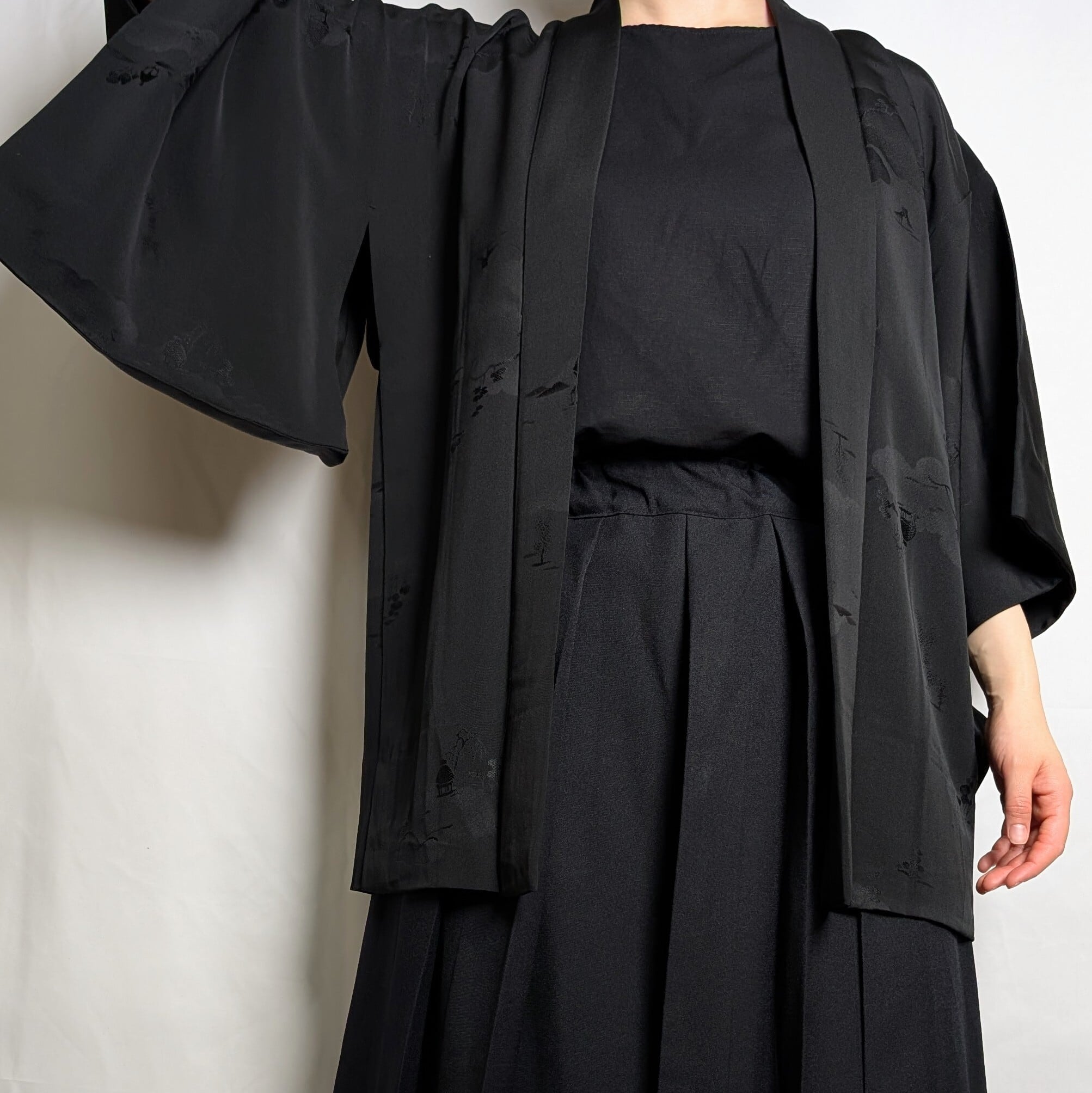 【14537】 ヴィンテージ 黒羽織 地模様 和洋折衷コーデ / Japanese vintage kimono black haori jacket