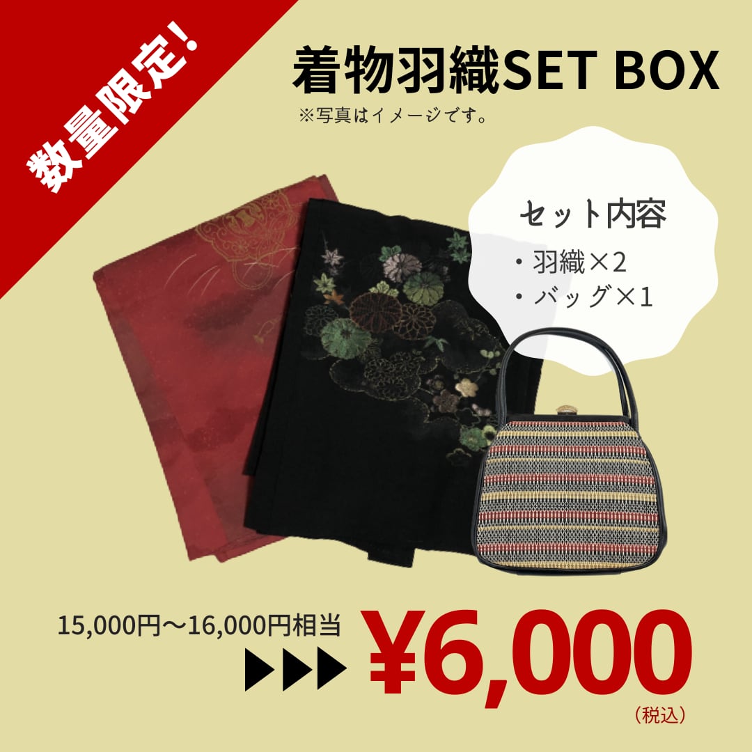 通常価格6,000〜6,600円前後のヴィンテージ羽織が2着、さらに通常価格3,000円前後のヴィンテージ和装バッグ1個が入ったセットボックス!