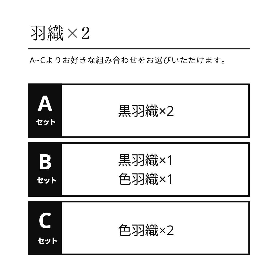 ■羽織・・・黒羽織or色羽織より2着お好きな組み合わせをお選びいただけます。