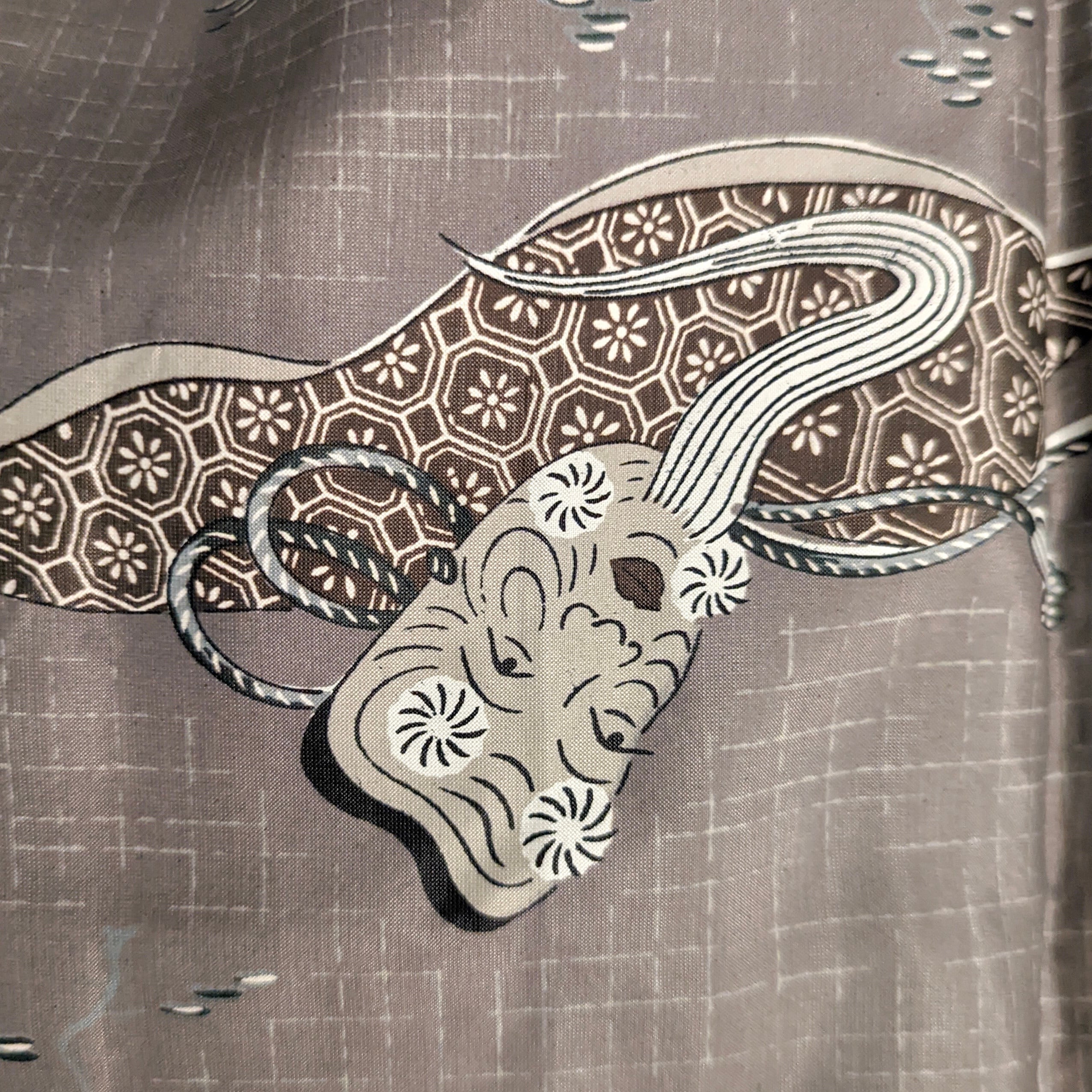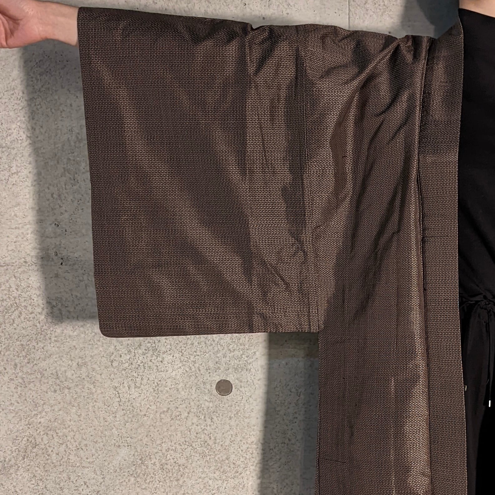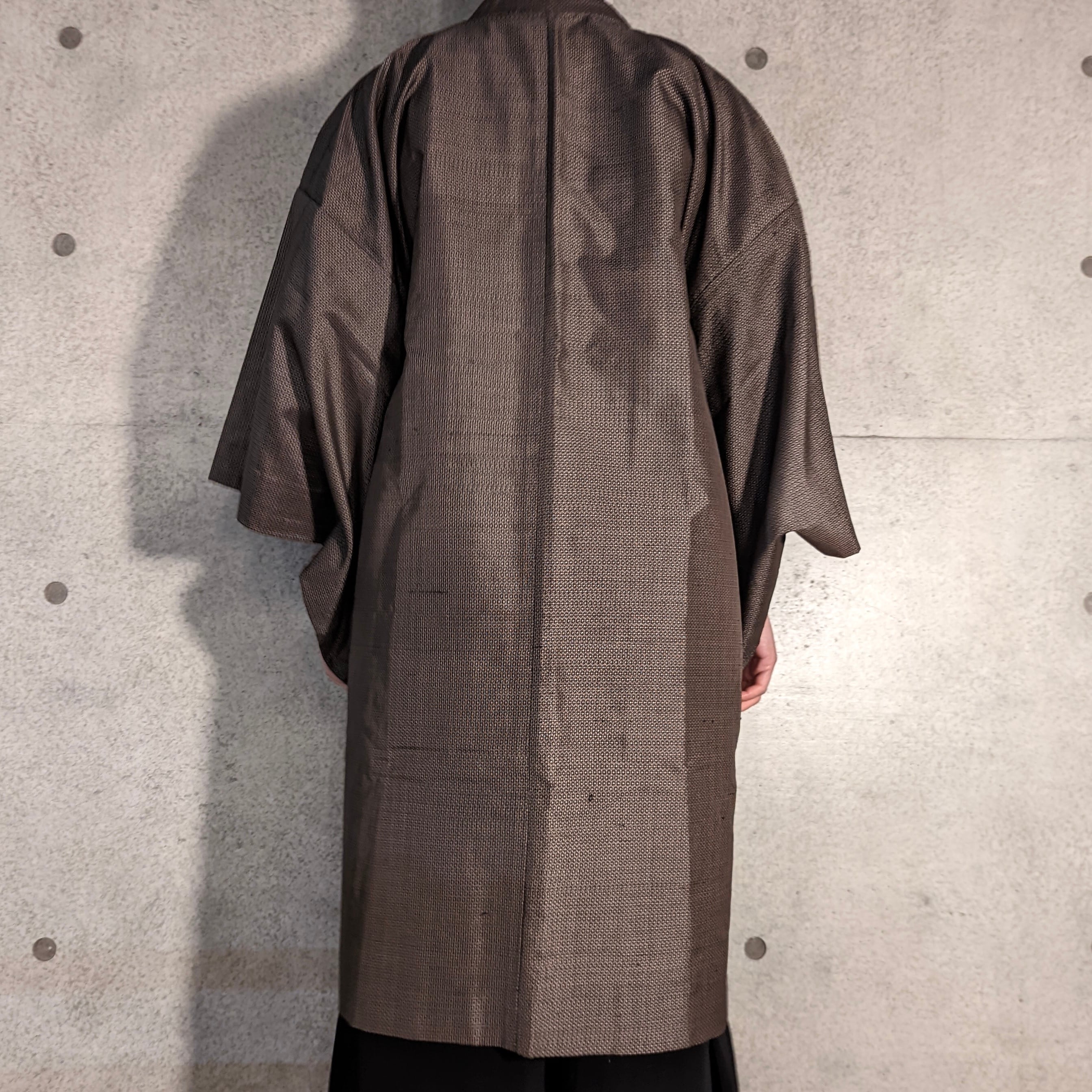 【10586】 古着 ヴィンテージ 着物羽織 男性羽織 茶 棗に文箱・能面模様 本場村山泥大島紬