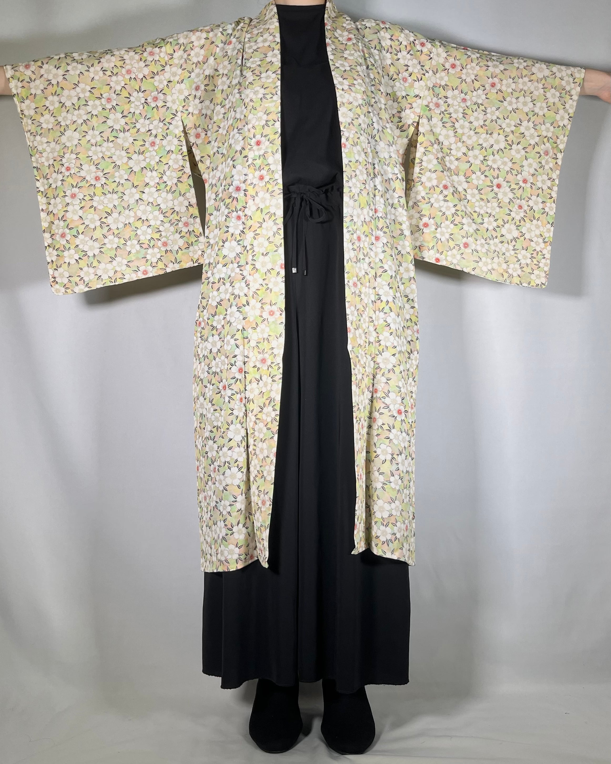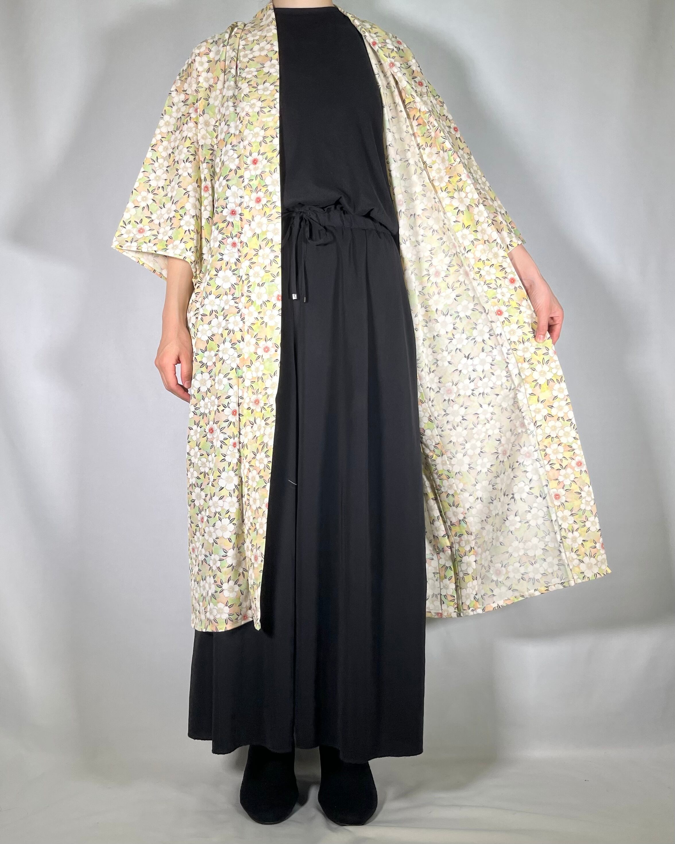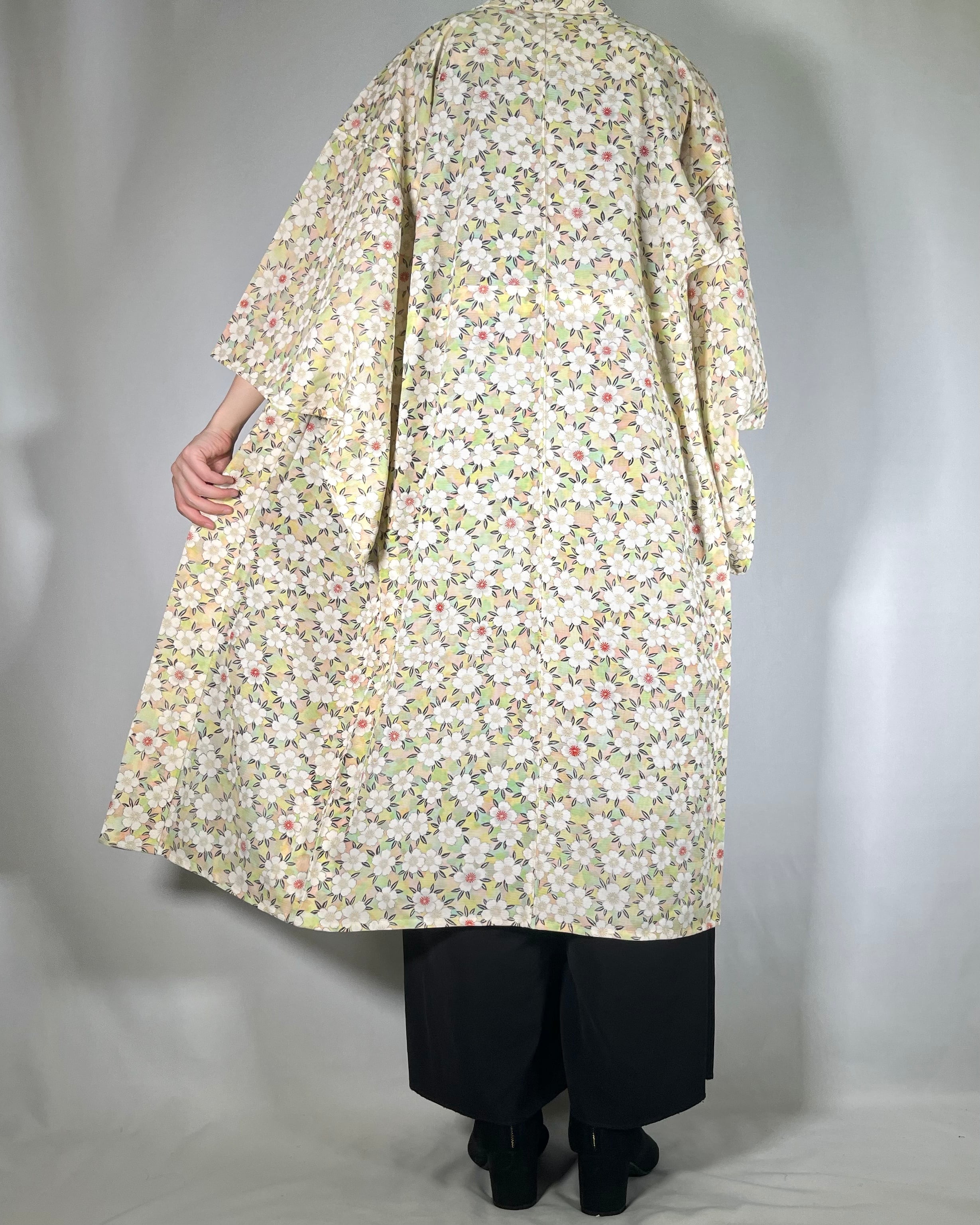 【11945】 着物リメイク ロングコート 夏用 薄手 透け感 パステル 白 黄色 緑 ピンク 花模様