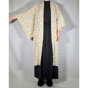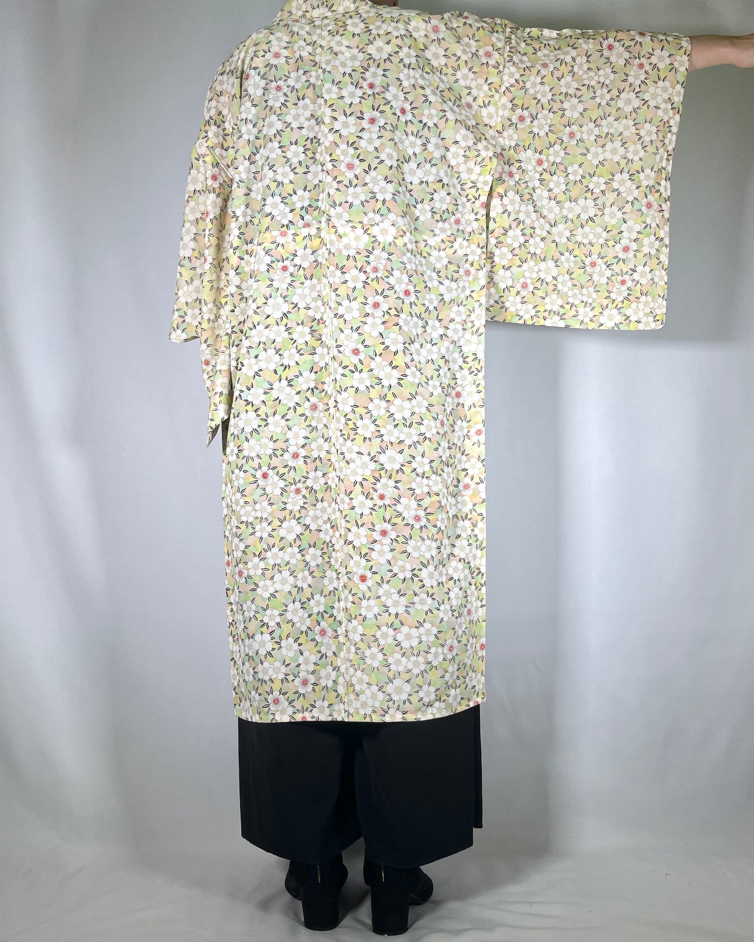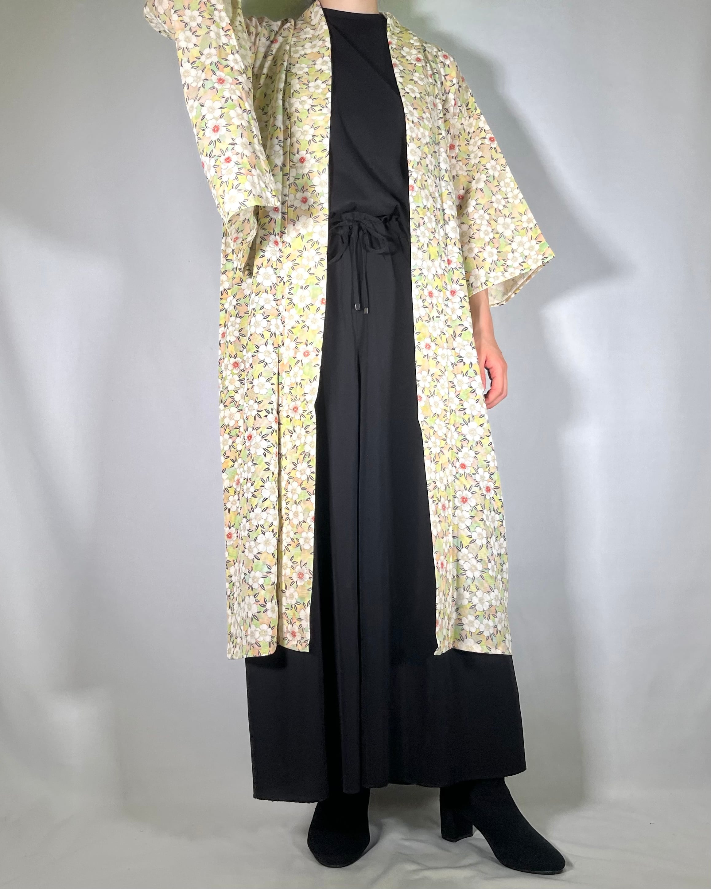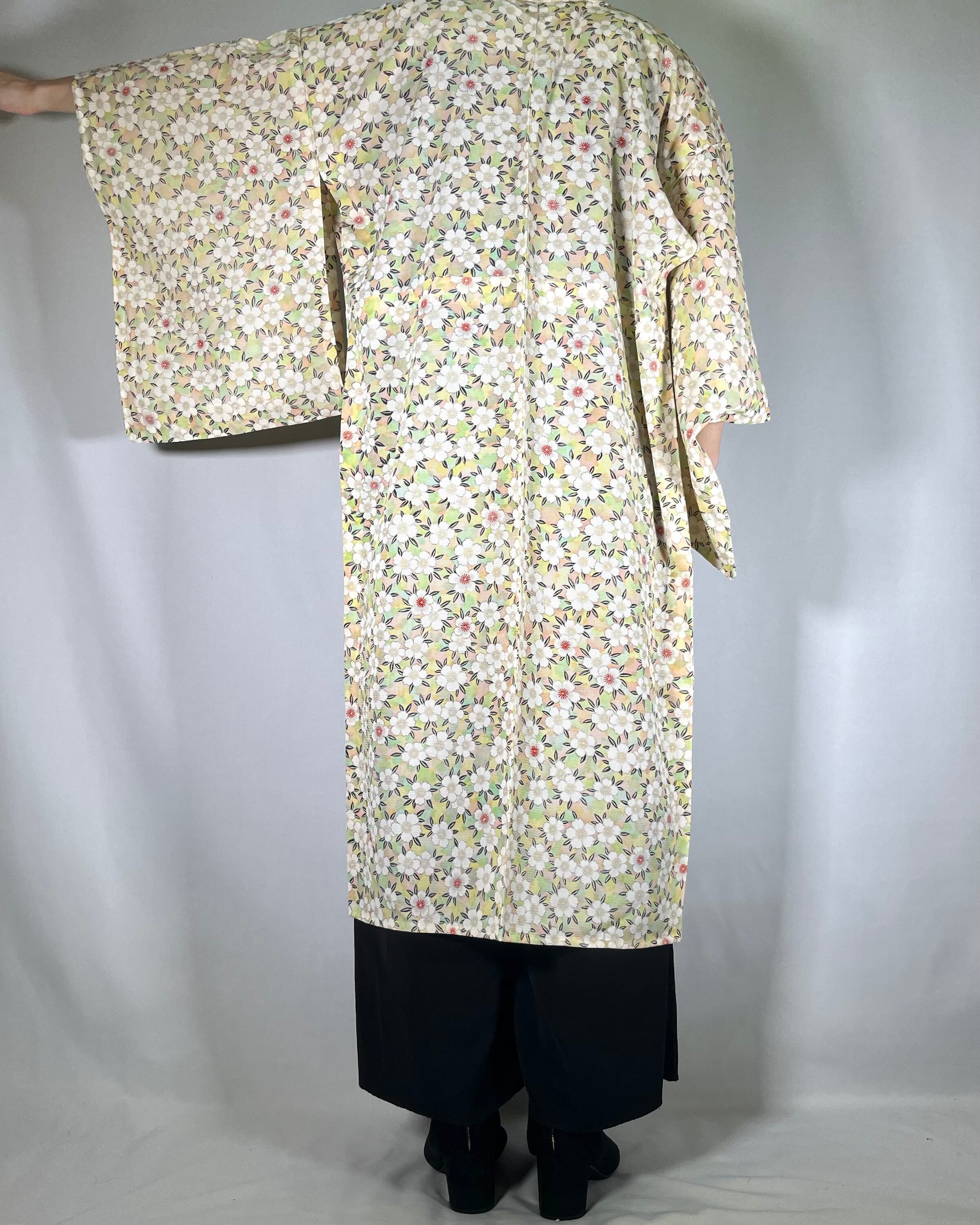 【11945】 着物リメイク ロングコート 夏用 薄手 透け感 パステル 白 黄色 緑 ピンク 花模様