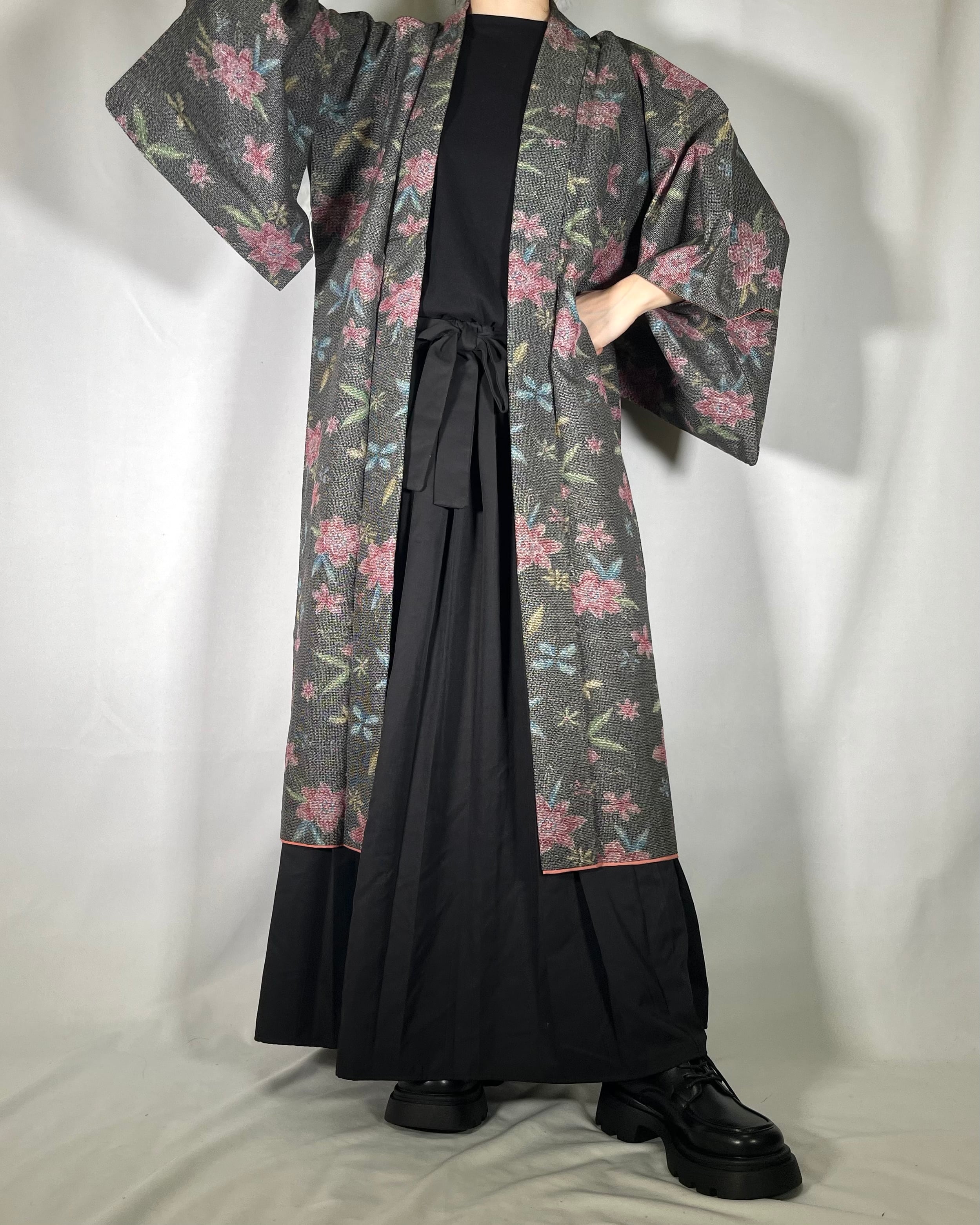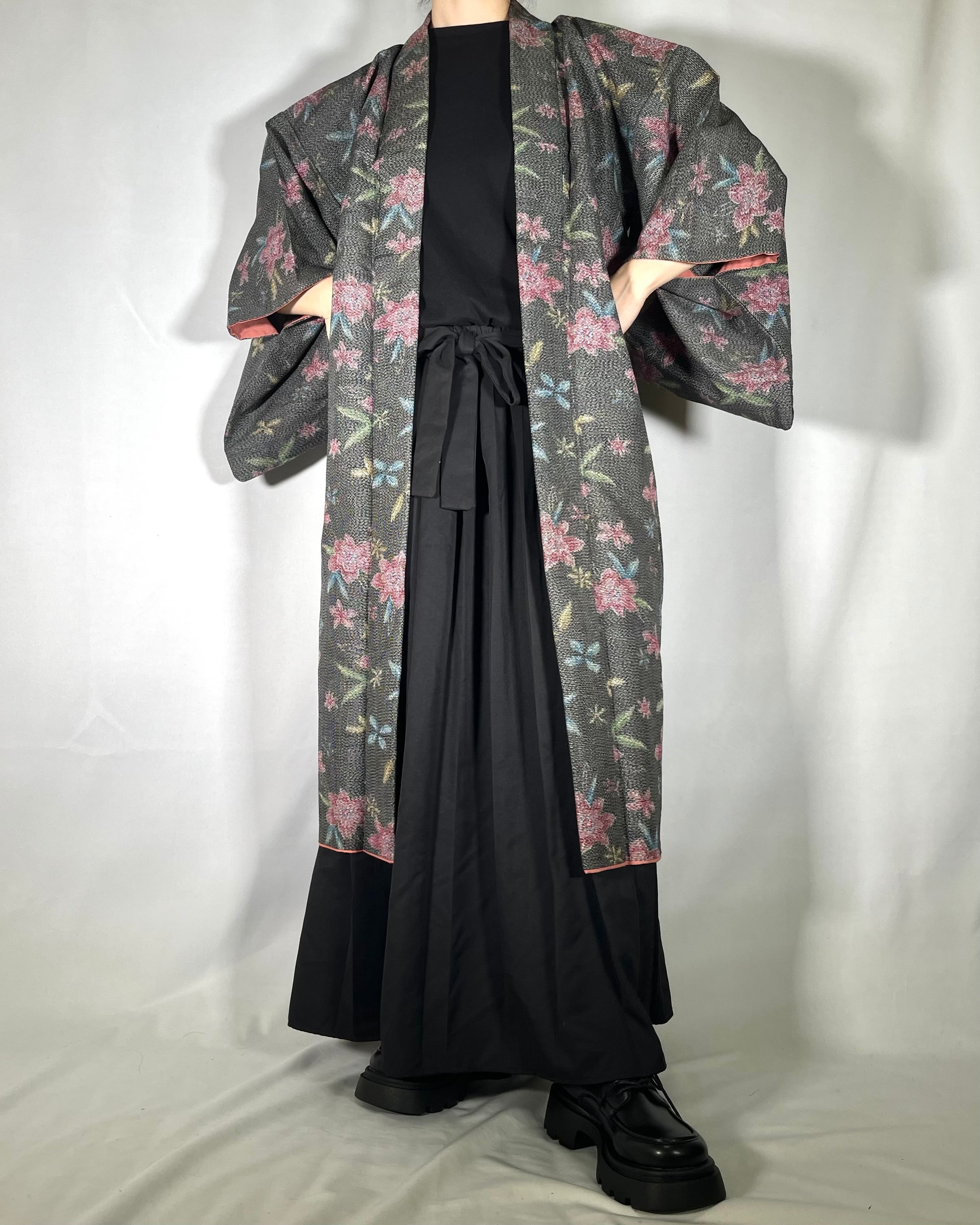 【12579】 着物リメイク ロングコート グレー ピンク 花模様