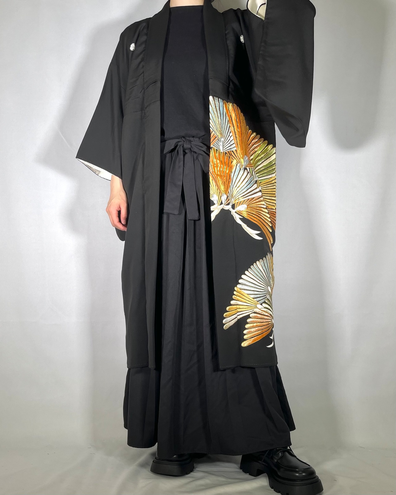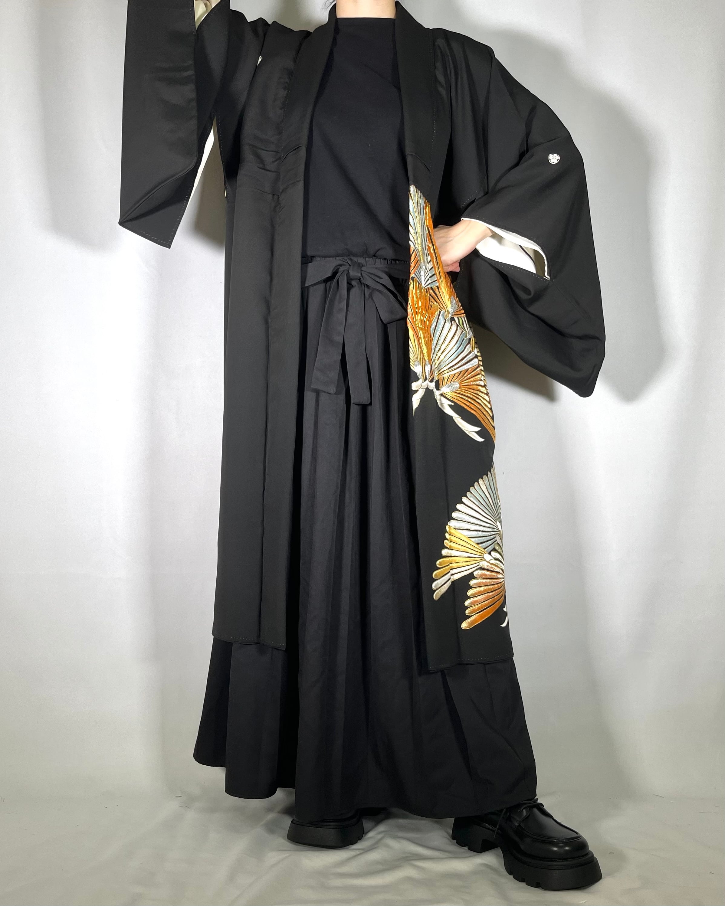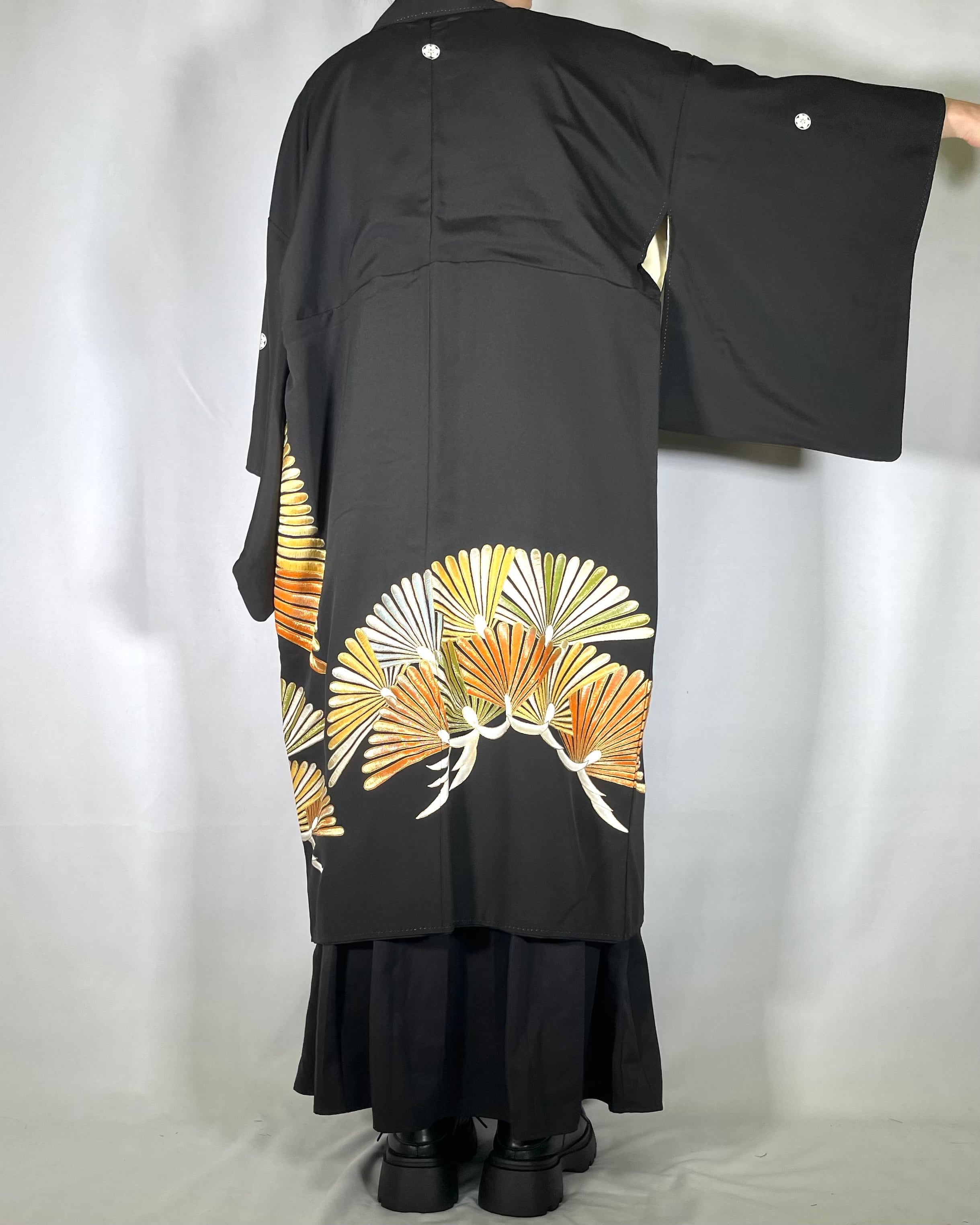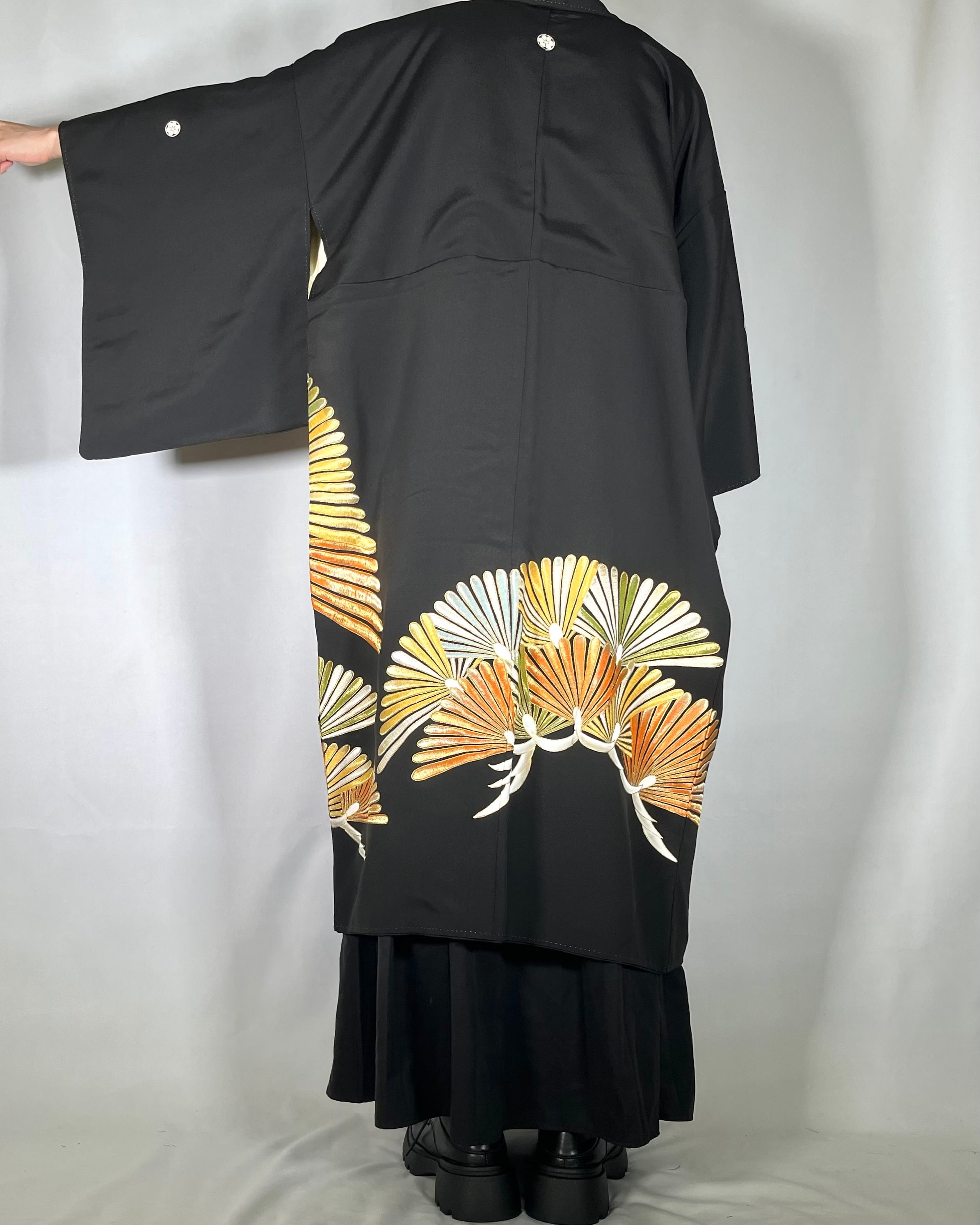 ヴィンテージの着物(黒留袖)をリメイクした世界に一点だけのロングコート。