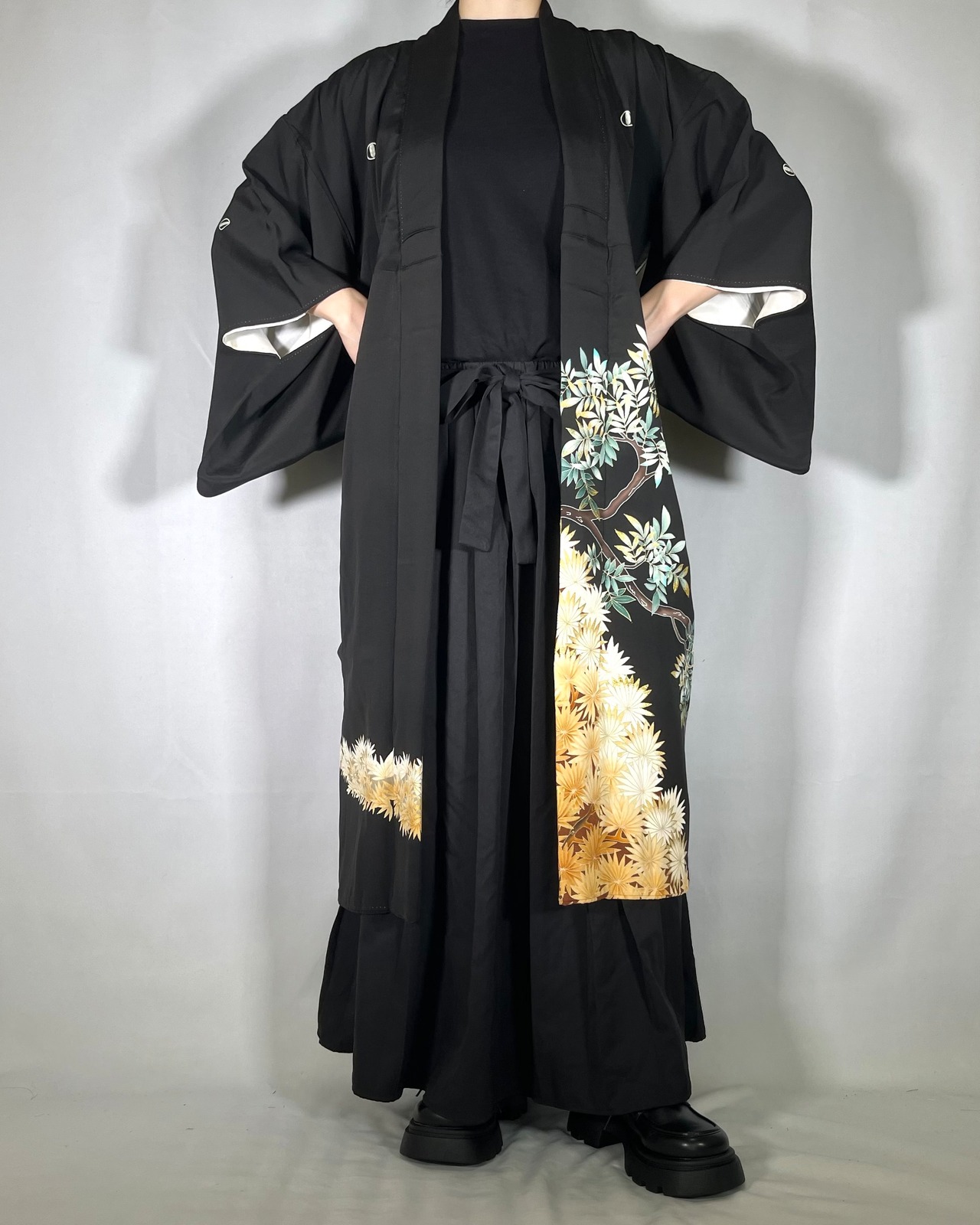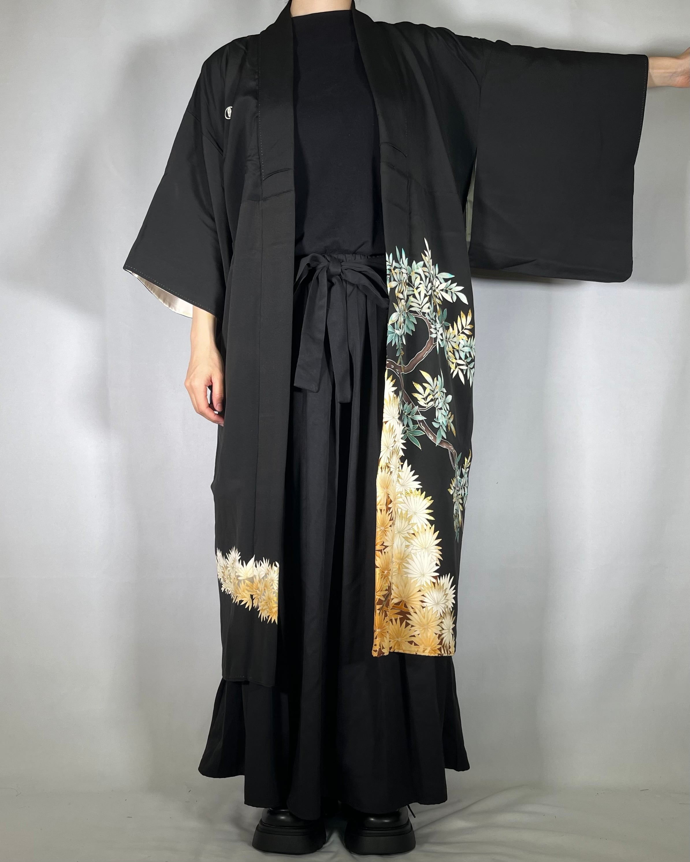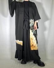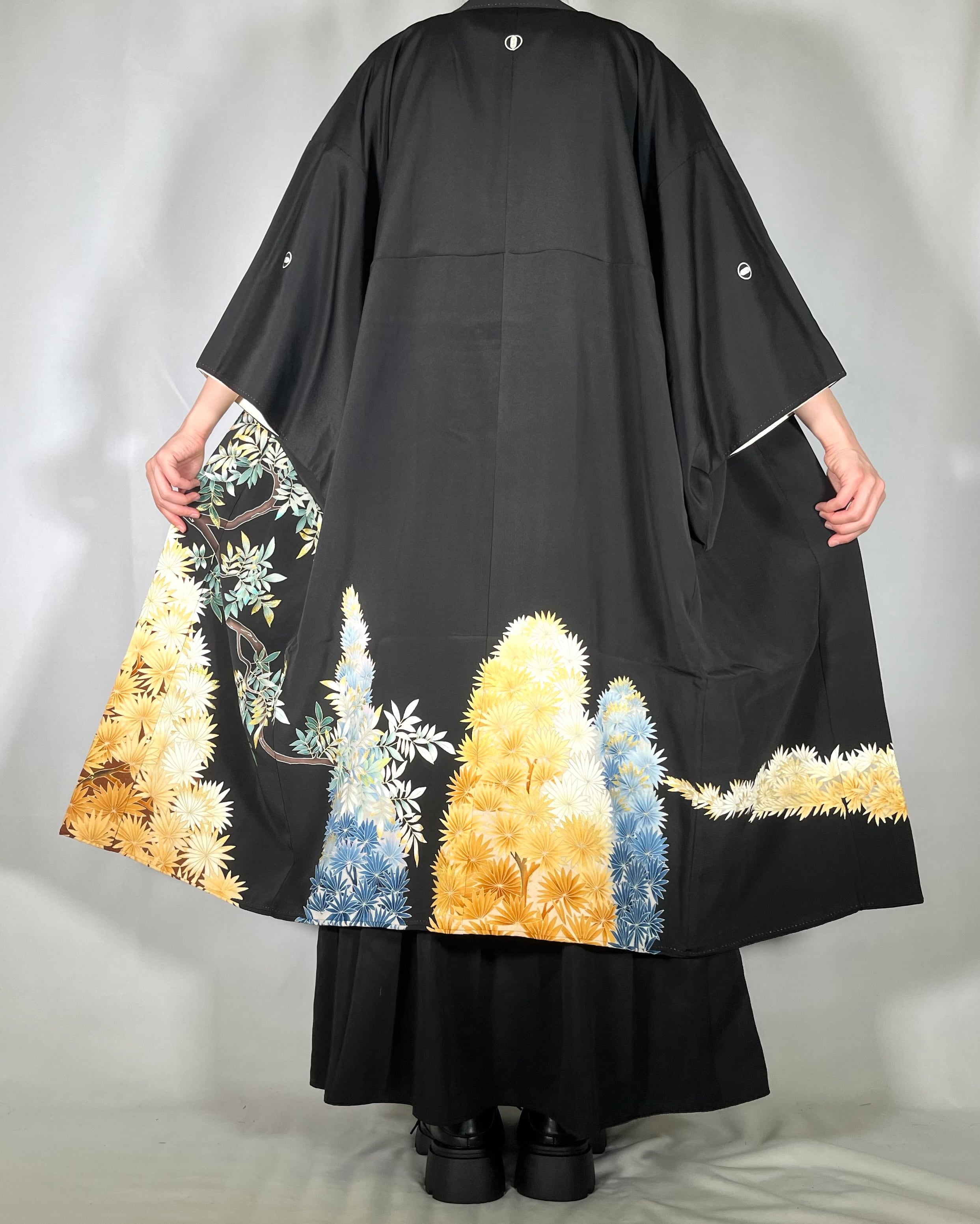 ヴィンテージの着物(黒留袖)をリメイクした世界に一点だけのロングコート。
