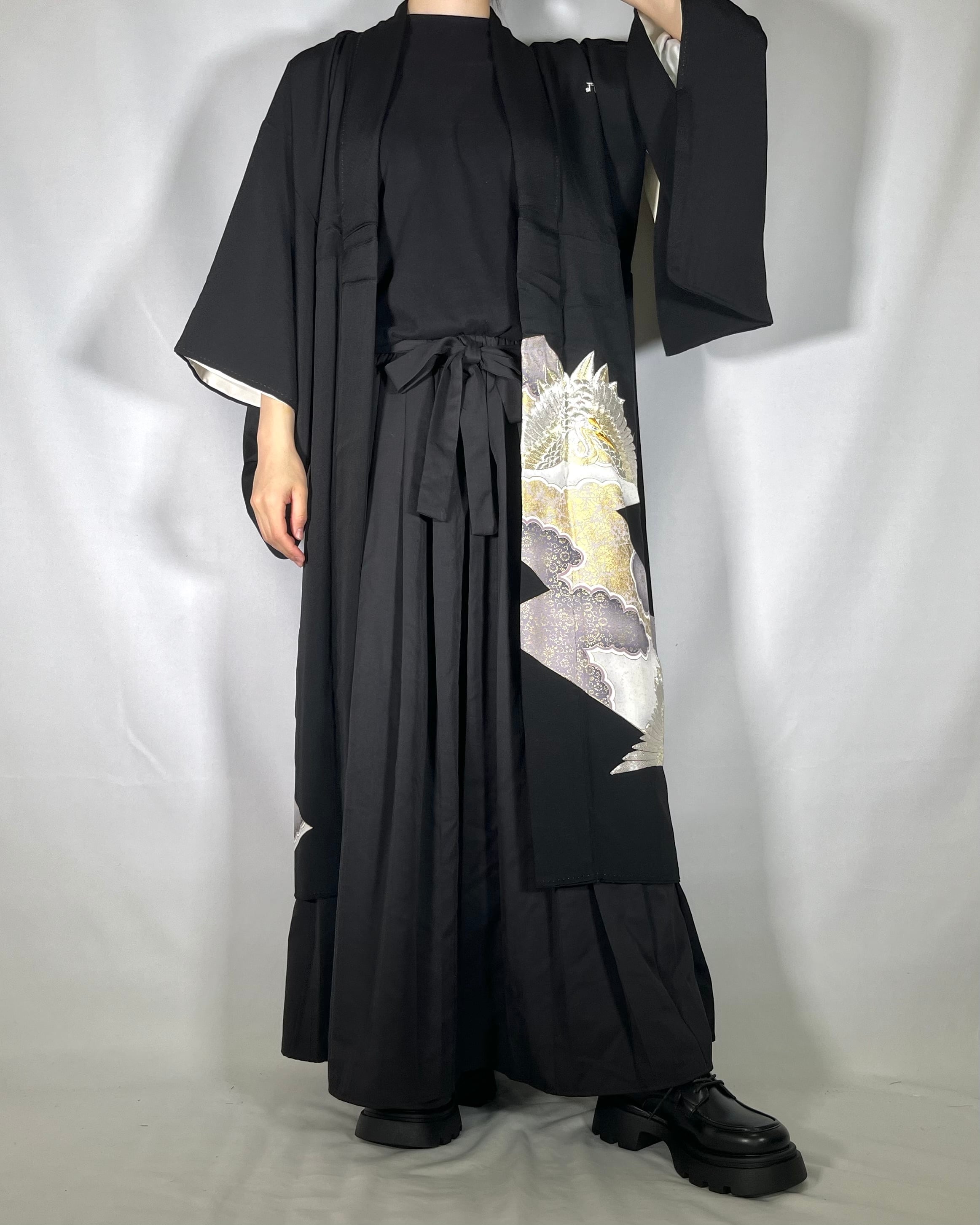ヴィンテージの着物(黒留袖)をリメイクした世界に一点だけのロングコート。