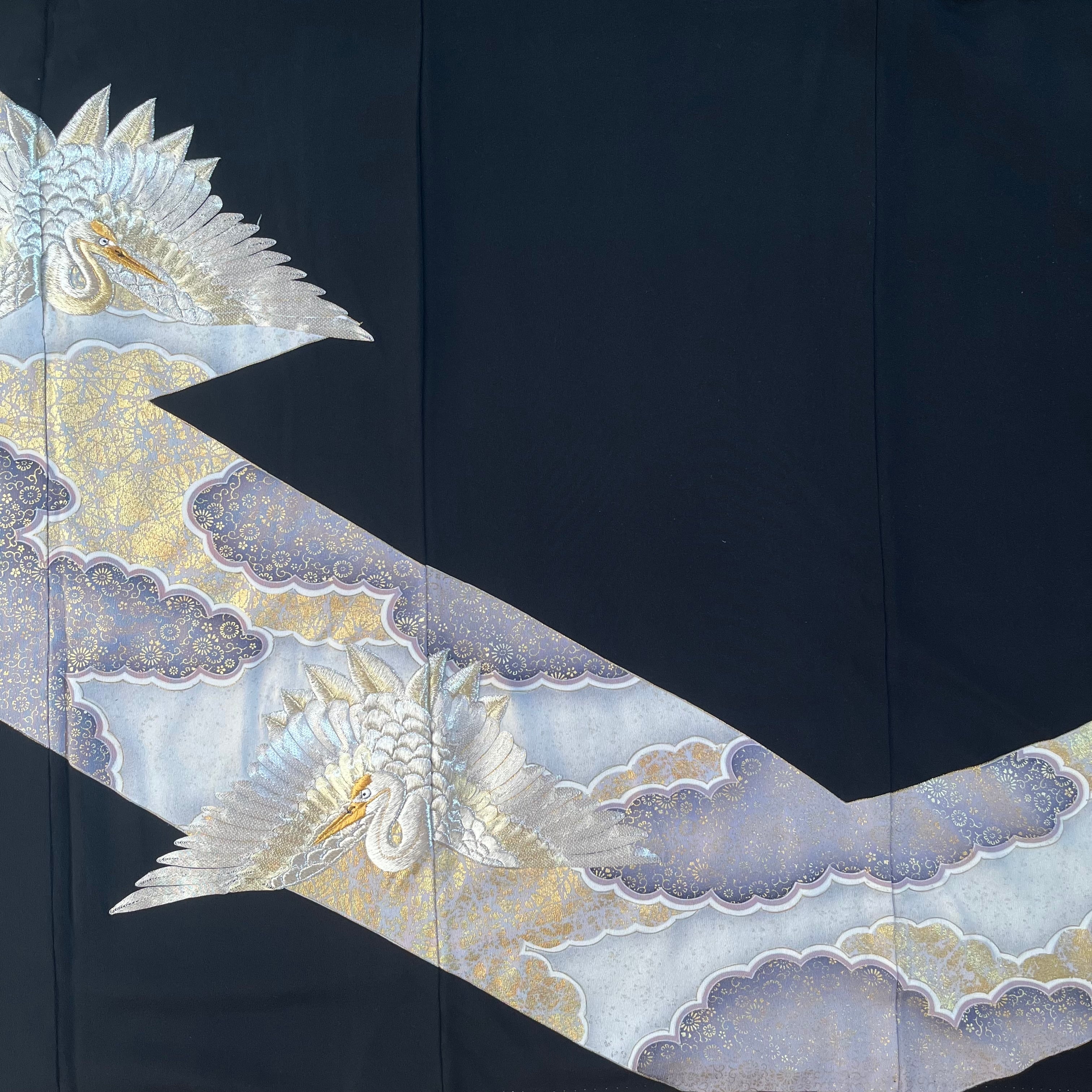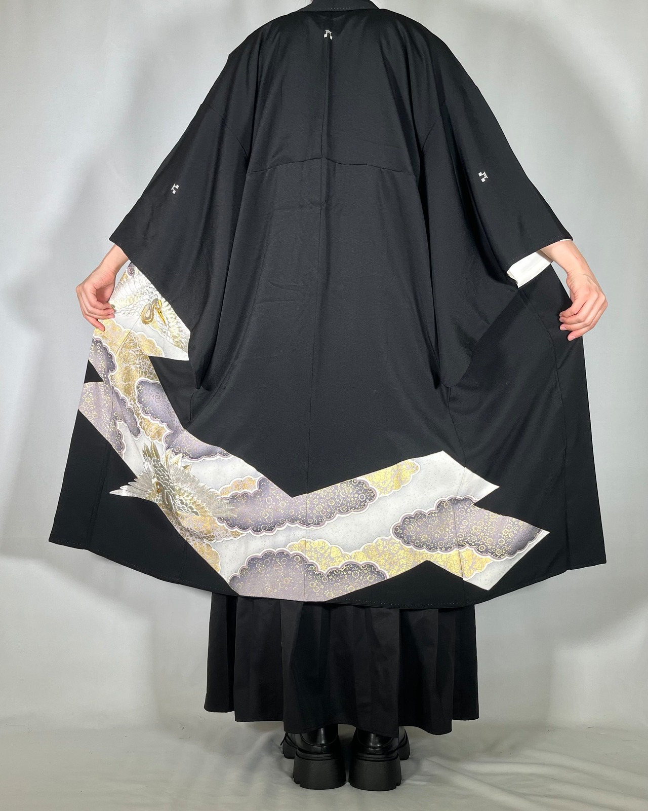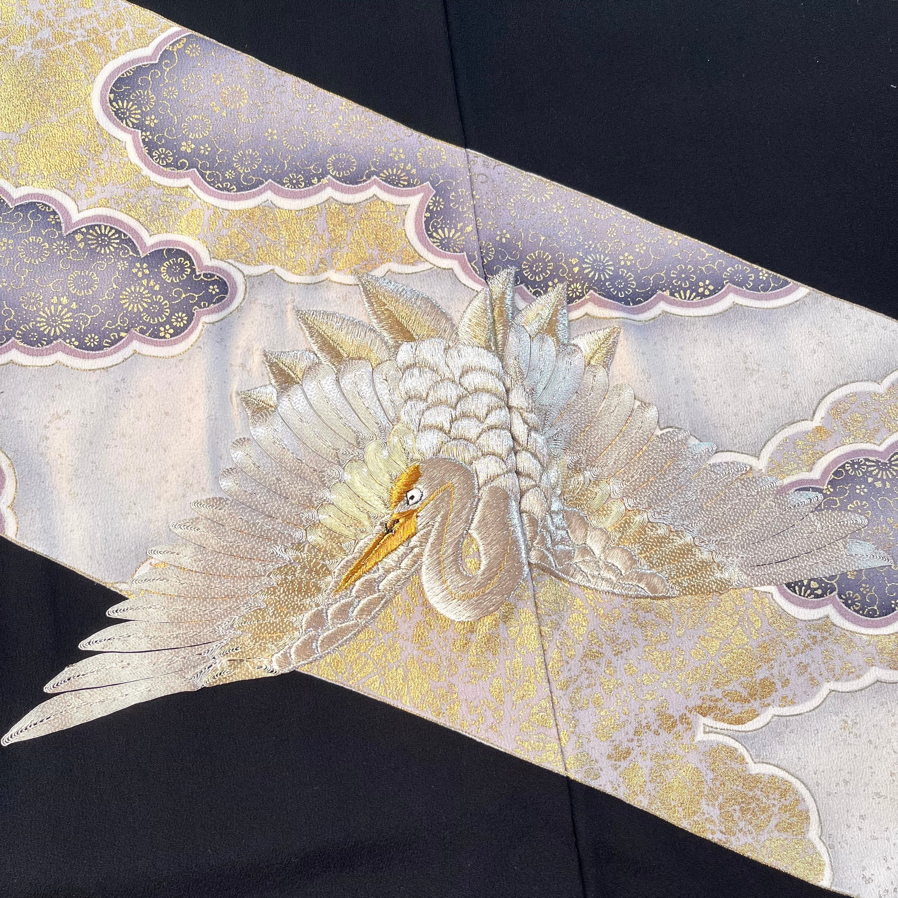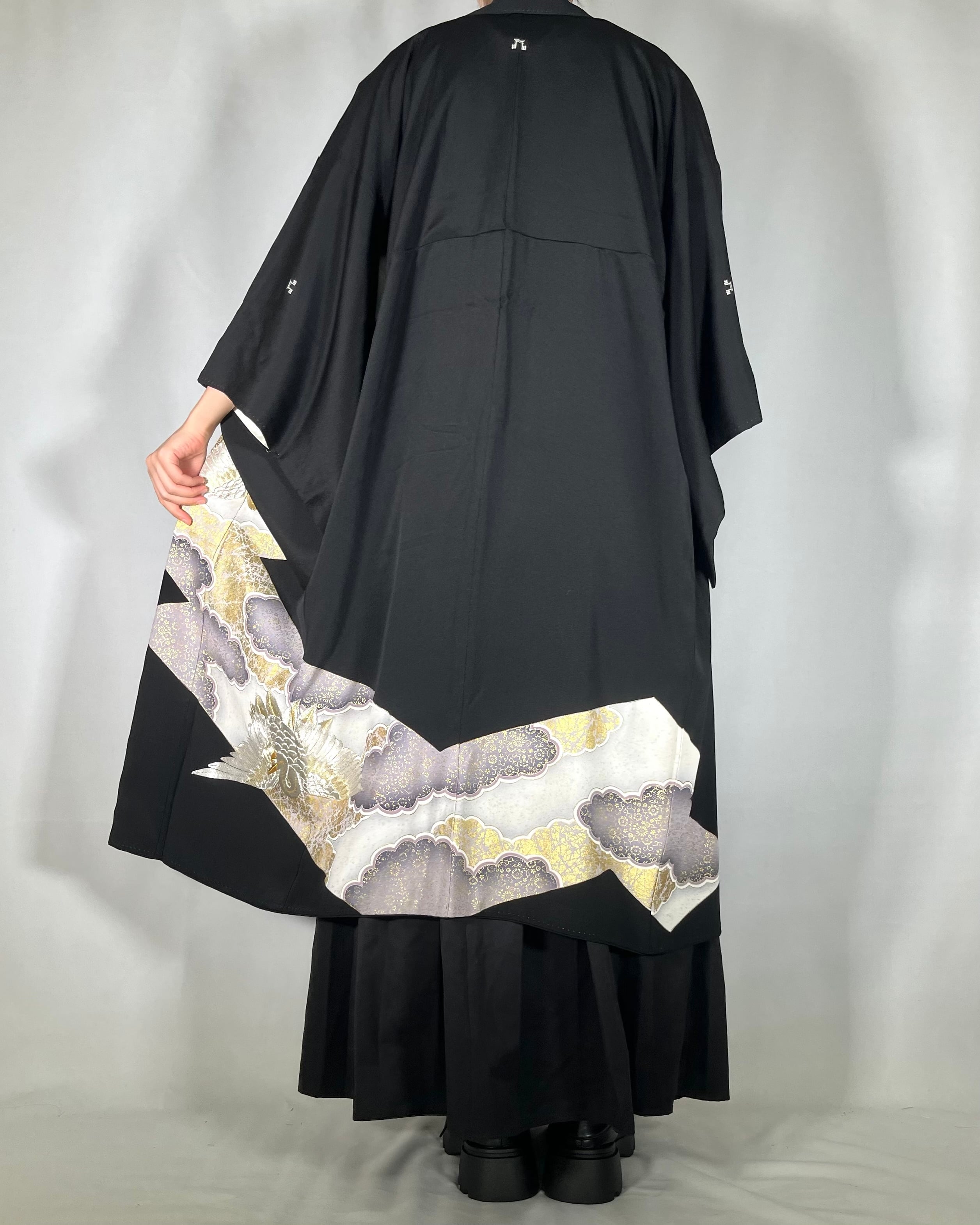 【12604】 着物リメイク 留袖 ロングコート 刺繍 鶴 雲模様