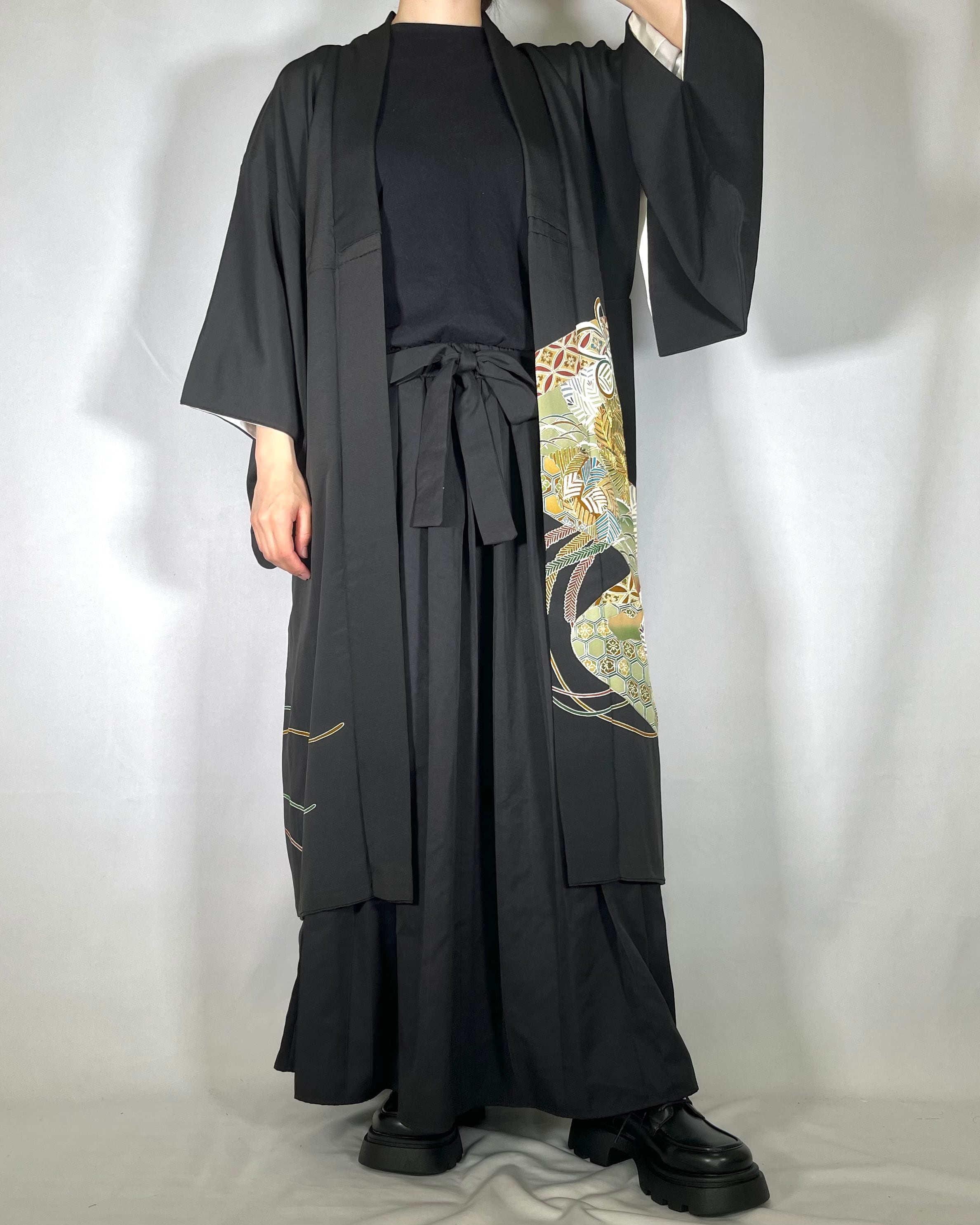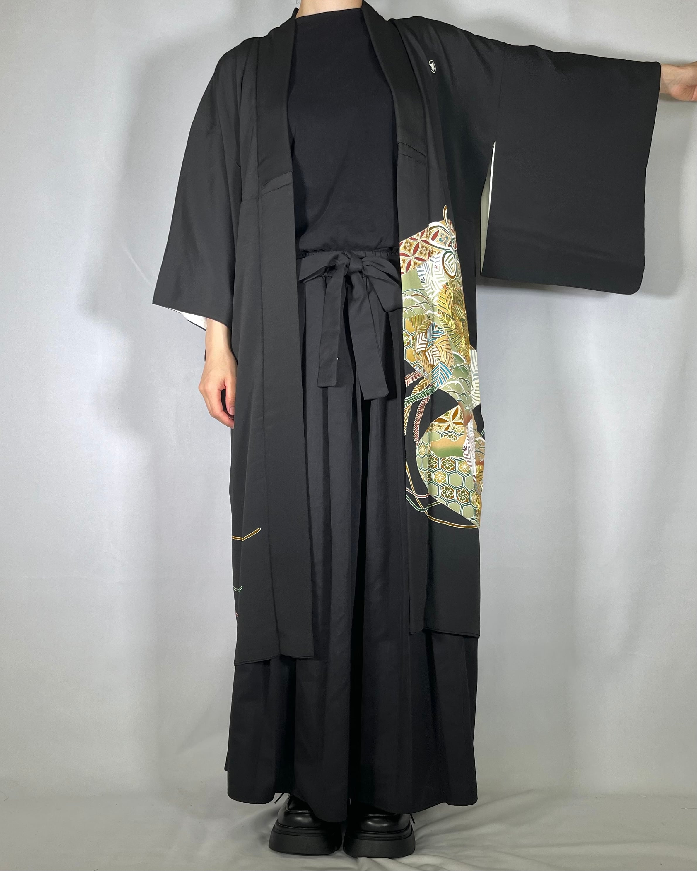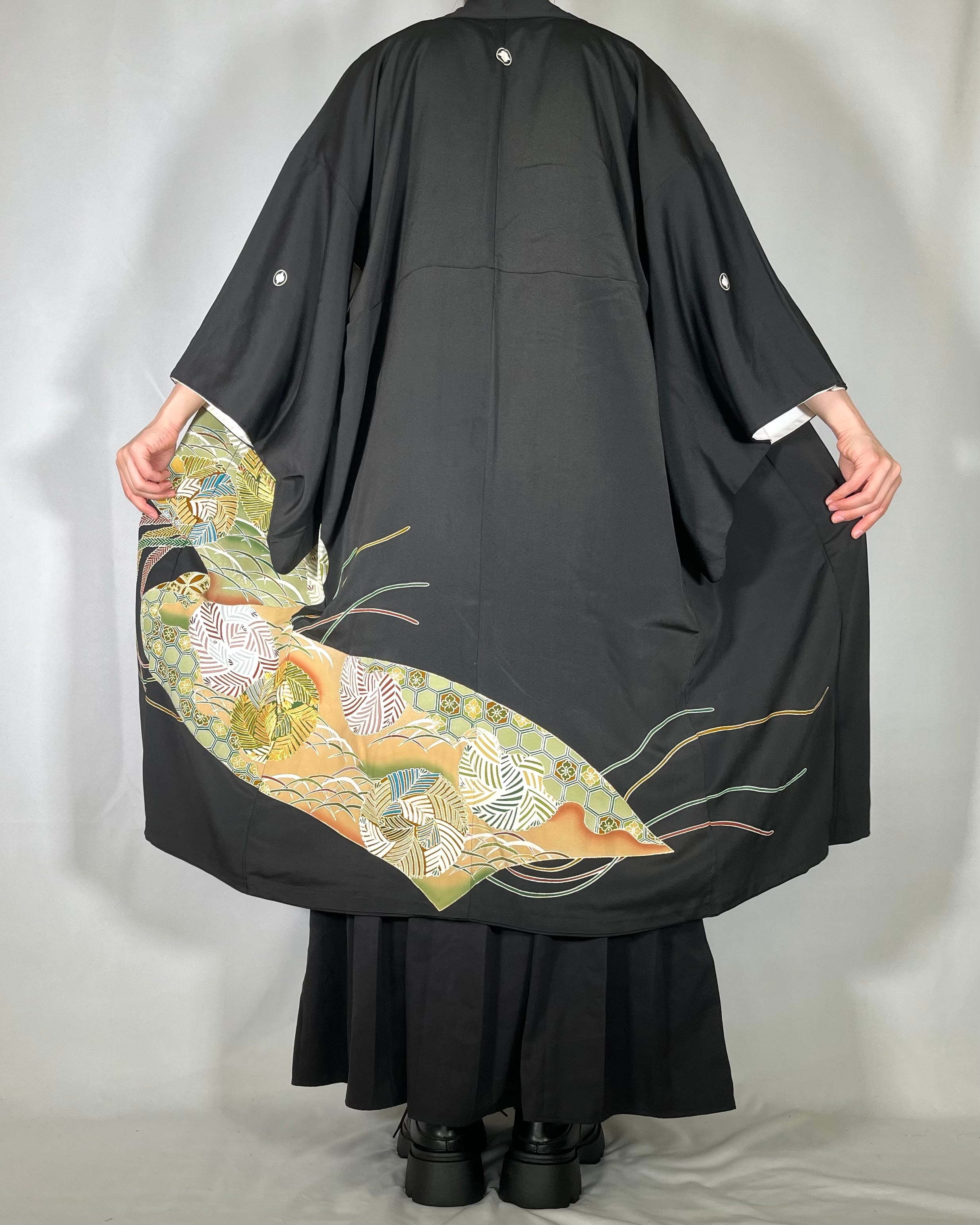 ヴィンテージの着物(黒留袖)をリメイクした世界に一点だけのロングコート。