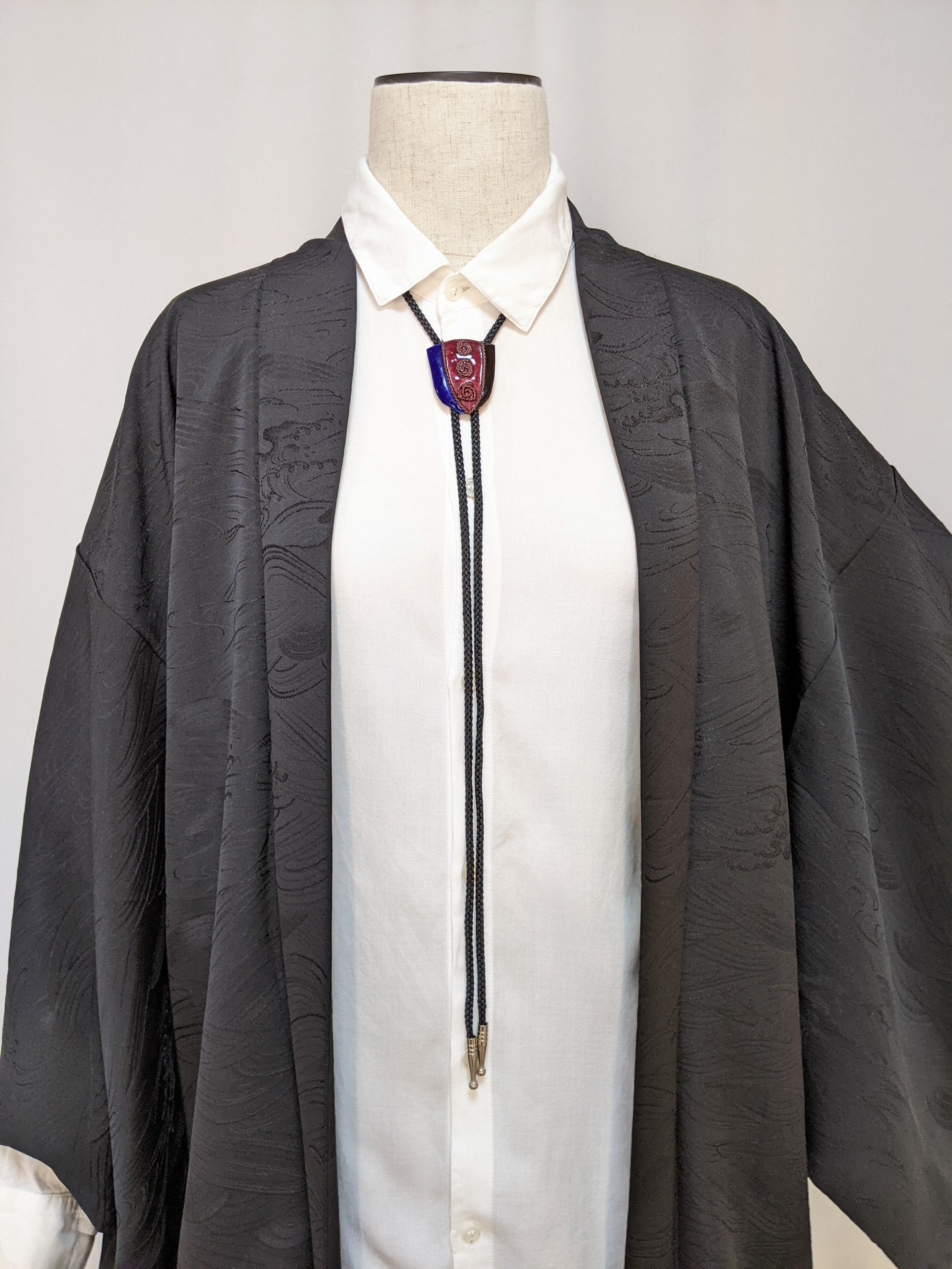 This antique necktie adds a touch of elegance to both traditional Japanese haori and modern attire.